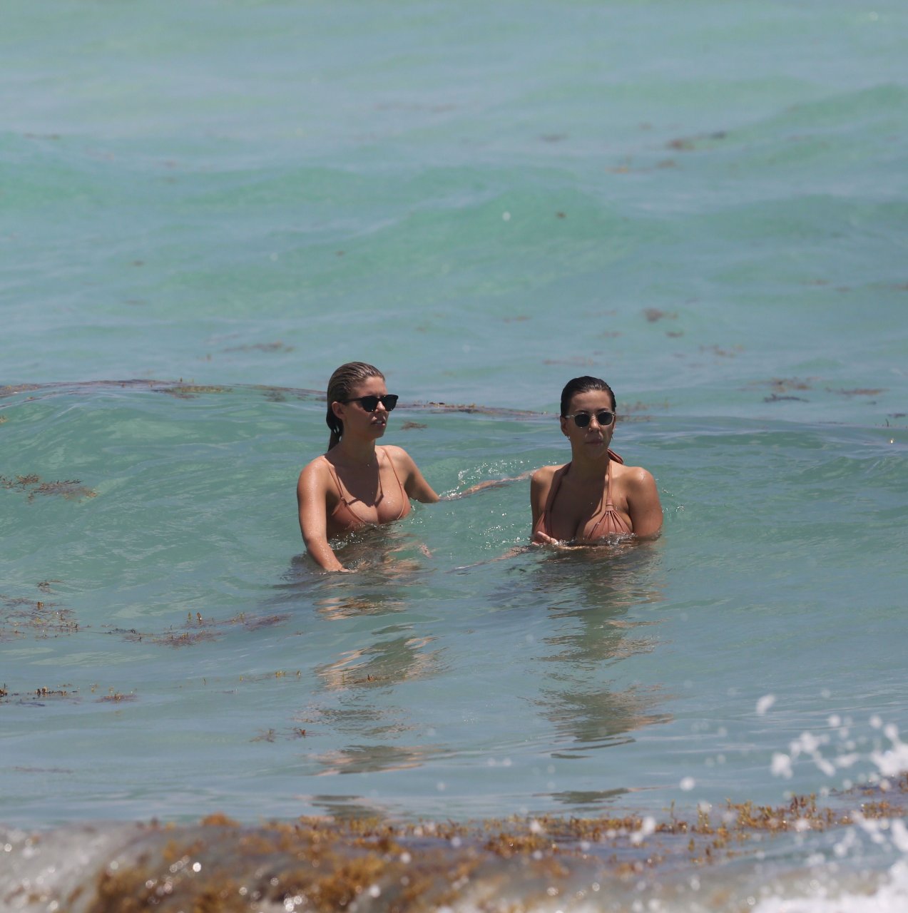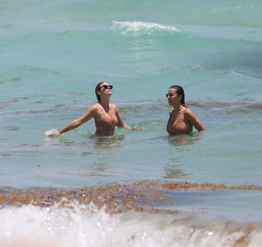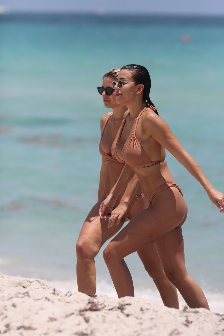 Modelos voluptuosas y atractivas Natasha Oakley y Devin Brugman disfrutan un día en bikinis color nude en la playa de Miami, 04/05/2017.