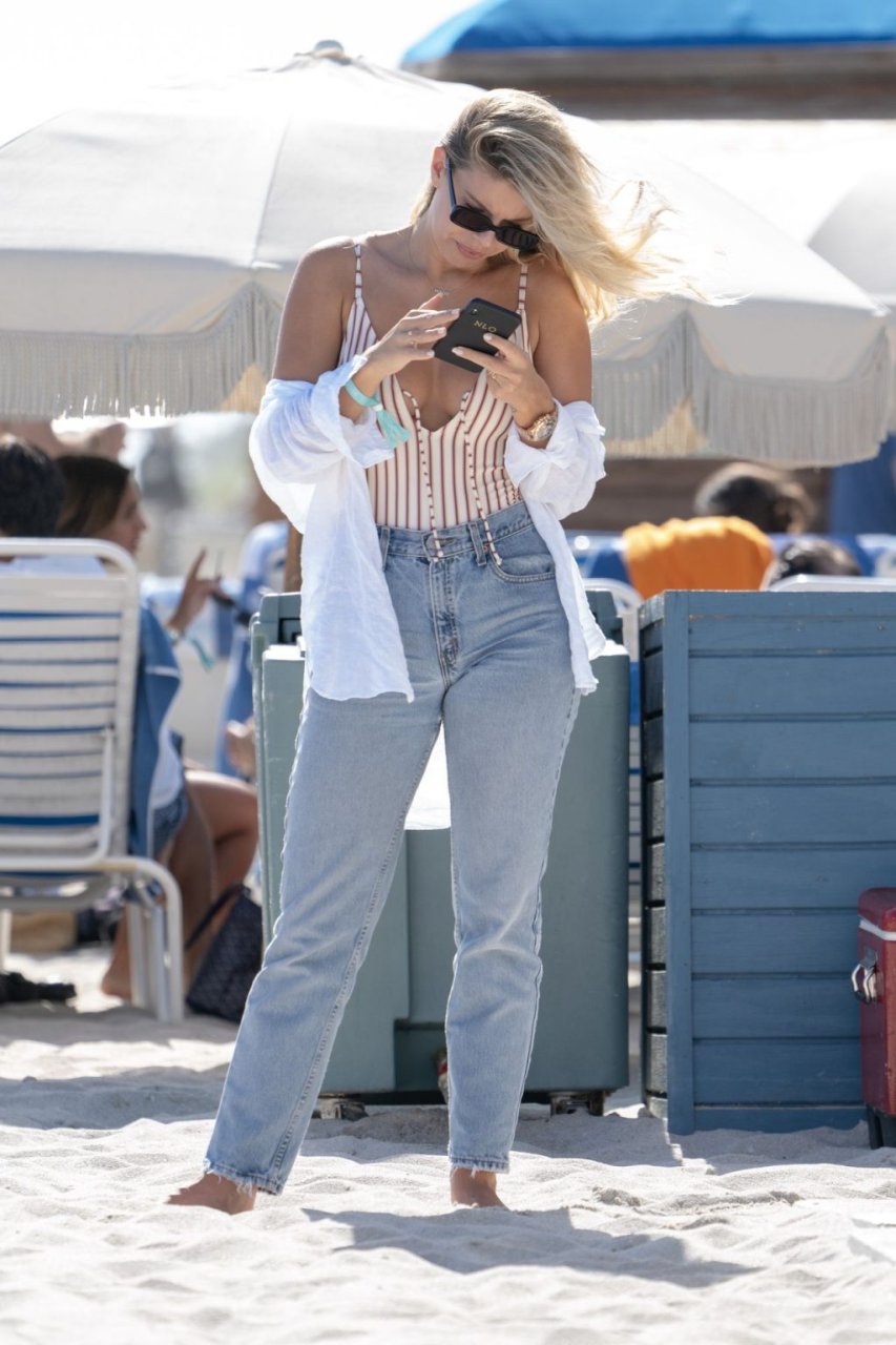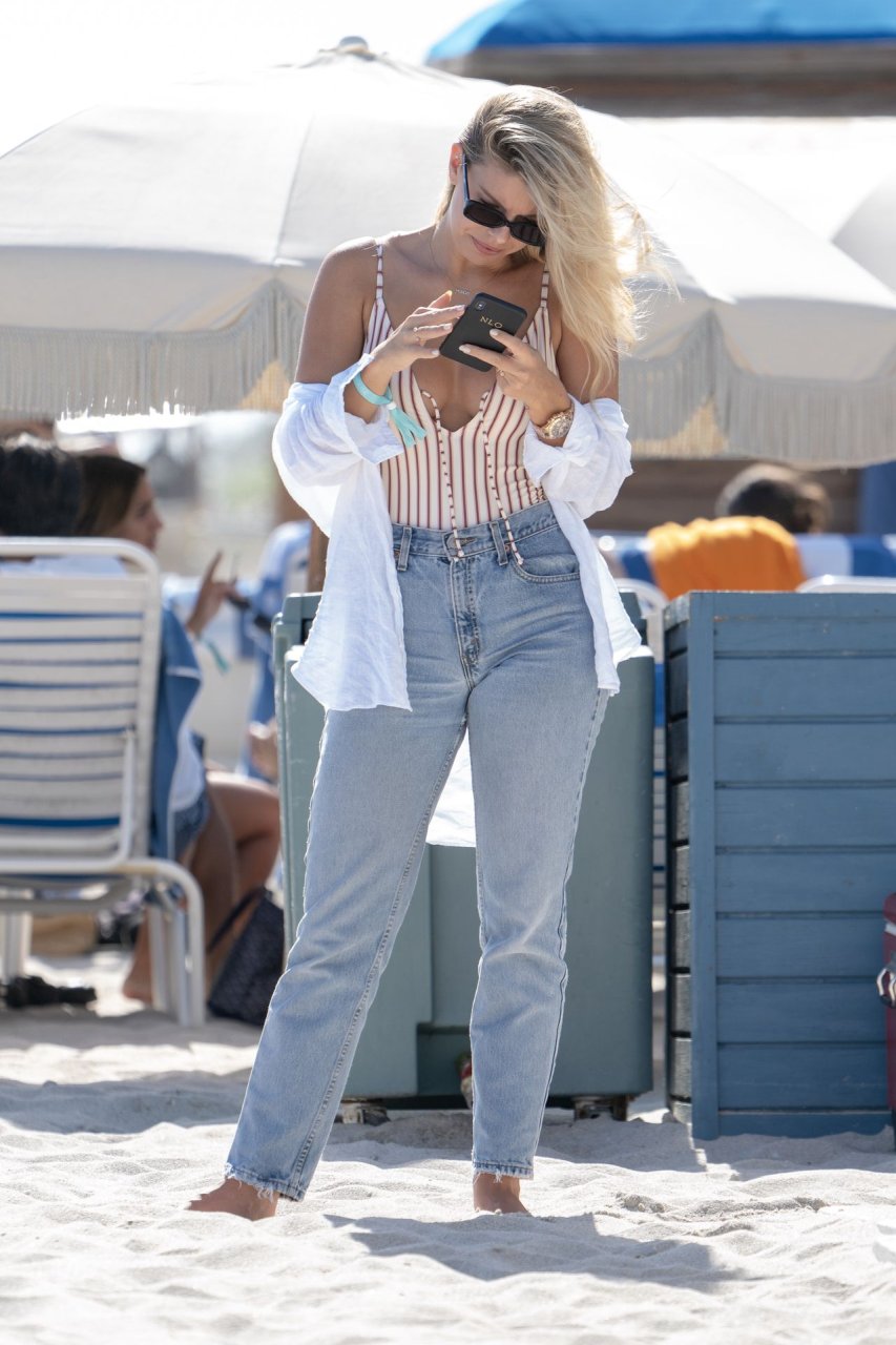 Model Natasha Oakley (28) muestra su escote con un traje de baño a rayas mientras disfruta de un día en la playa en Miami, 12/08/2018.