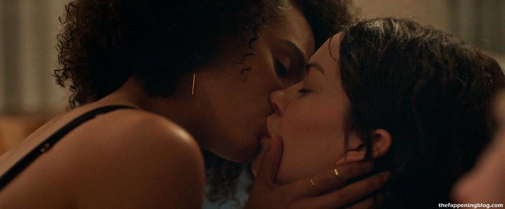 Then Nathalie Emmanuel and Britt Lower are making out as a guy watches. The girls join him on a bed for a threesome, both of them undressing to lingerie. The girls then kiss some more, and Britt kisses Nathalie’s cleavage before they lay down on either side of the guy.