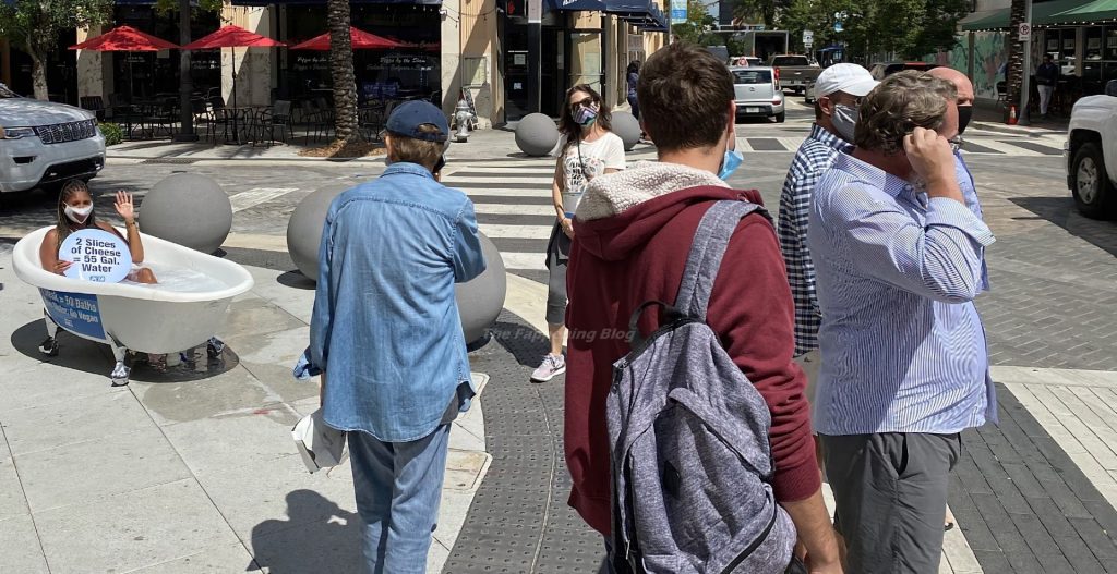 Una modelo casi desnuda toma un baño de burbujas en una calle concurrida de EE.UU. para conmemorar el Día Mundial del Agua.