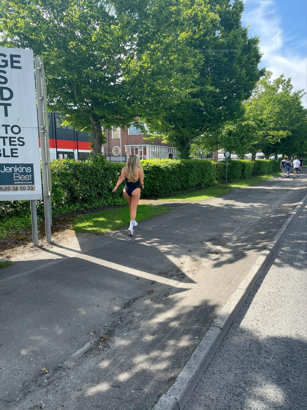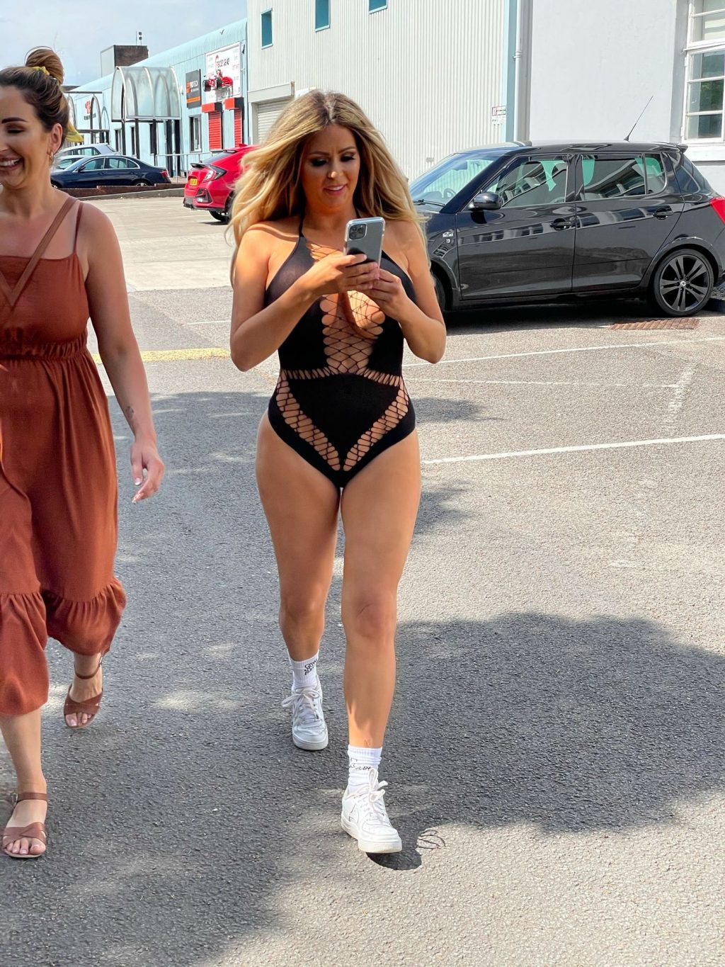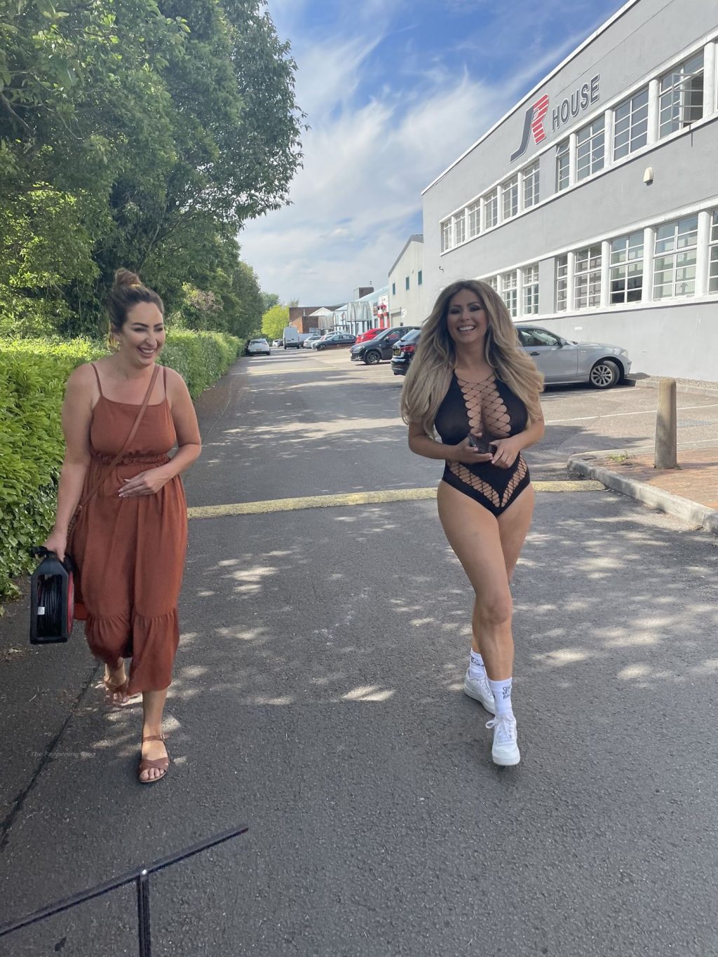 Reality TV star Nicola McLean laughs as she walks between studios wearing a sexy Ann Summers bodysuit on the hottest day of the year (June 2021).