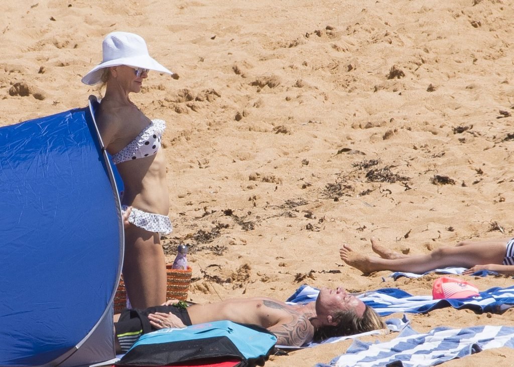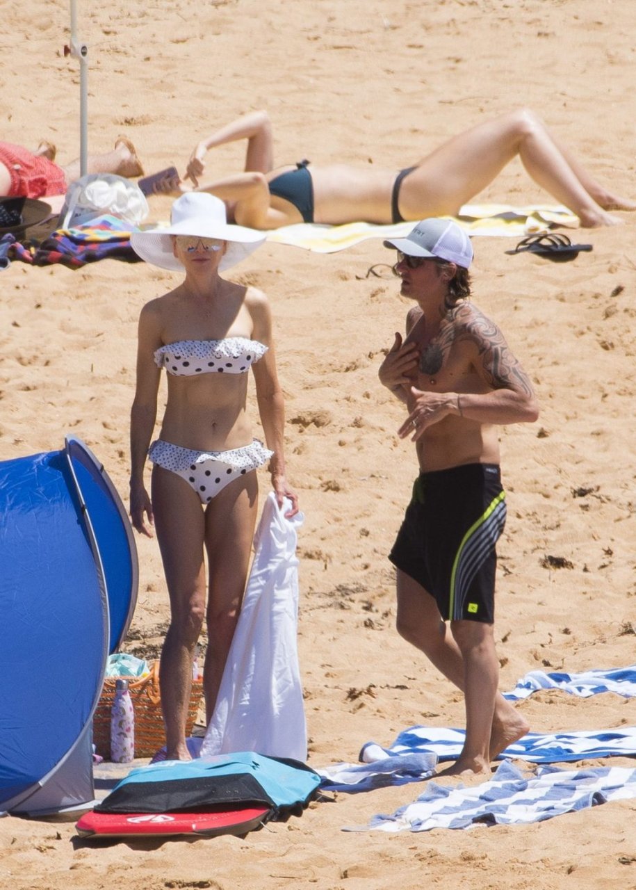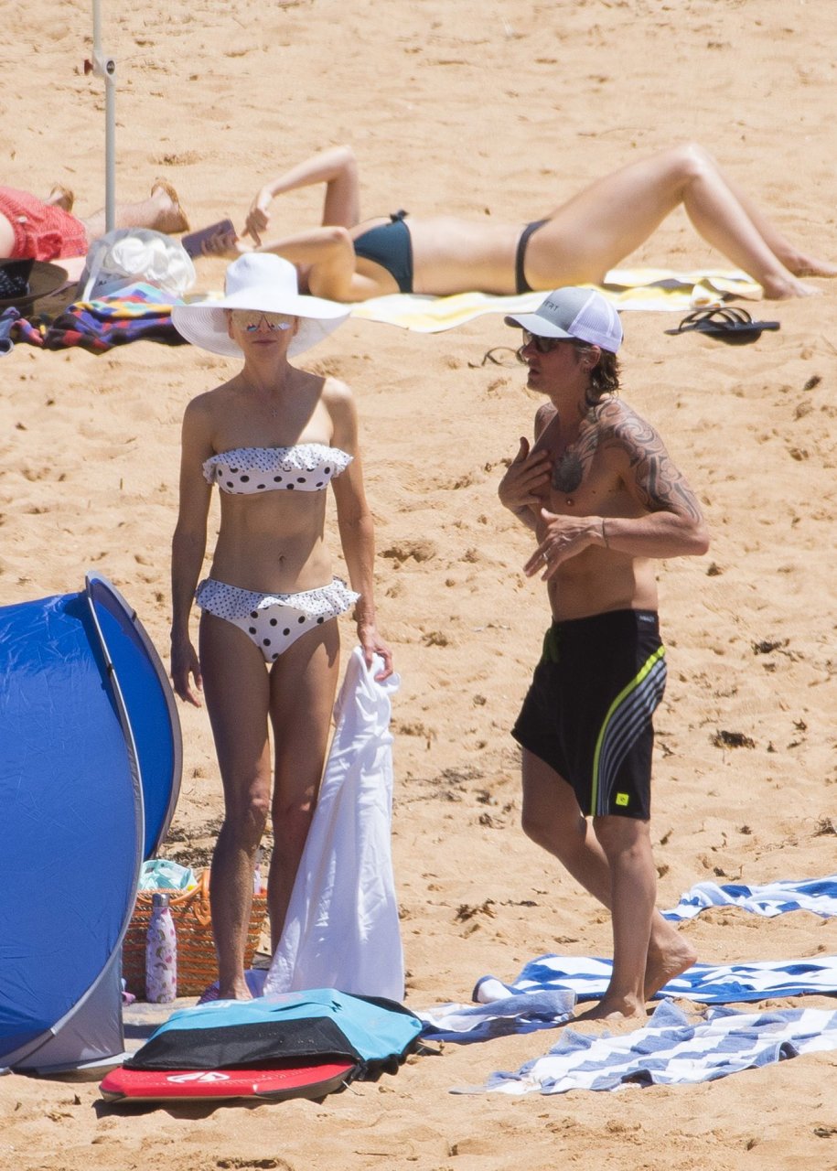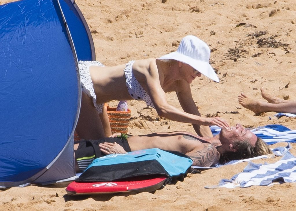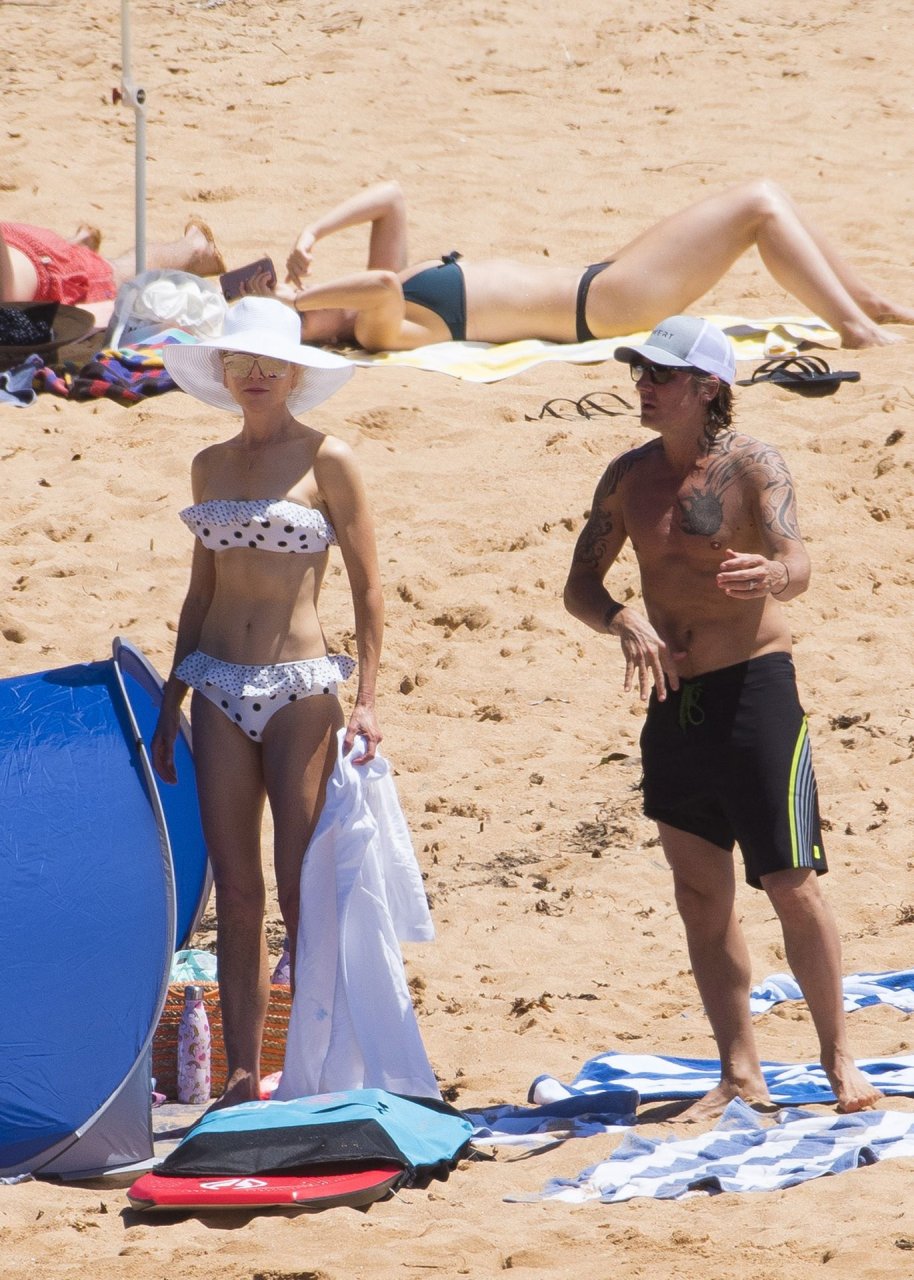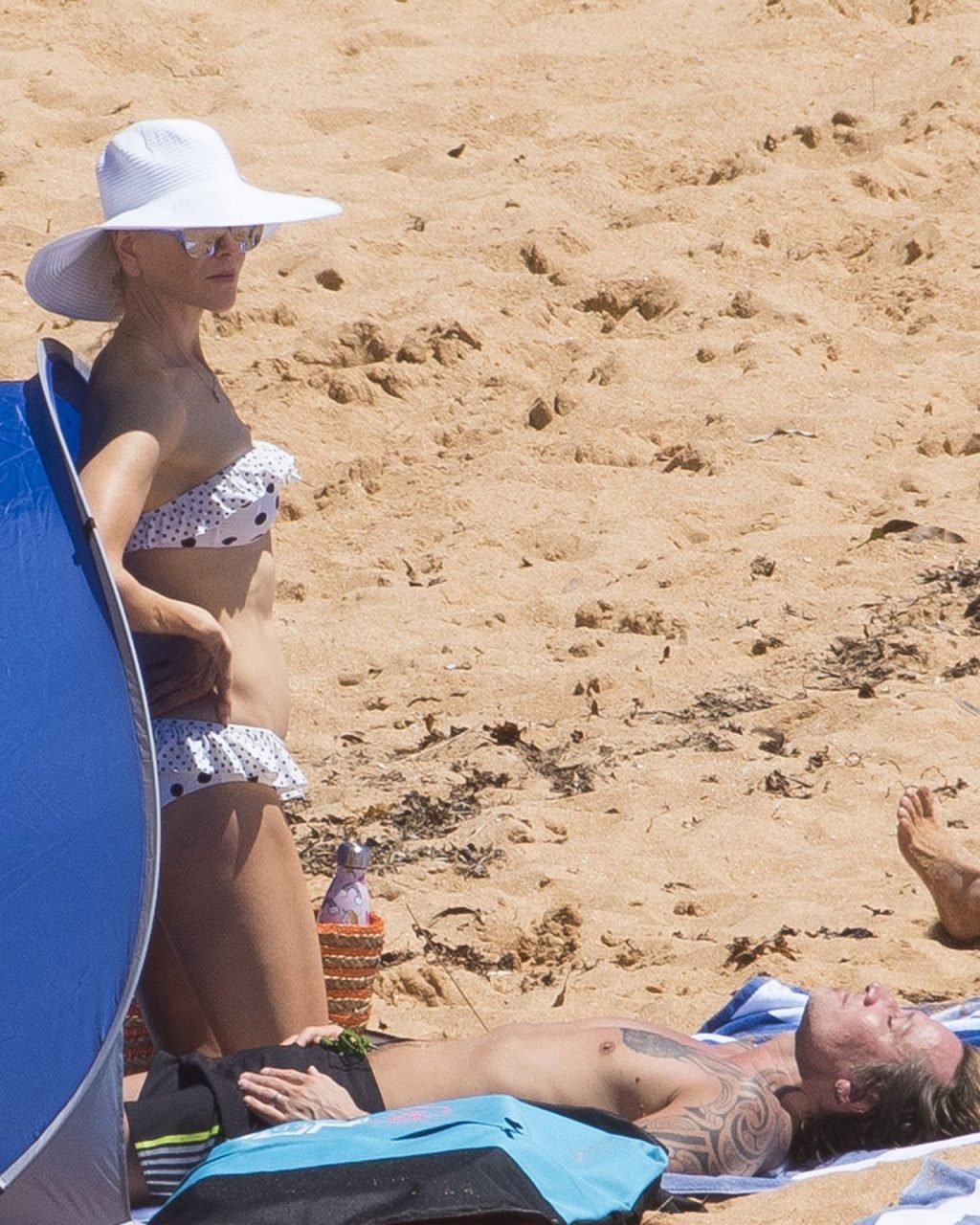 La actriz Nicole Kidman (51) fue fotografiada en un momento poco común vistiendo un bikini blanco con lunares durante la víspera de Navidad en Palm Beach, Sídney, Australia, con su esposo Keith Urban, 24/12/2018.