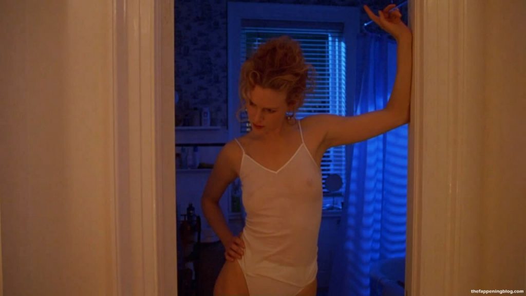 Nicole Kidman está desnuda frente a un espejo, su trasero desnudo visible desde atrás y sus pechos visibles en el reflejo mientras mueve un poco las caderas mientras se pone un par de pendientes. Luego un hombre se acerca a ella y la toma en sus brazos para besarla.