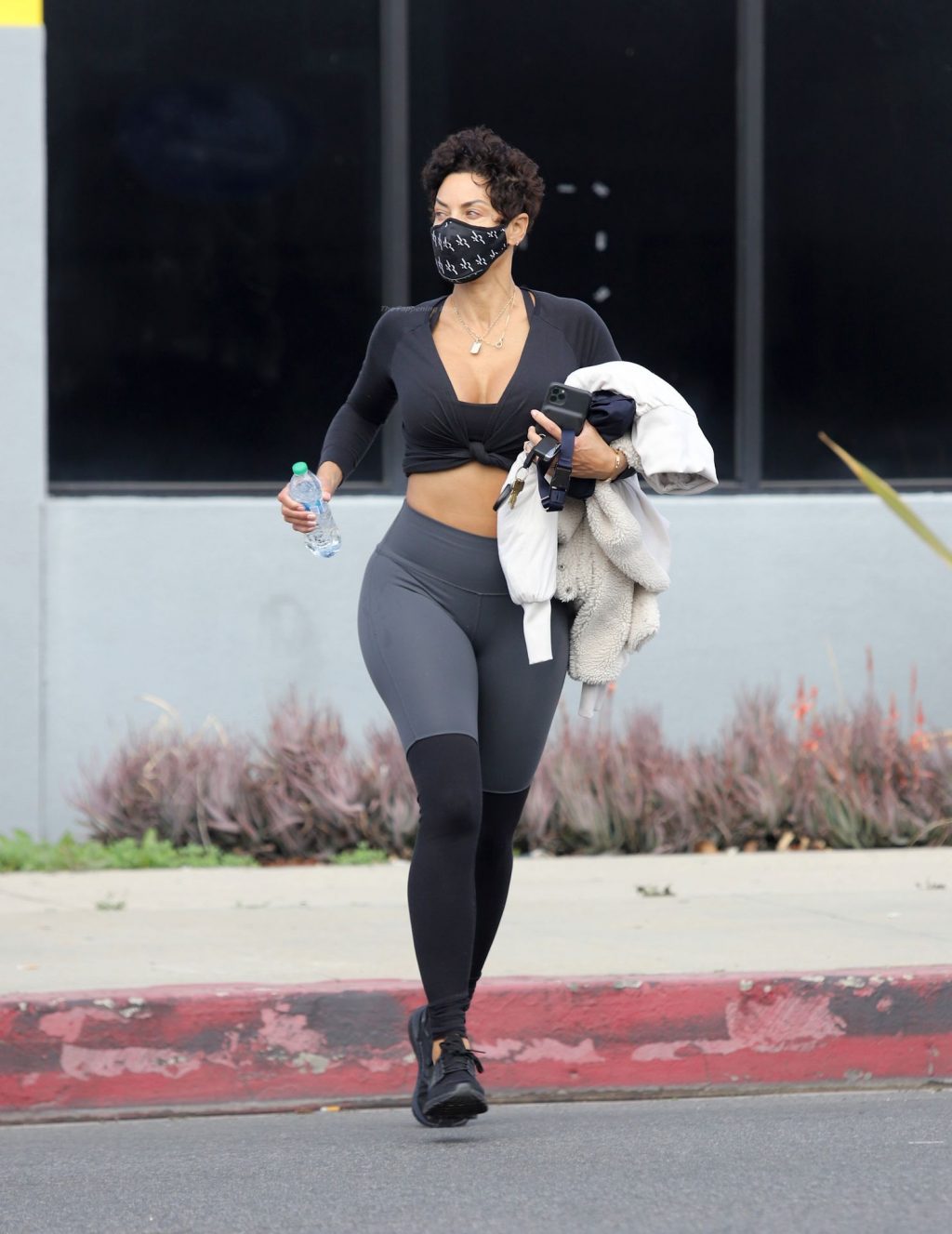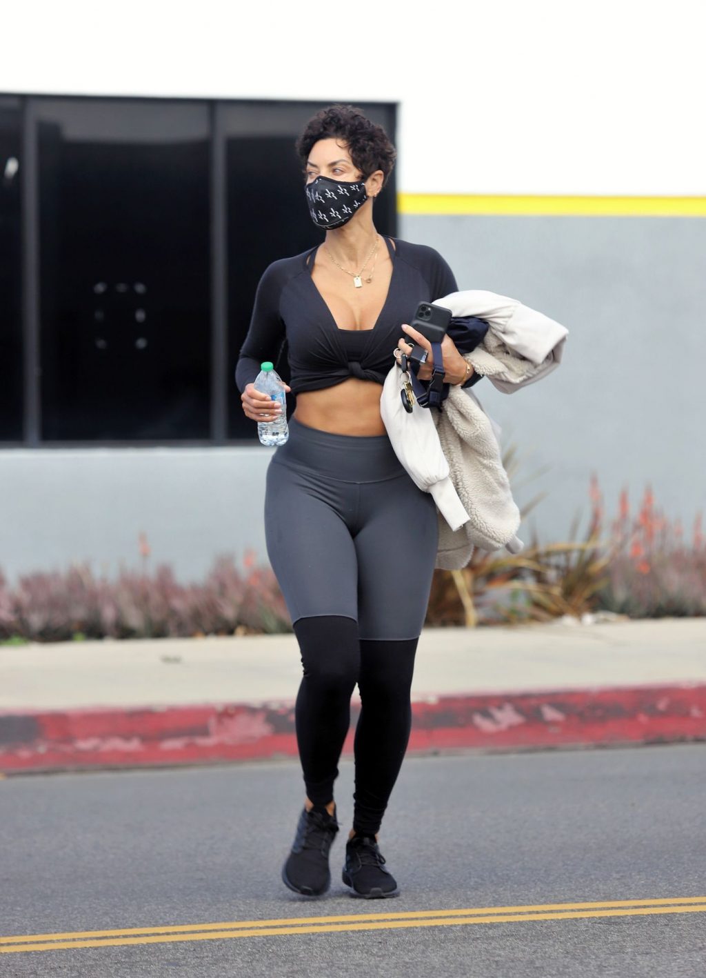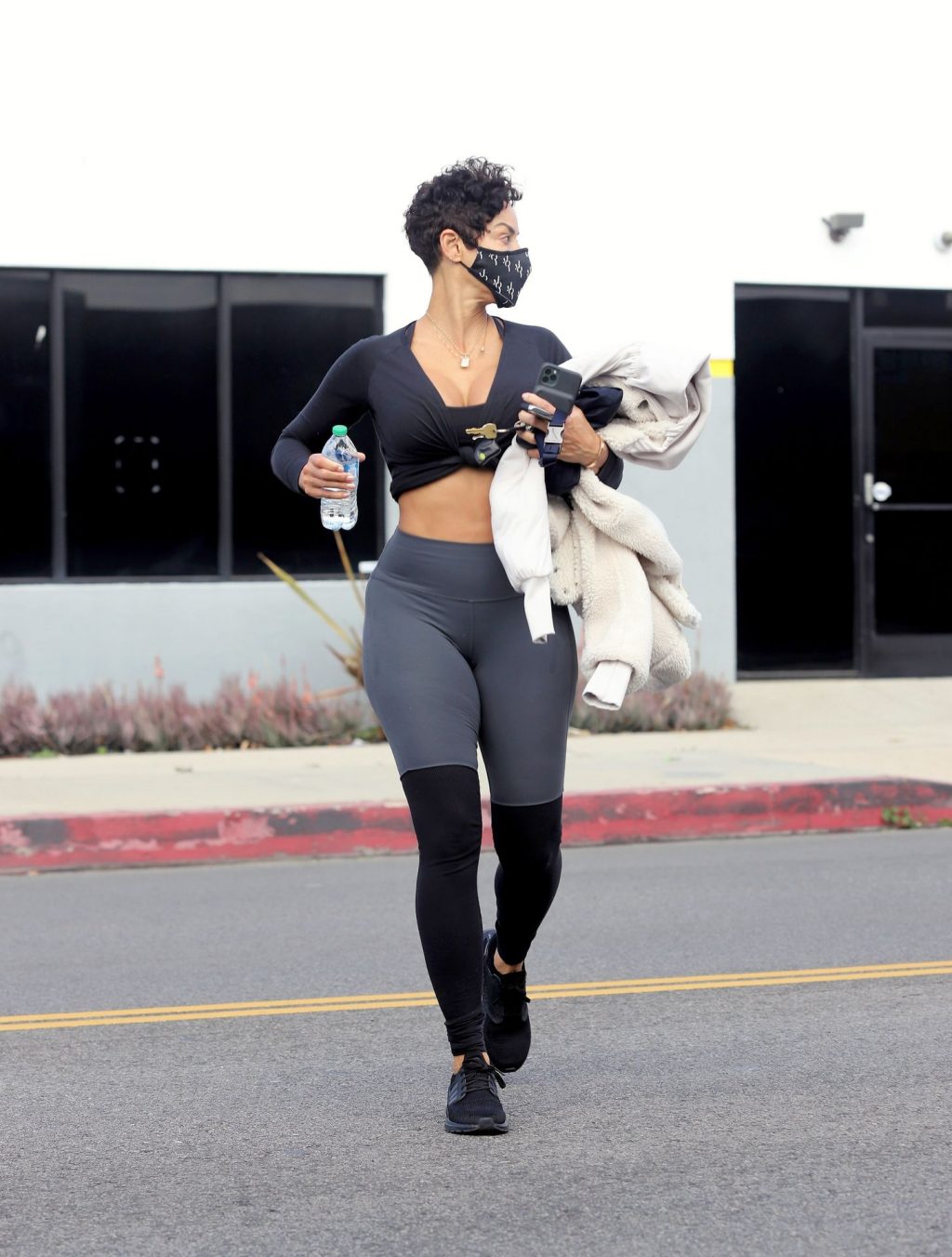 Nicole Murphy es vista saliendo de un gimnasio en Los Ángeles, 18/03/2021. La modelo de 53 años llevaba una mascarilla, top corto, leggings grises y zapatillas negras.