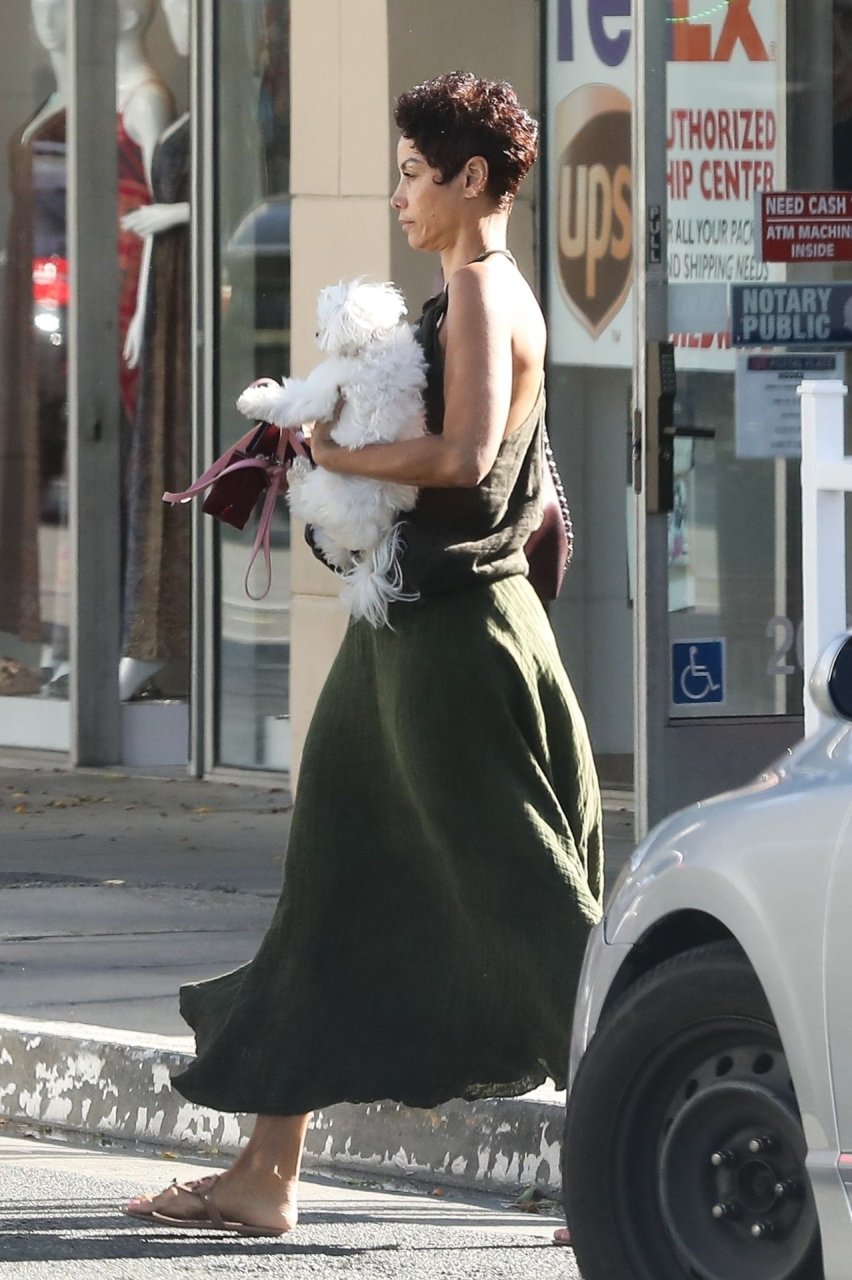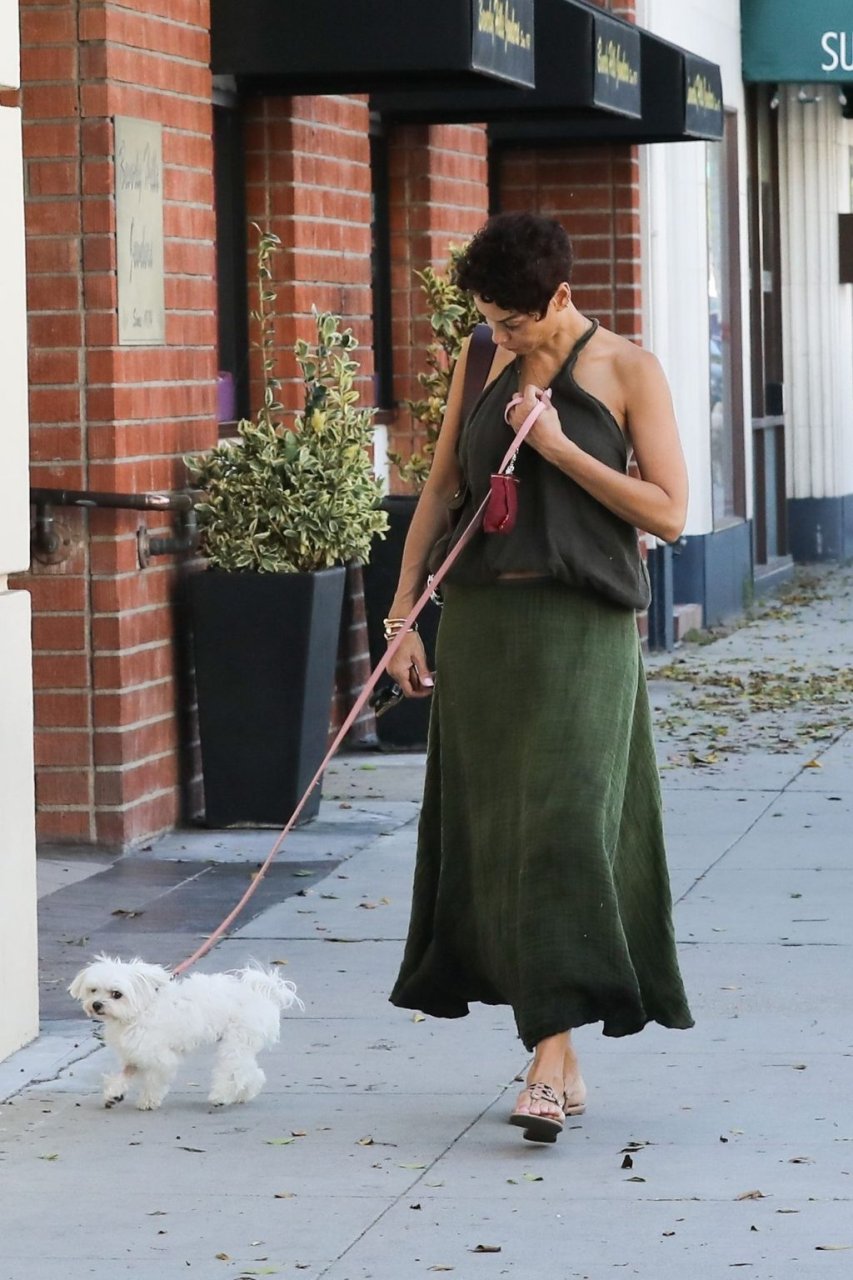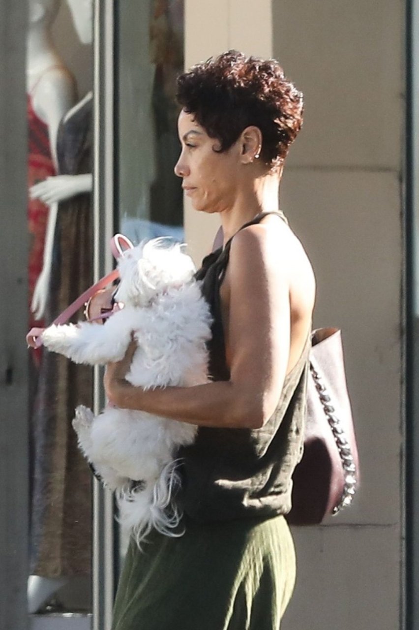 Nicole Murphy muestra una figura muy voluptuosa mientras lleva a su cachorro con ella a almorzar en Urth Caffe en Beverly Hills, 09/04/2019. La modelo y personalidad de televisión eterna mostró su fabulosa figura con un top halter verde suelto y escotado y una falda.