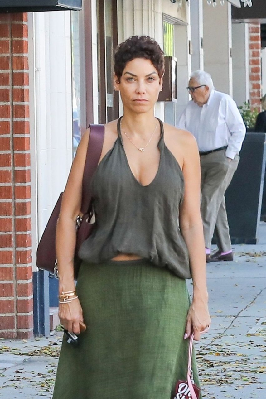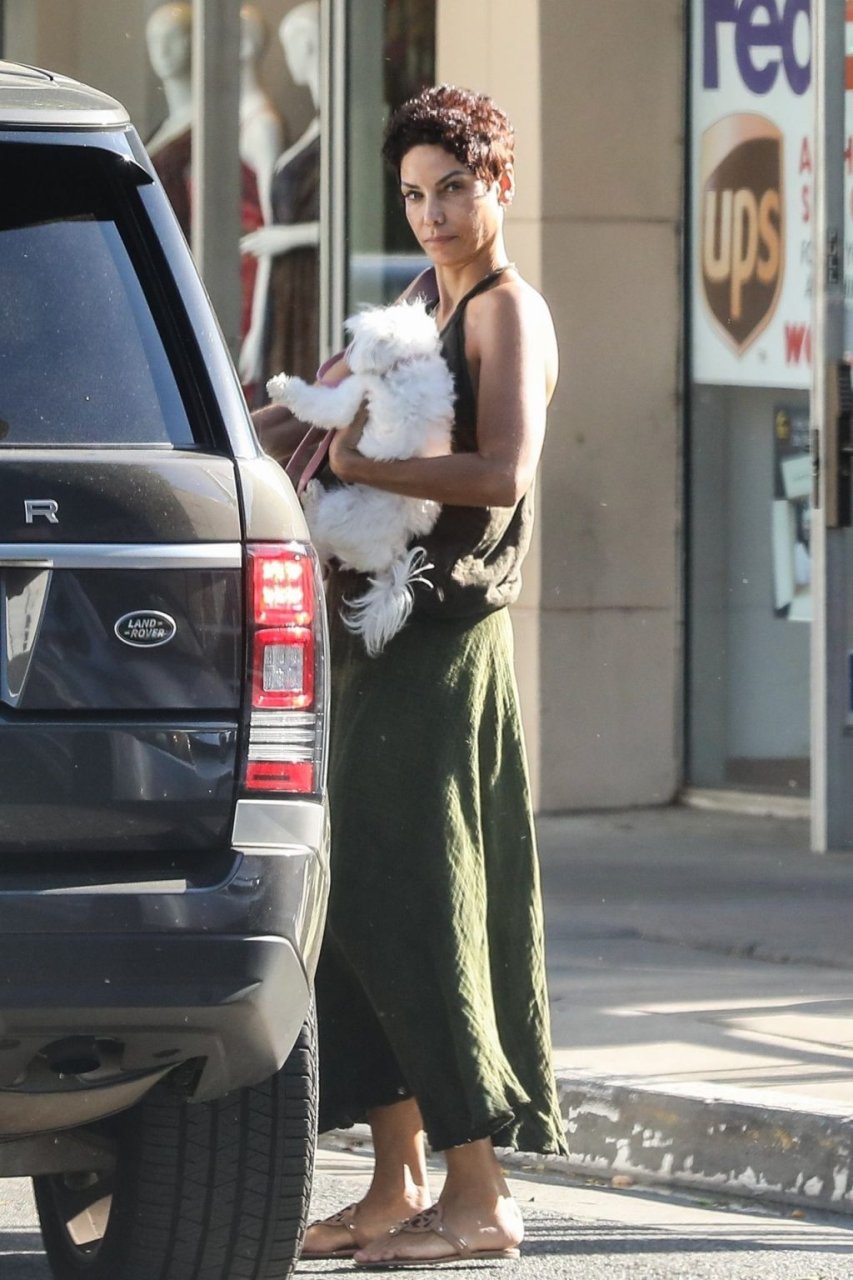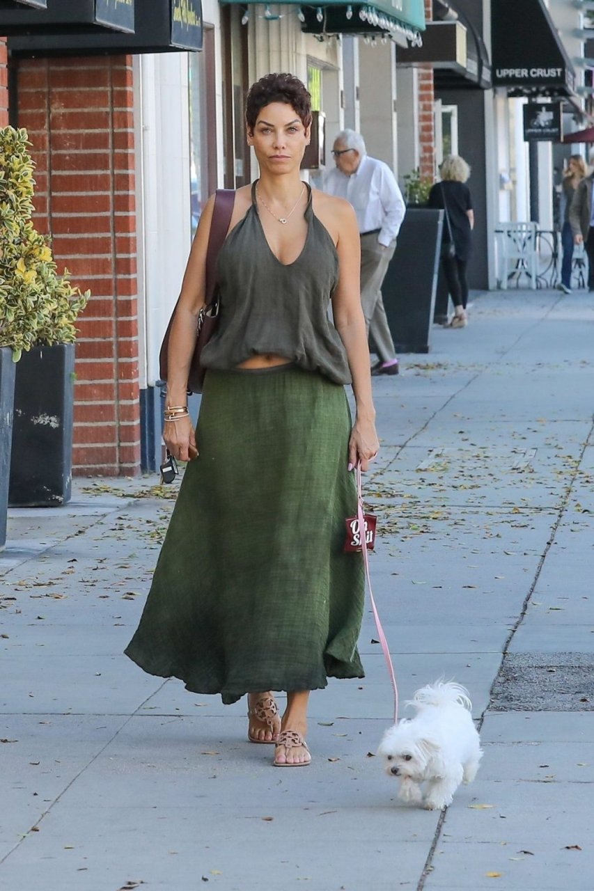 Nicole Murphy muestra una figura muy voluptuosa mientras lleva a su cachorro con ella a almorzar en Urth Caffe en Beverly Hills, 09/04/2019. La modelo y personalidad de televisión eterna mostró su fabulosa figura con un top halter verde suelto y escotado y una falda.