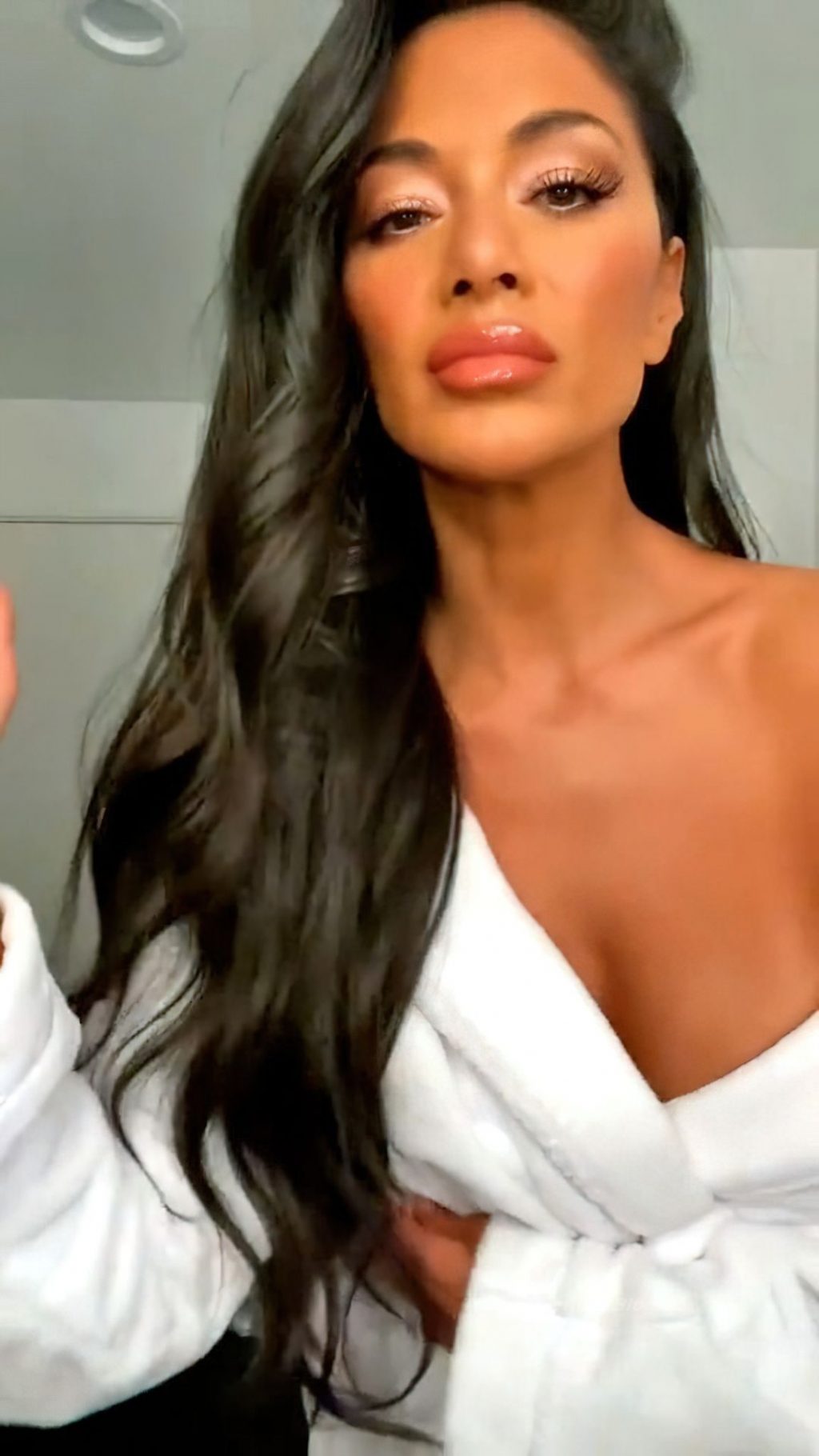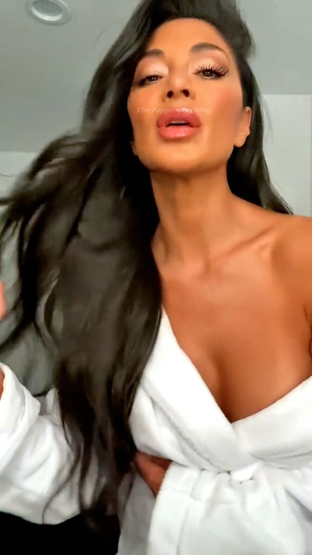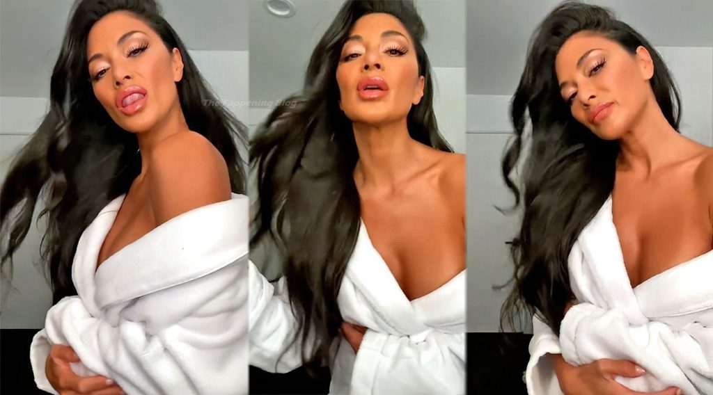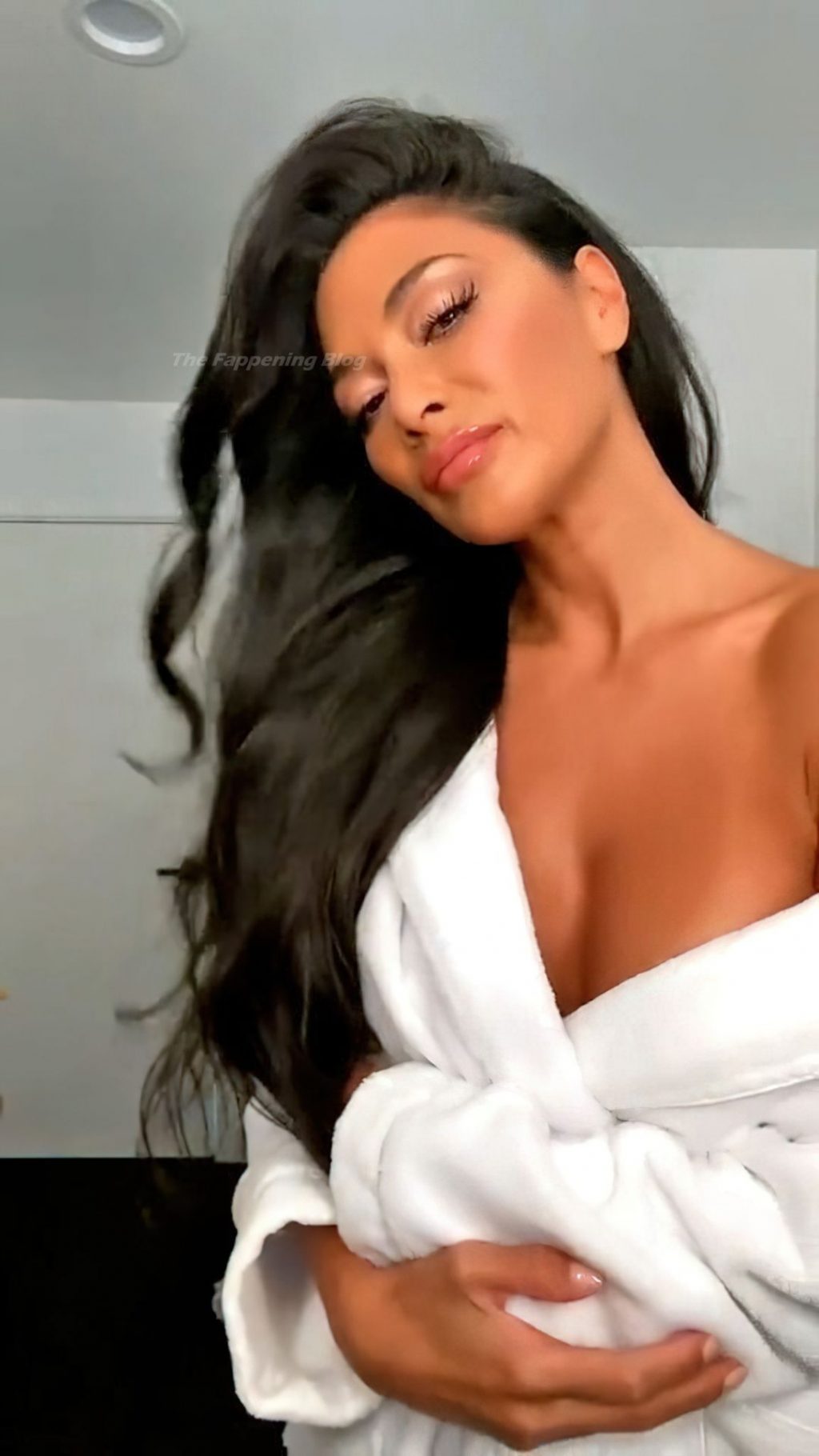 La estrella de The Fappening Nicole Scherzinger exhibe su escote posando con una bata blanca abierta en un video sexy para Instagram/TikTok, 02/10/2021.