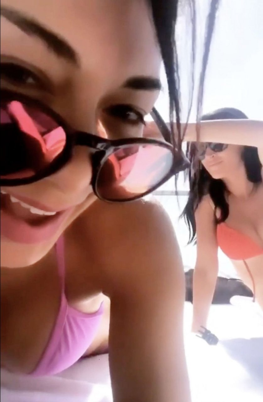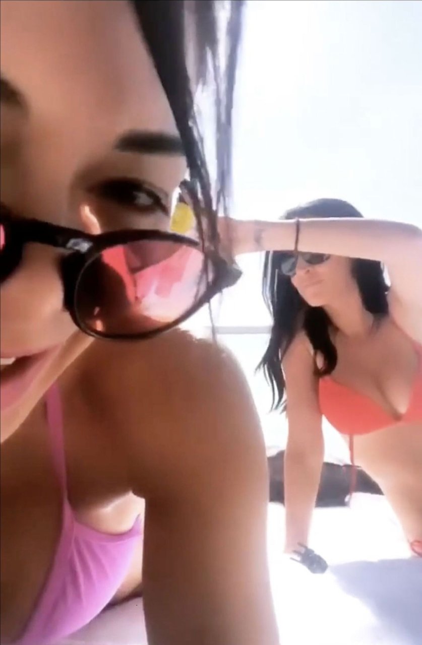 Vestida con su pequeño y escaso bikini rosa que mostraba un montón de escote, la cantante de 40 años sigue desafiando su edad luciendo su físico tan sexy.
