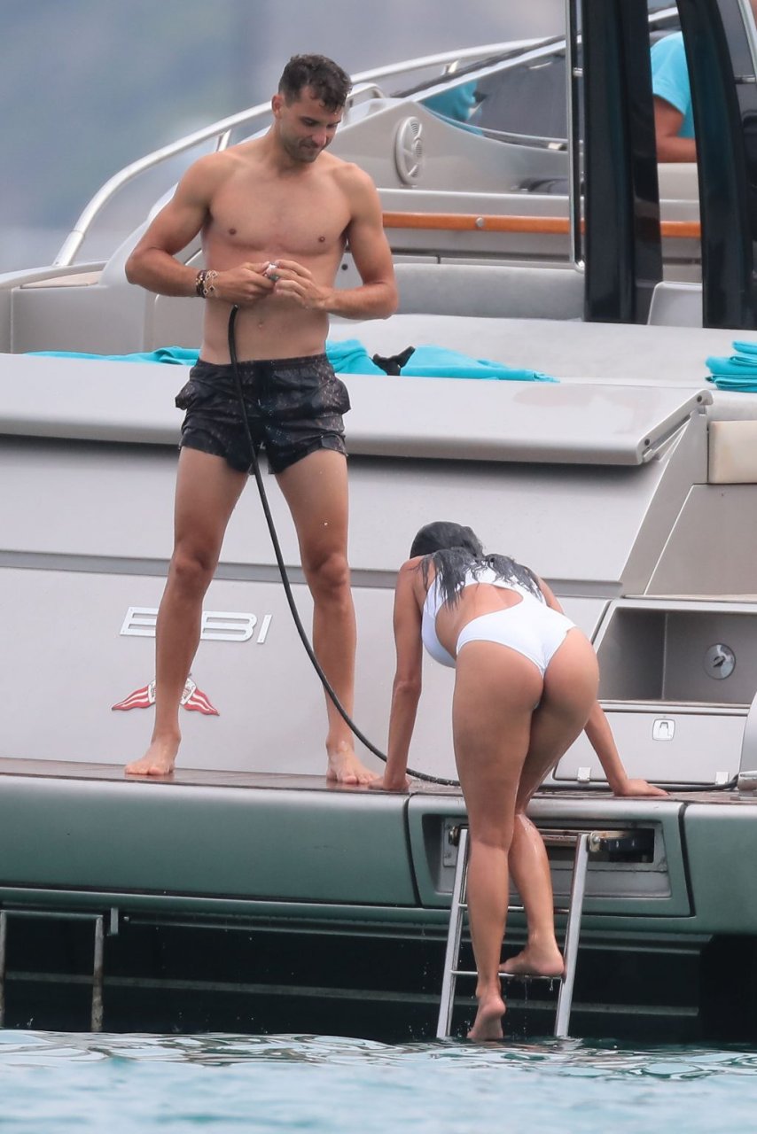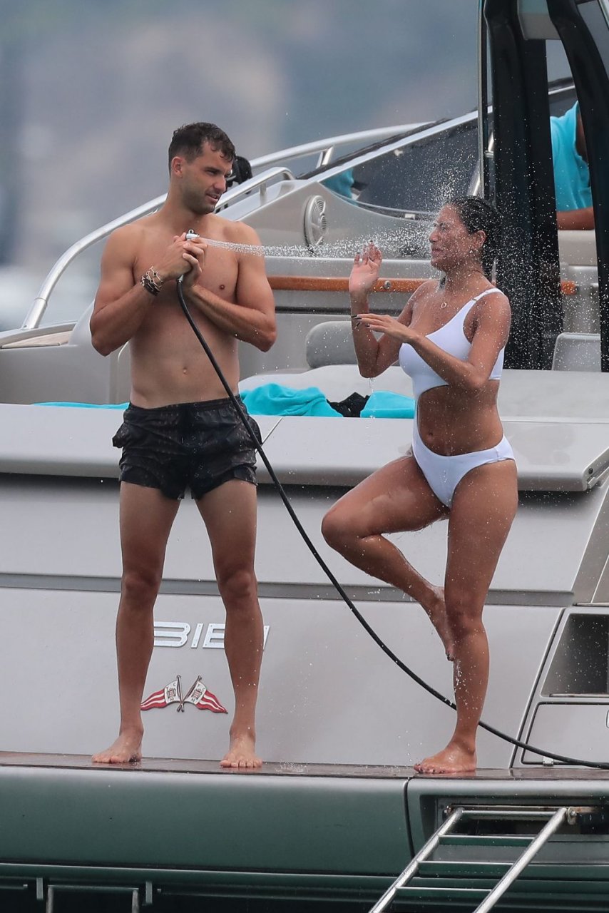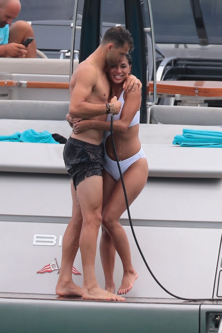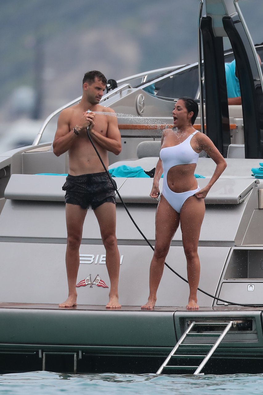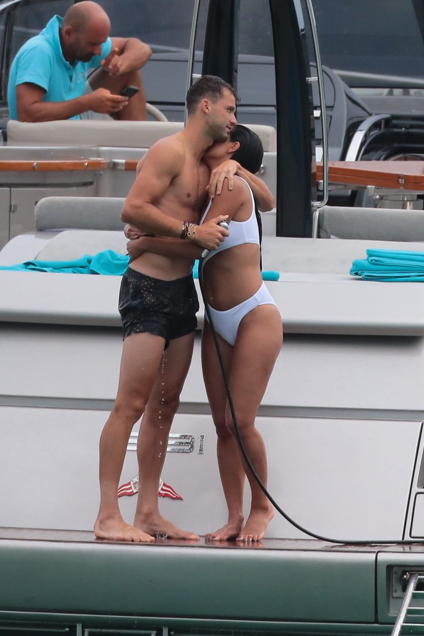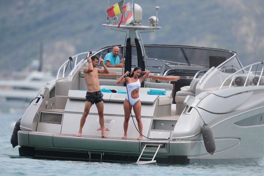 Nicole Scherzinger se ve en el Club 55 en St Tropez, sur de Francia, con su novio, 22/07/2018. La cantante fue vista en bikini en la parte trasera de una lancha rápida de lujo.