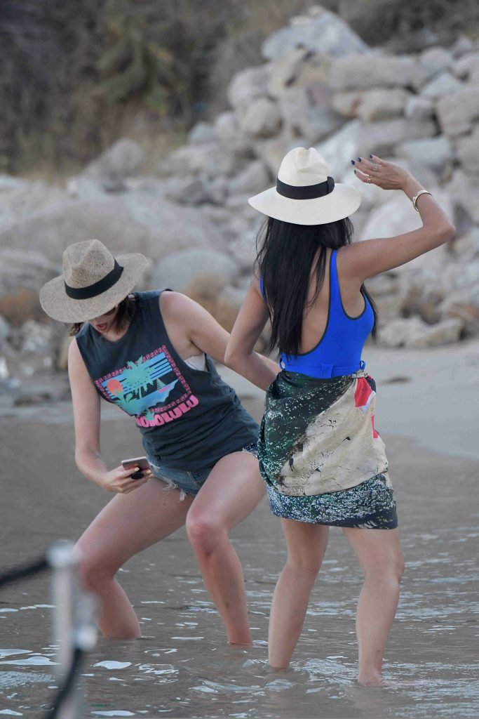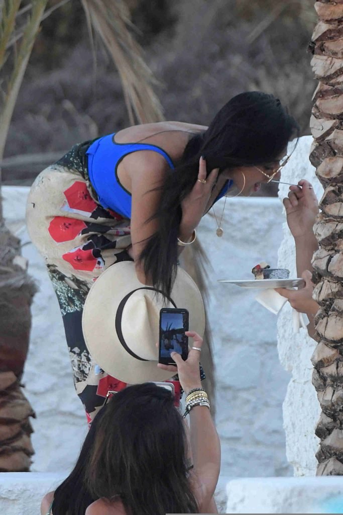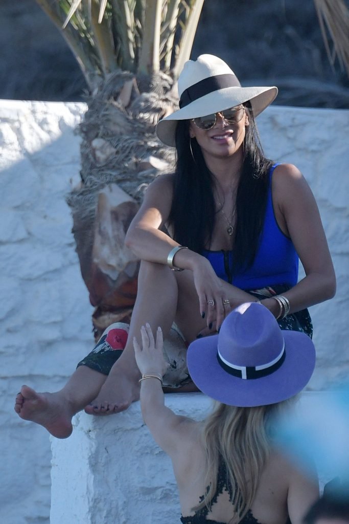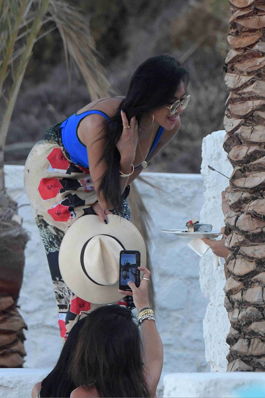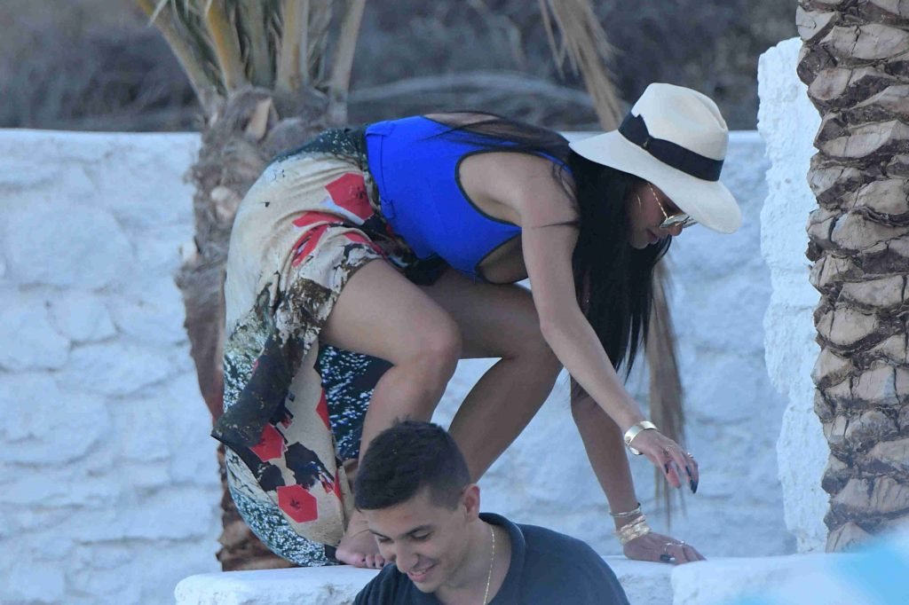 Cantante y ex jueza de X Factor, Nicole Scherzinger, muestra un look sexy y fantástico con un traje de baño azul de una pieza mientras está de vacaciones en la isla de Mykonos, Grecia, 01/07/2018. La cantante de Pussycat Dolls estaba sonriente mientras paseaba por la playa y su amiga tomaba fotografías.