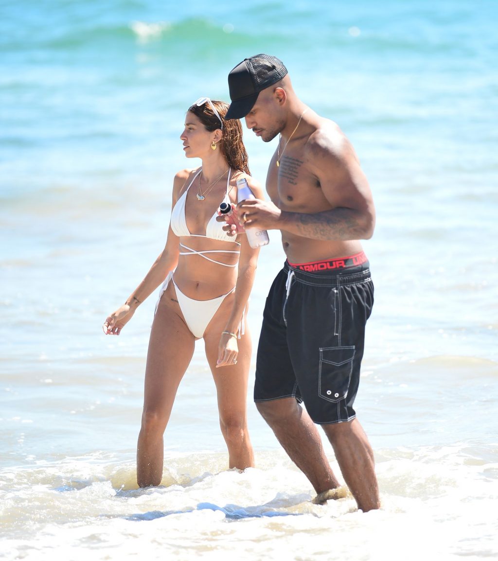 WAGS estrella Nicole Williams deslumbra con un pequeño bikini blanco de su colección Nia Lynn Swim durante un día en Malibu, 19/07/2020.