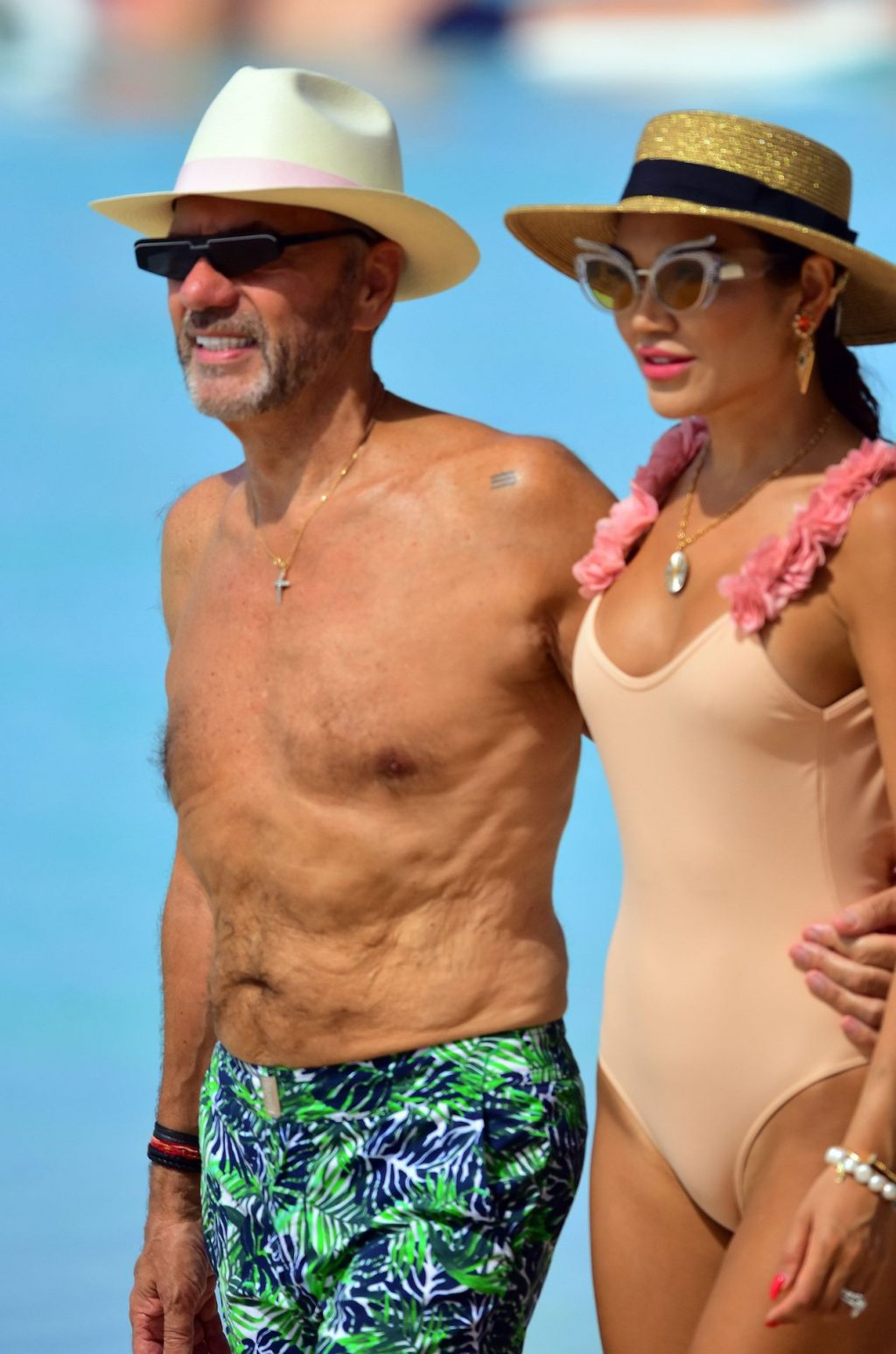 Duncan Bannatyne, 70, y su esposa Nigora, 39, muestran afecto en público y se toman de la mano durante un paseo romántico por la playa en Barbados, 26/12/2019.