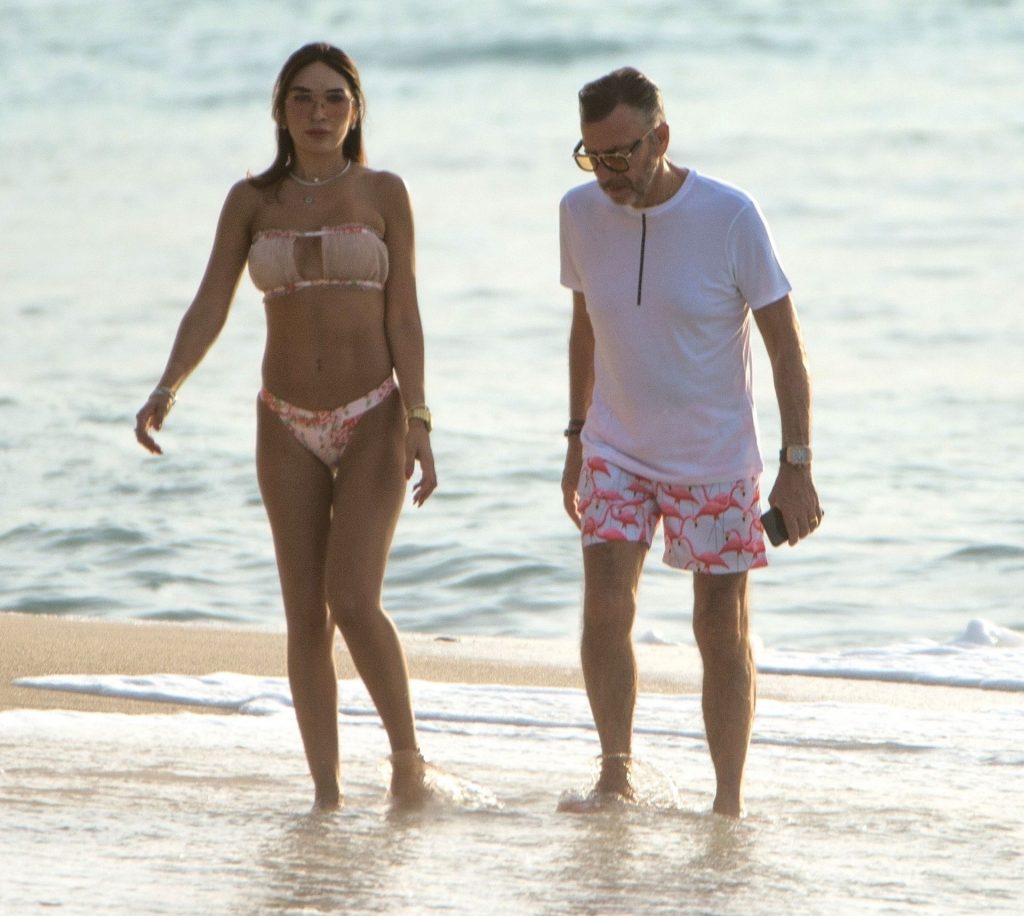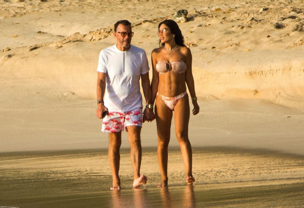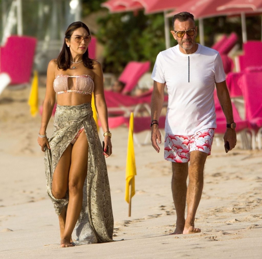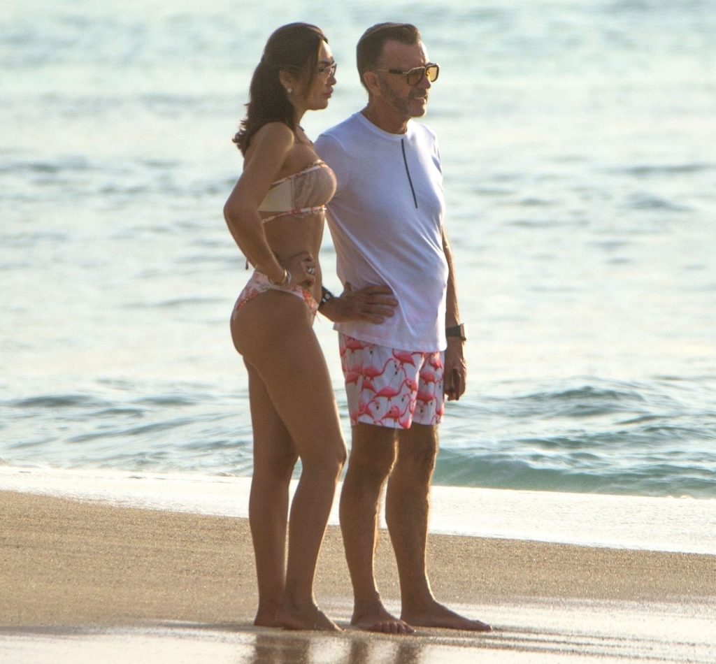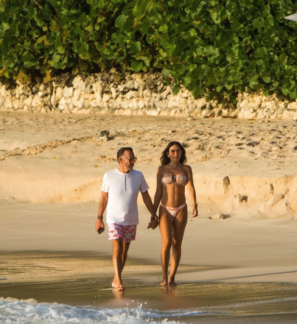 Empresario escocés y exestrella de Dragons Den Duncan Bannatyne fue visto disfrutando de sus vacaciones de invierno bajo el sol caribeño junto a su hermosa esposa Nigora, quien deslumbró con un pequeño y atrevido conjunto de bikini mientras la pareja paseaba por las playas de Barbados, 31/12/2019.