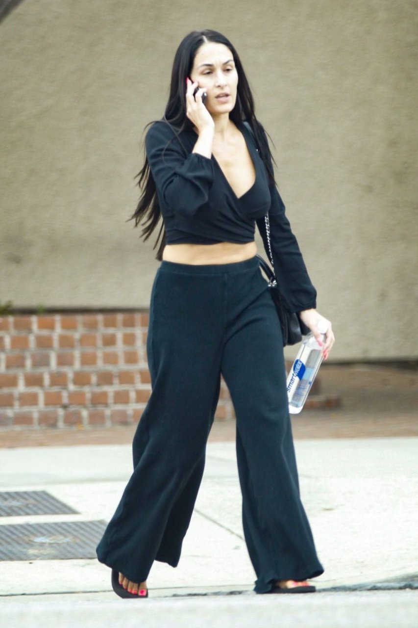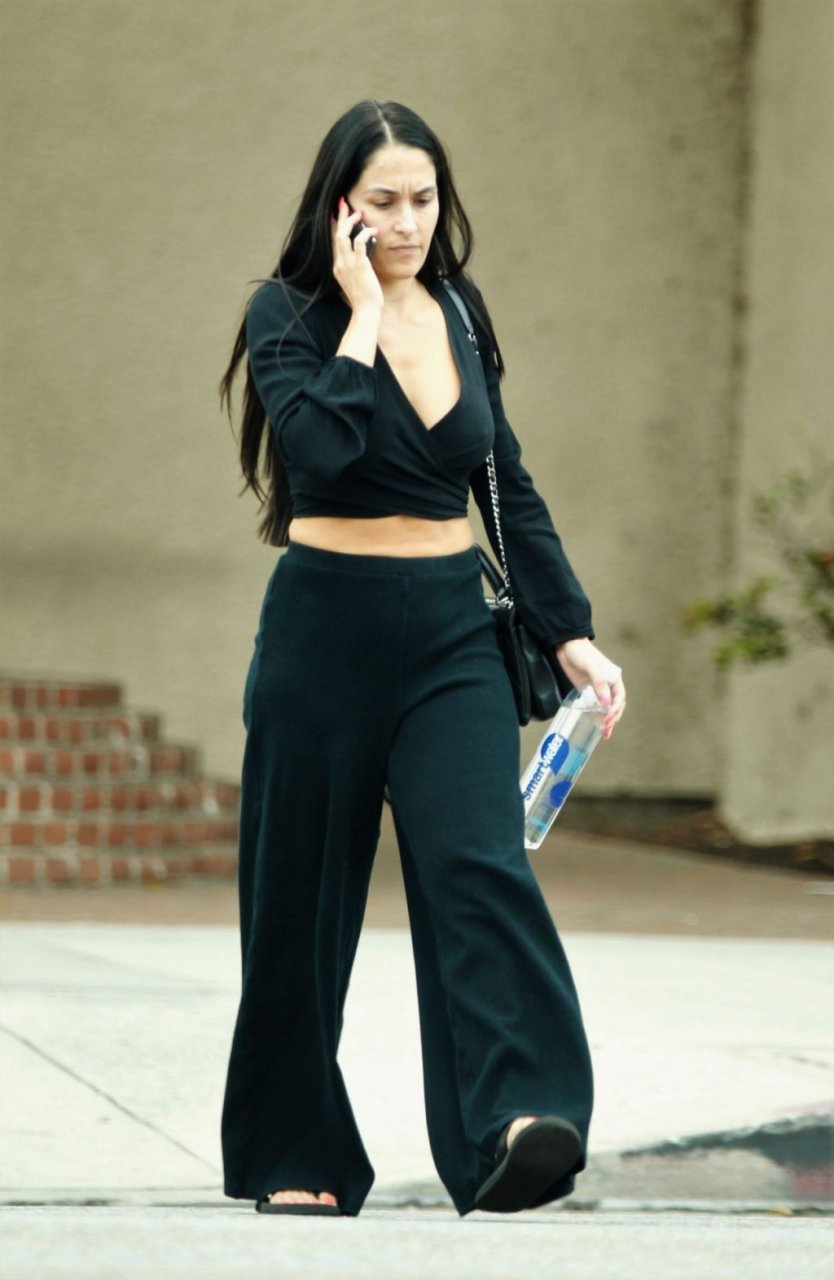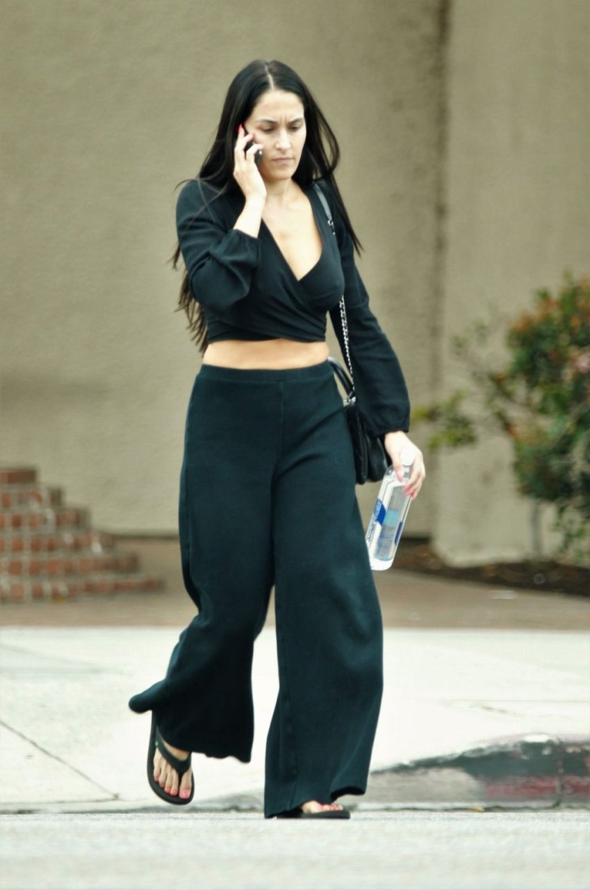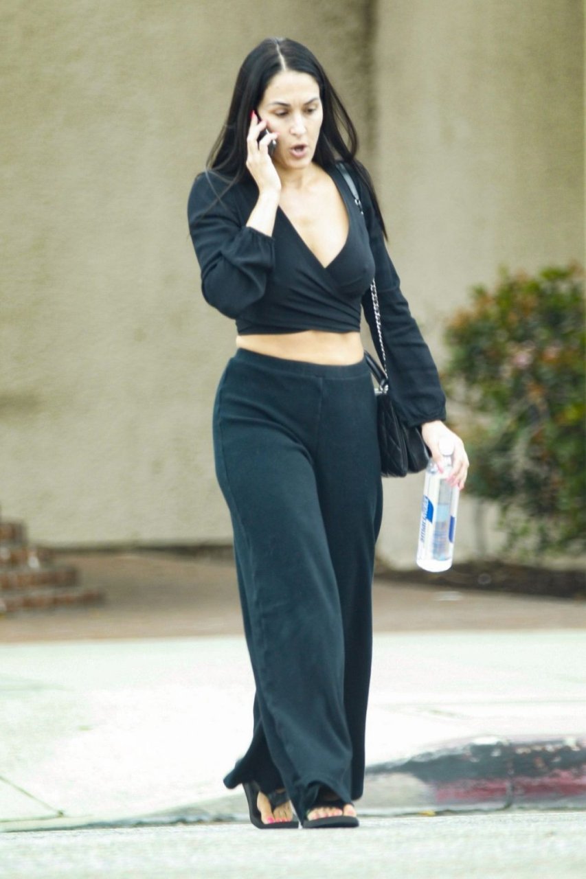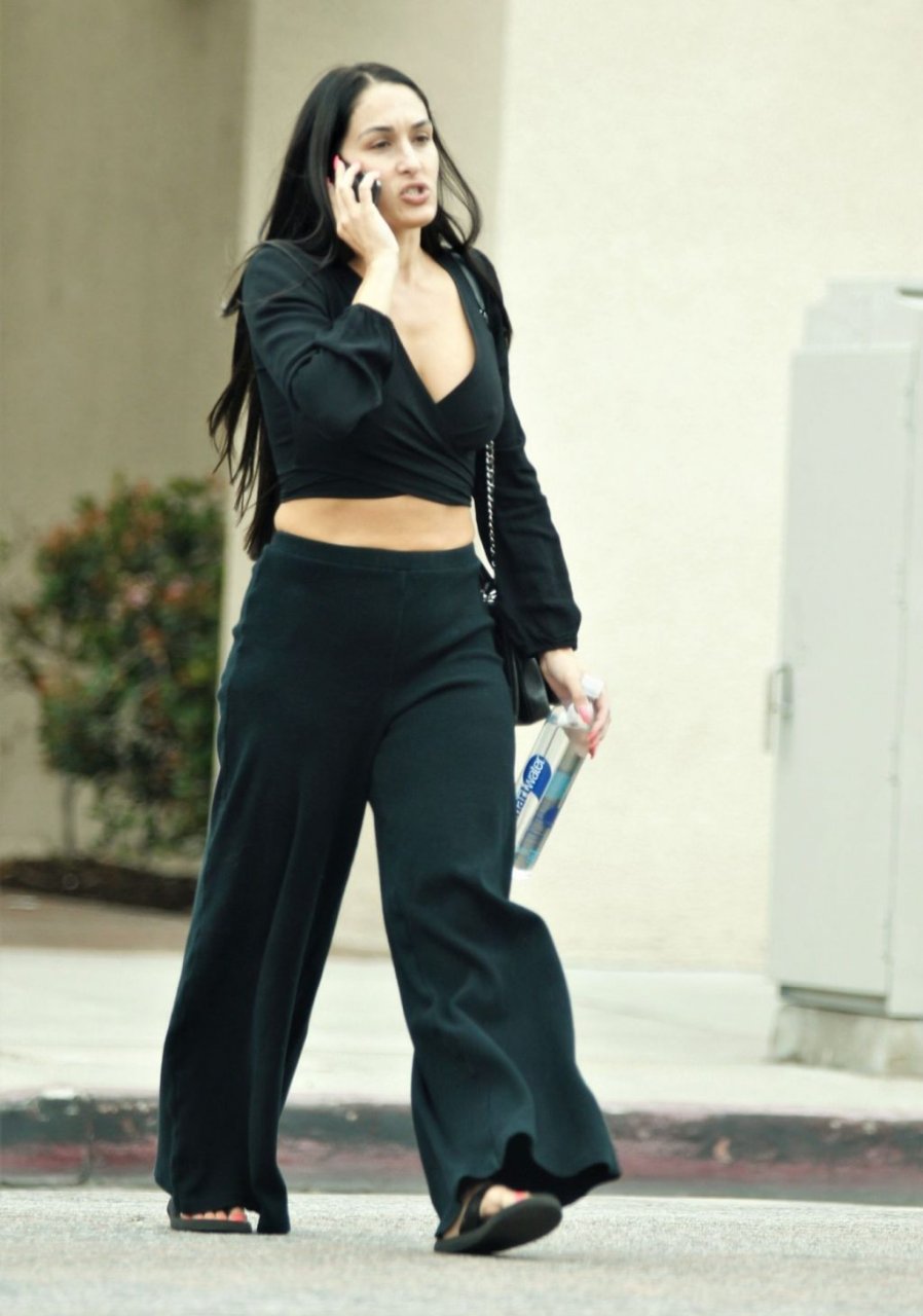 Nikki Bella sale con unos pantalones deportivos acampanados y una blusa negra cruzada en Studio City, 08/05/2019. La luchadora retirada de 35 años atiende una llamada telefónica mientras está fuera.