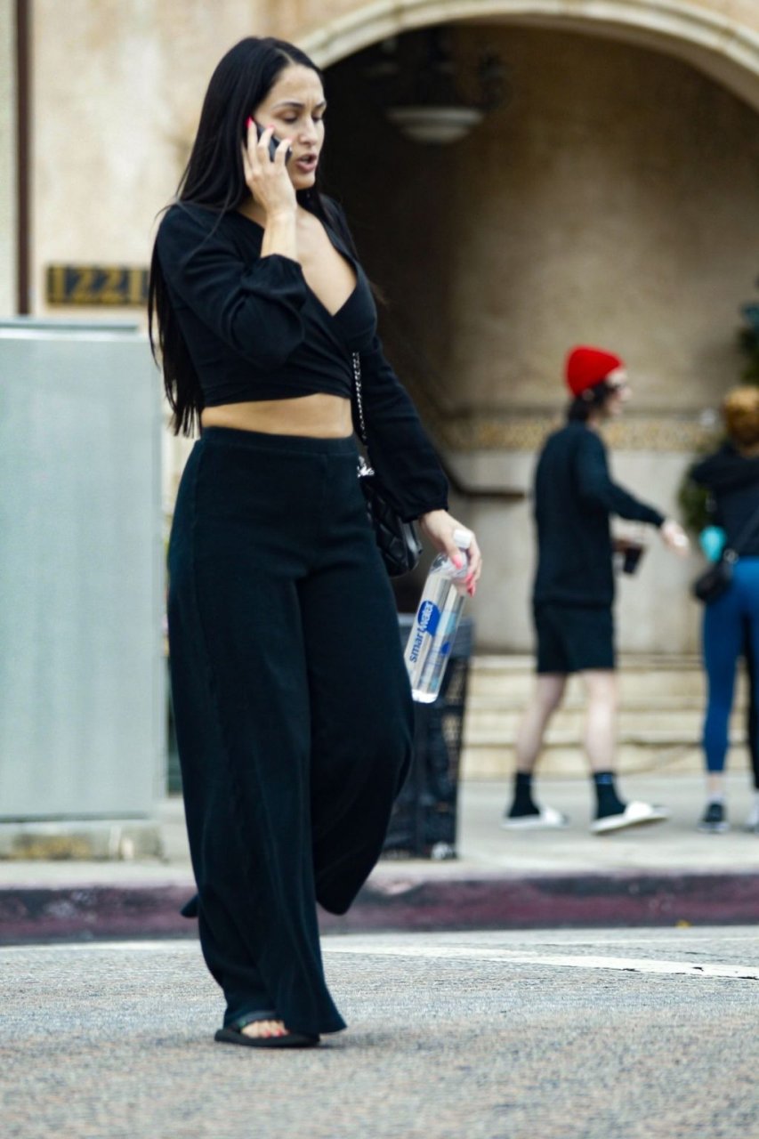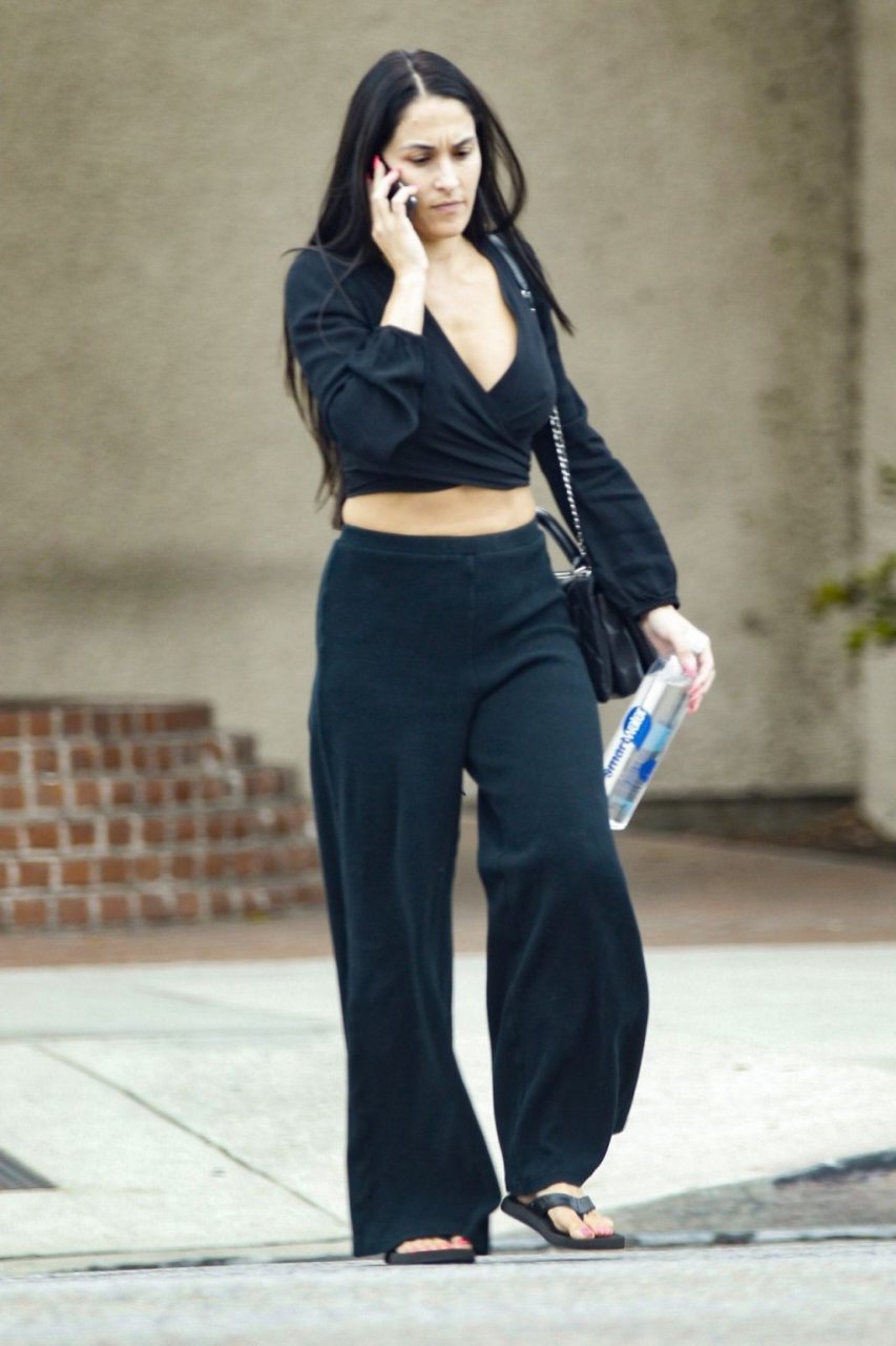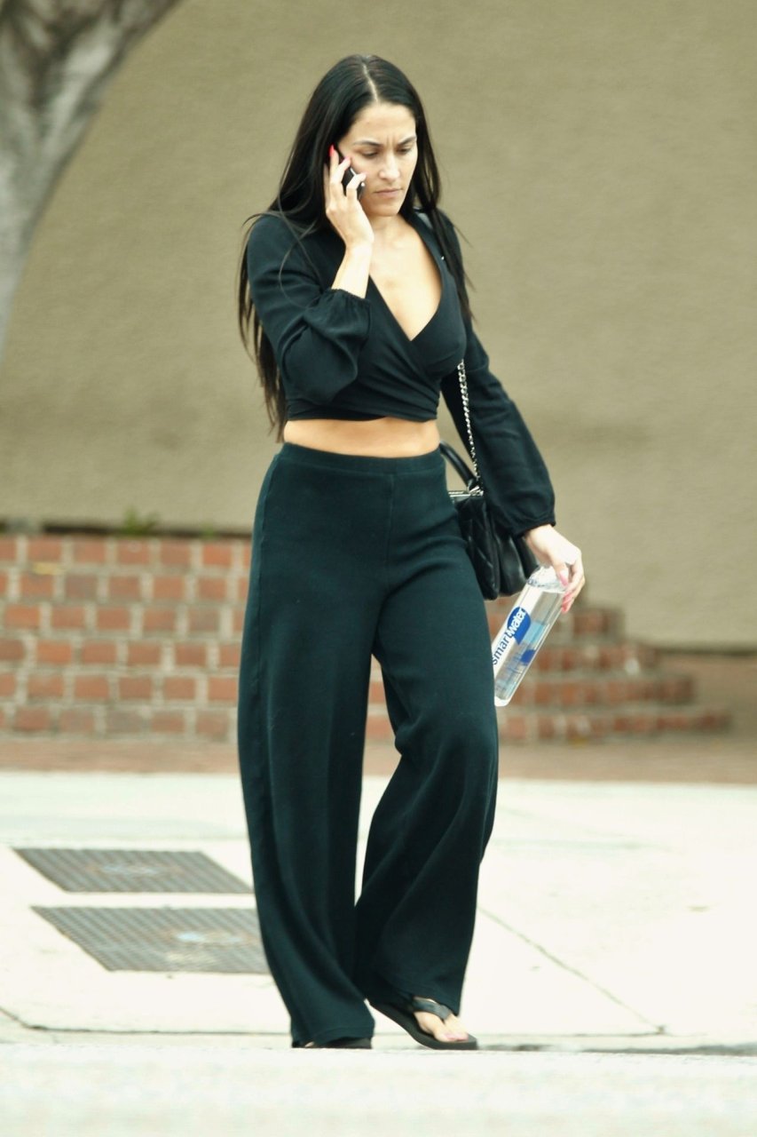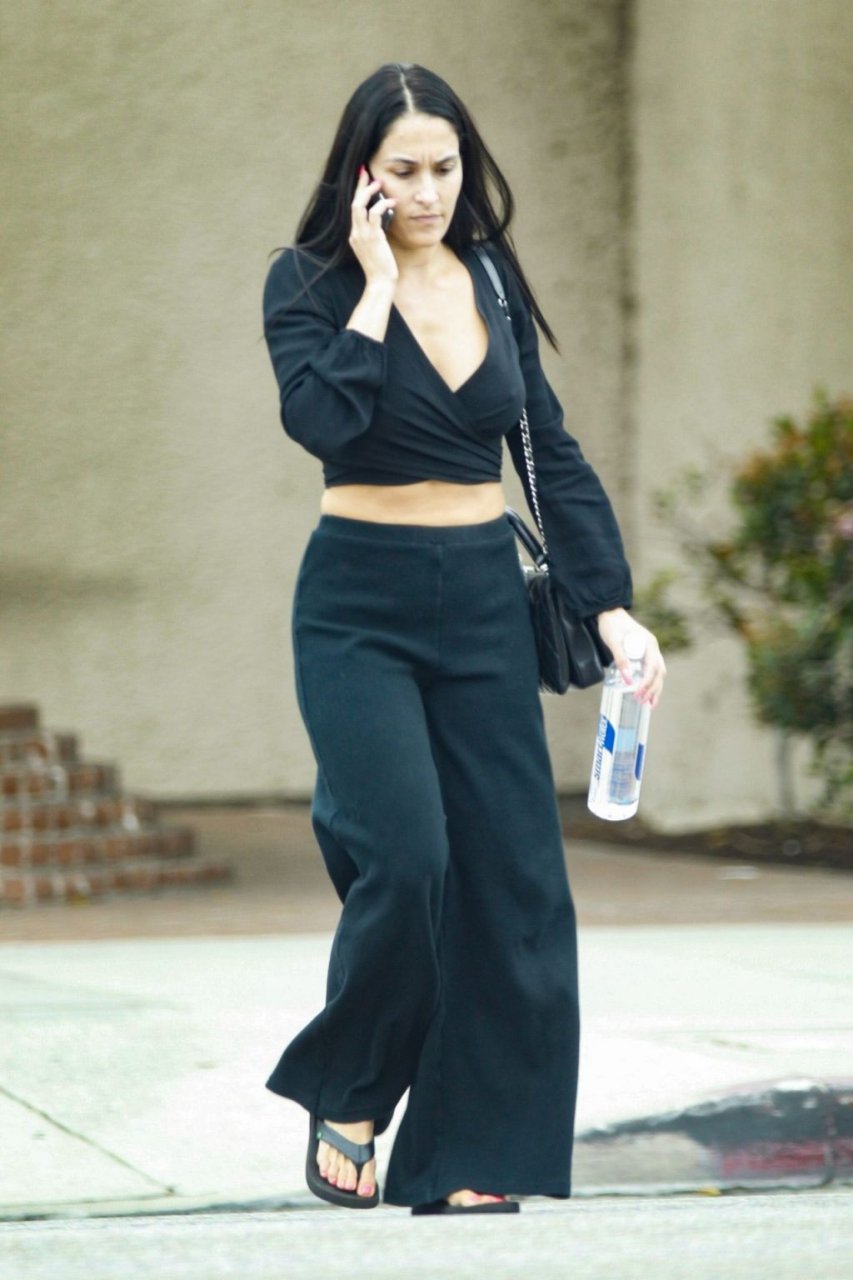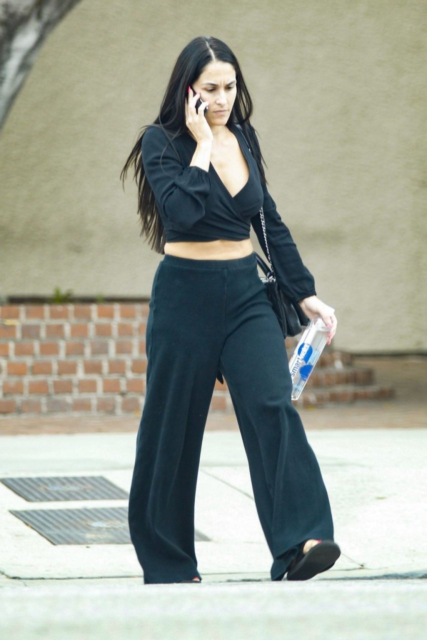 Nikki Bella sale con unos pantalones deportivos acampanados y una blusa negra cruzada en Studio City, 08/05/2019. La luchadora retirada de 35 años atiende una llamada telefónica mientras está fuera.