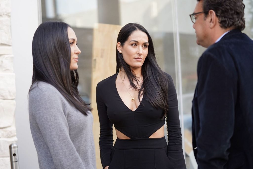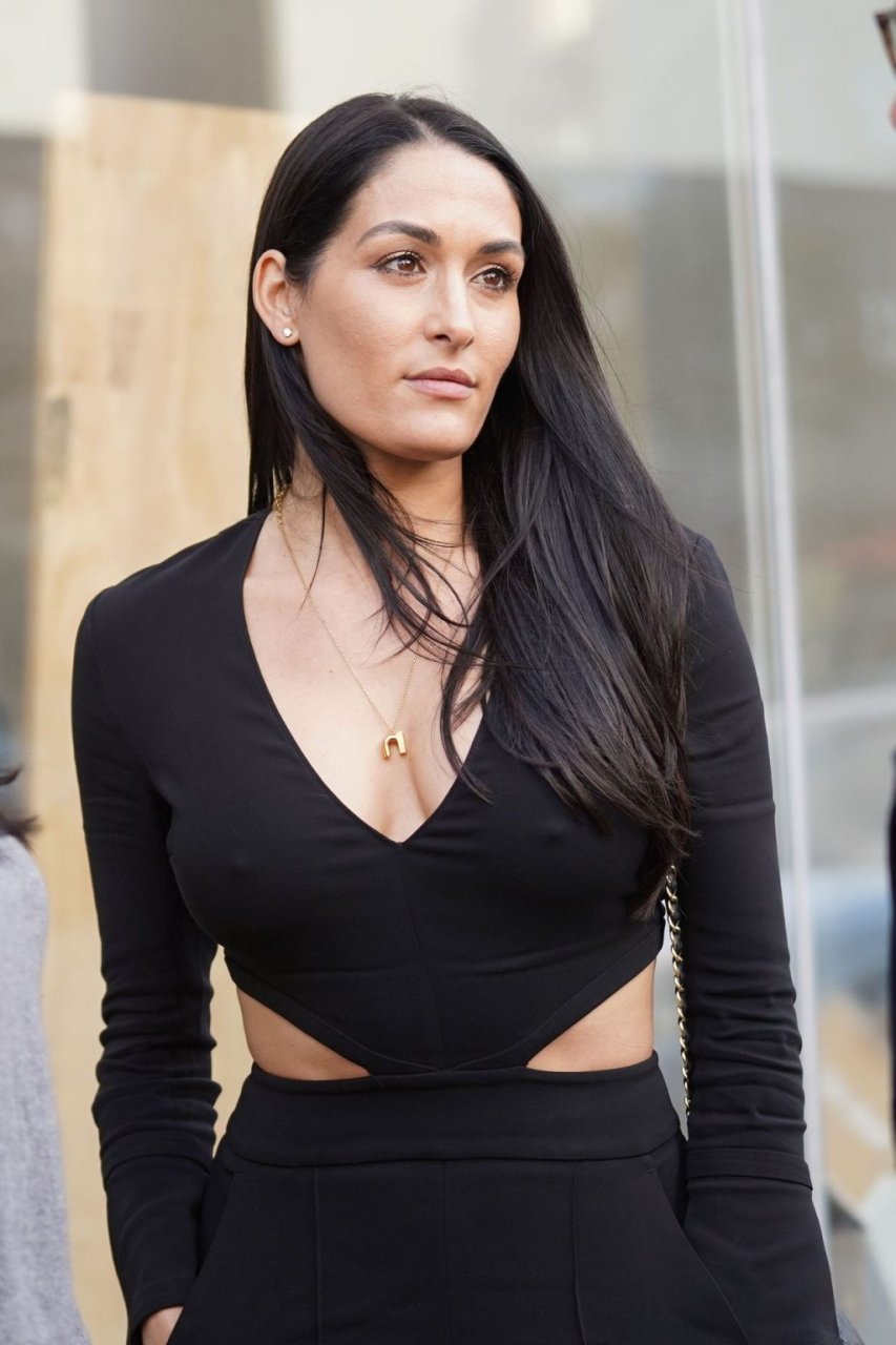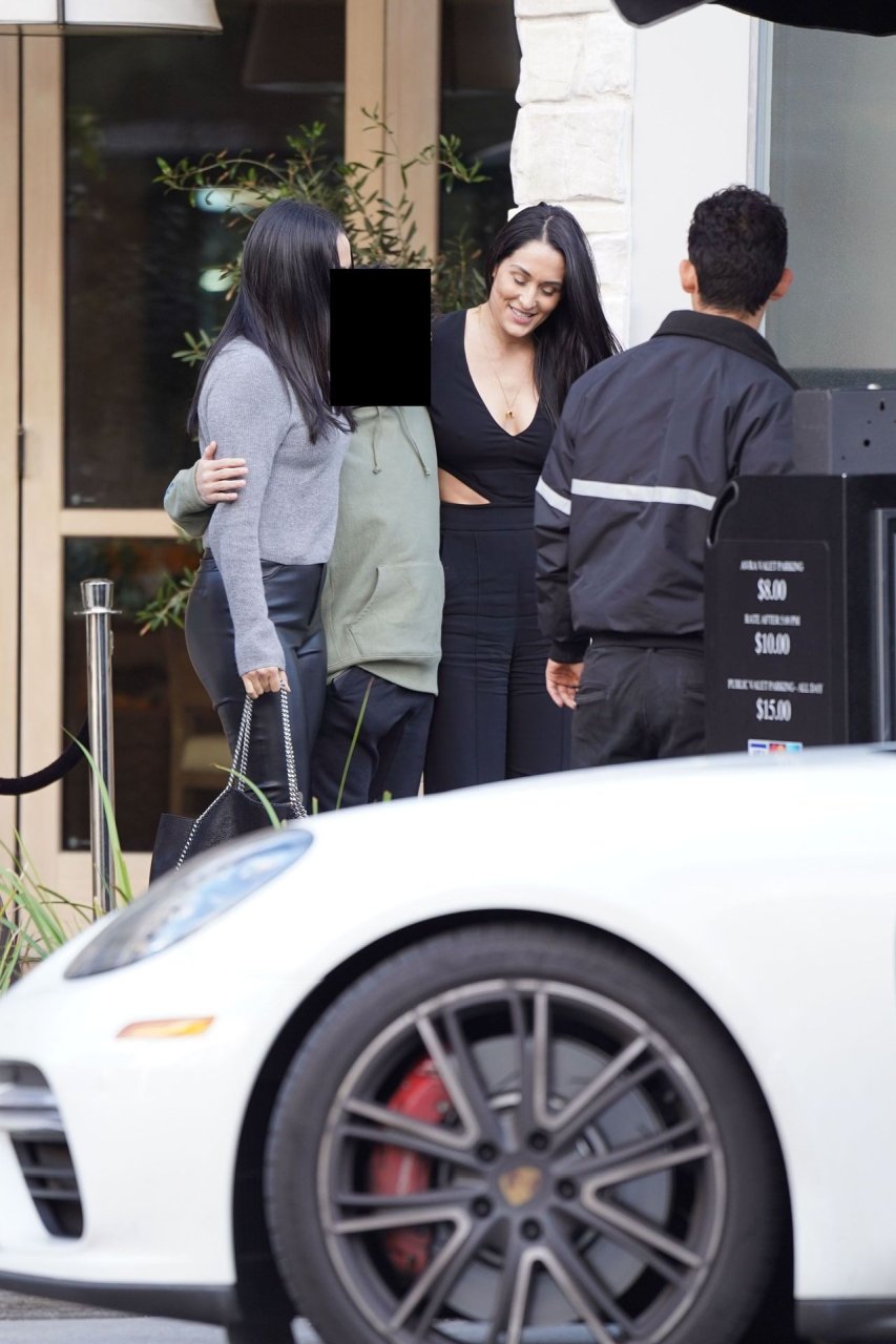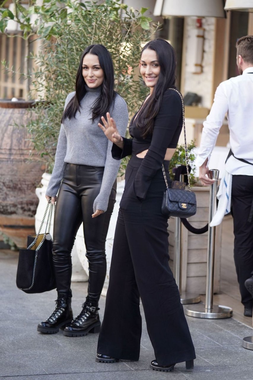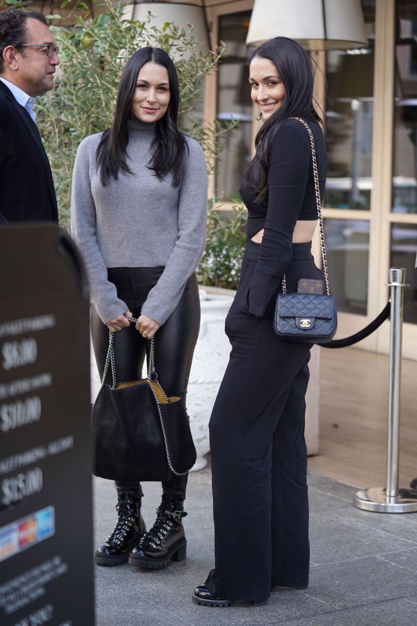 Nikki y Brie Bella mostraron un estilo elegante al salir de una reunión de almuerzo en Avra en Beverly Hills, 20/02/2019. Las gemelas Bella estaban sonrientes esta tarde mientras se les vio tomando una foto con un joven fan emocionado, y esperaban su coche en el valet.