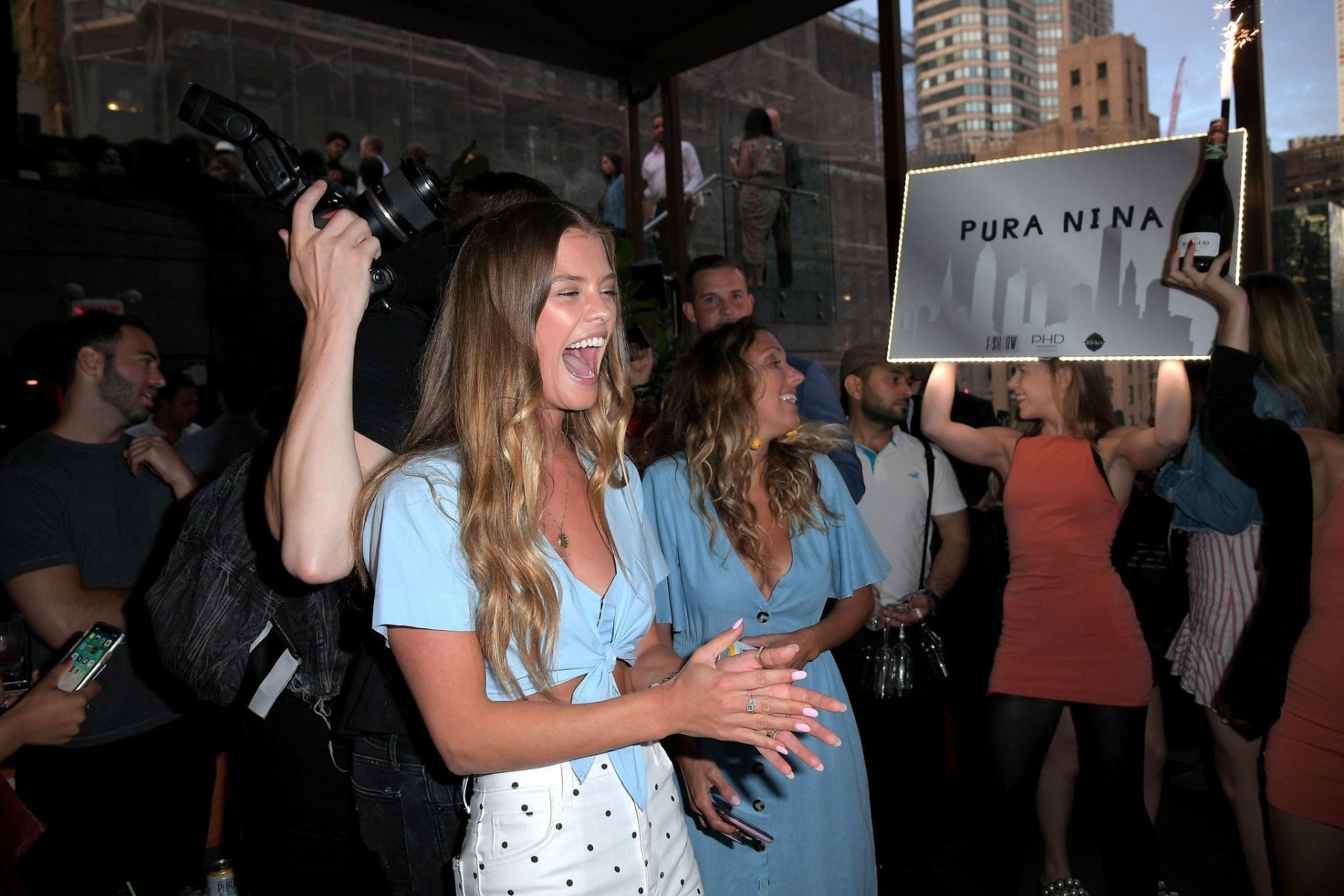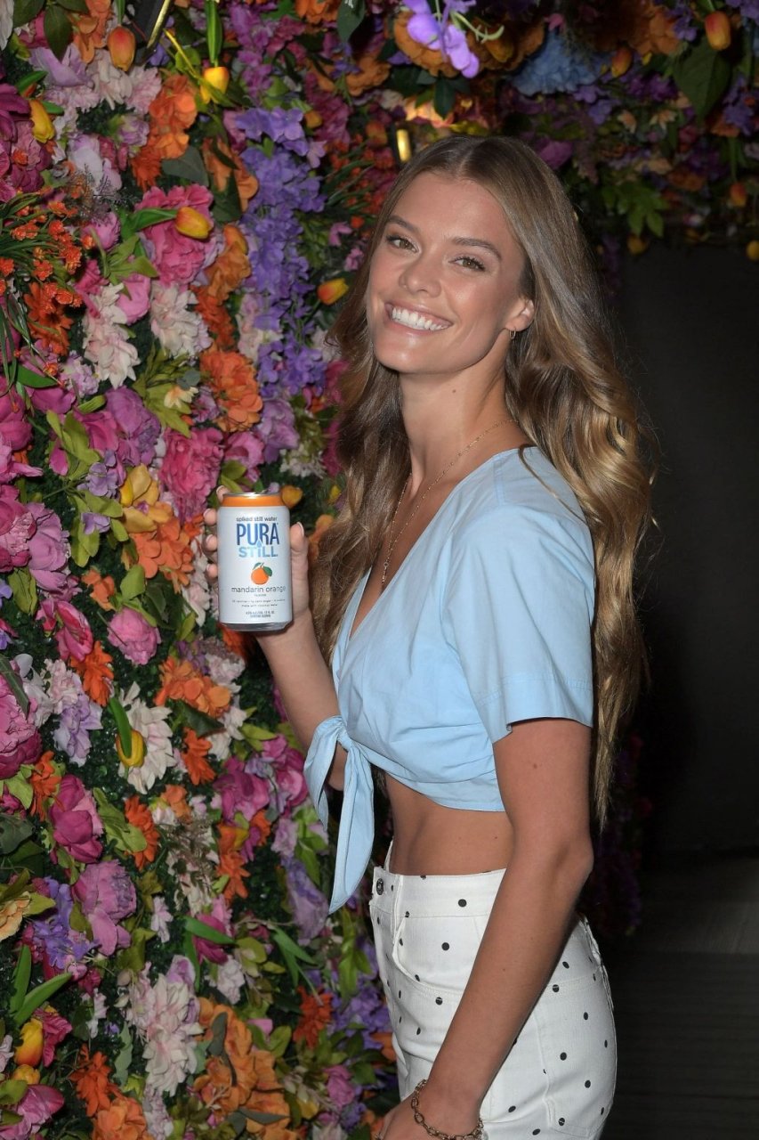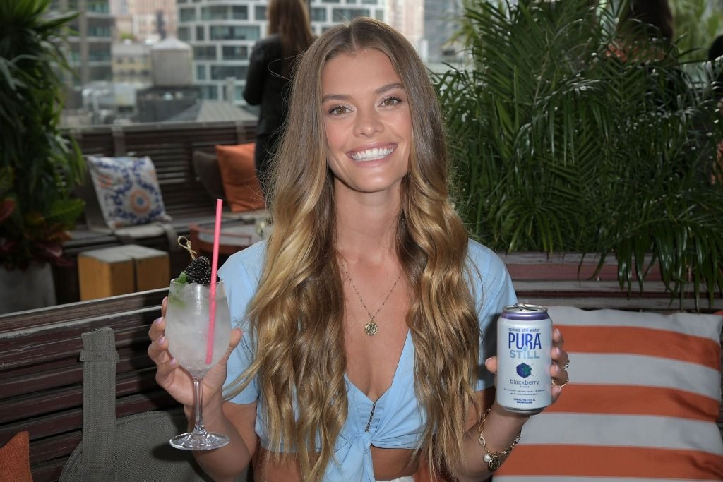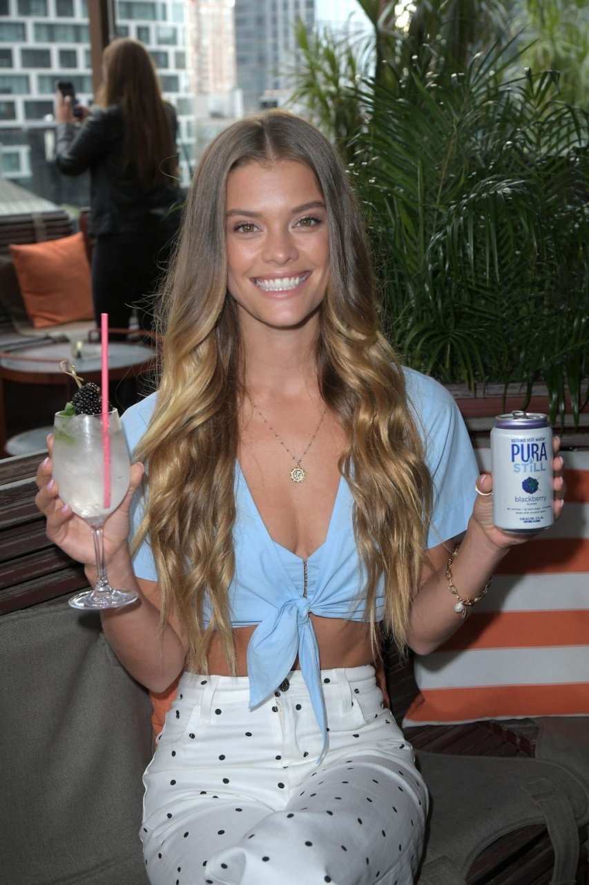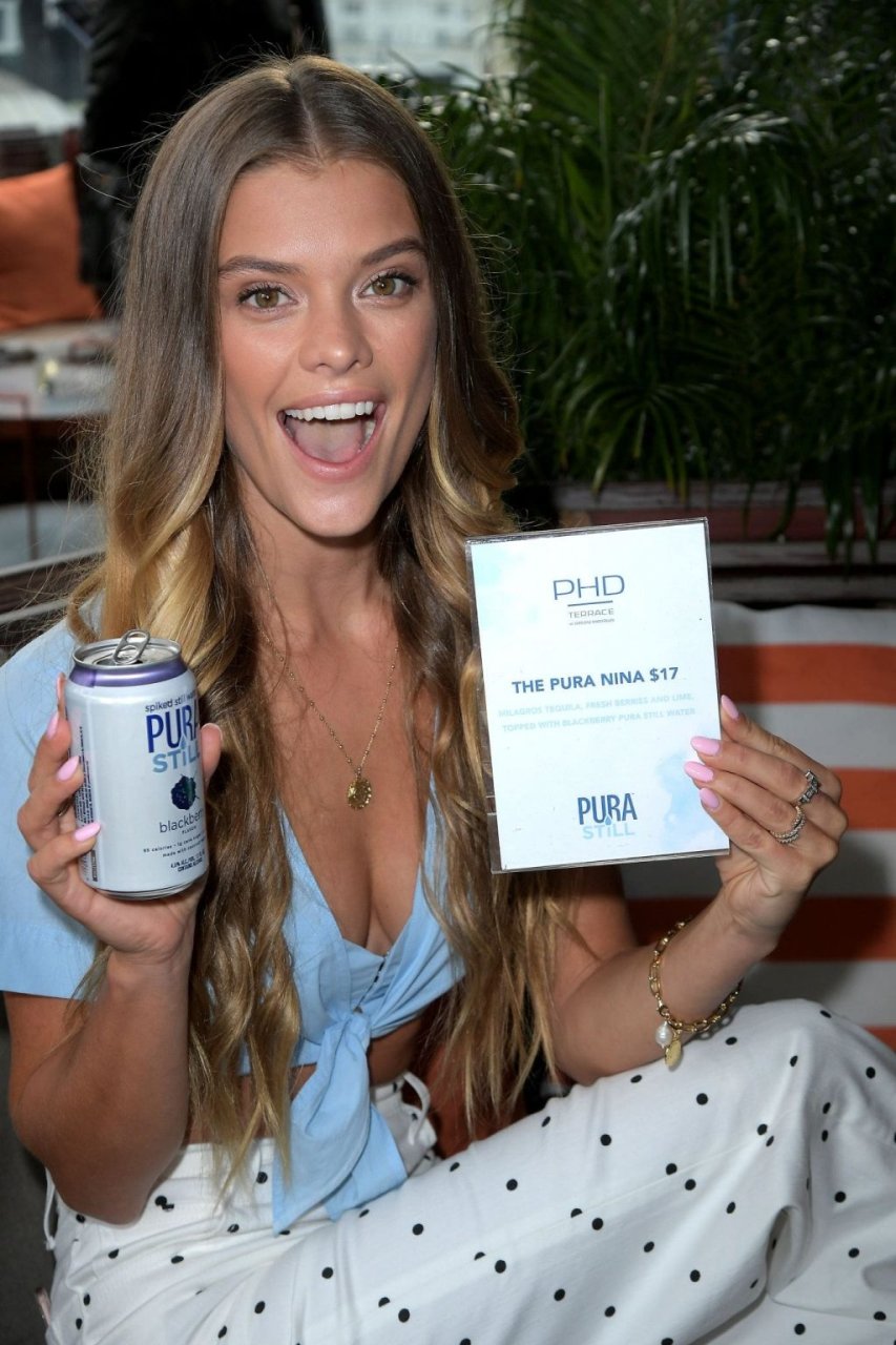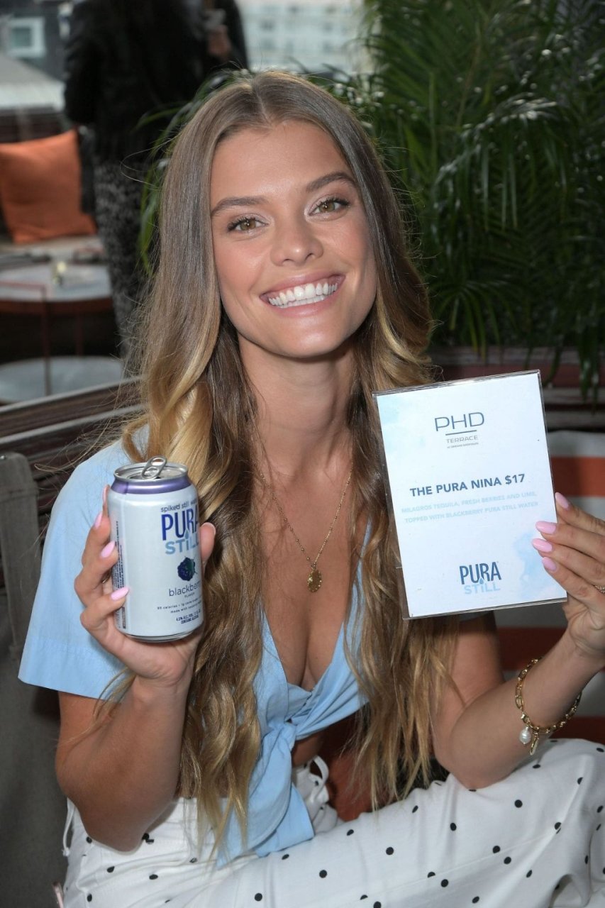 Nina Agdal fue vista en el Sip on Summer con Pura Still en Nueva York, 27/08/2019. La famosa modelo mostró su escote, posando con un top azul.