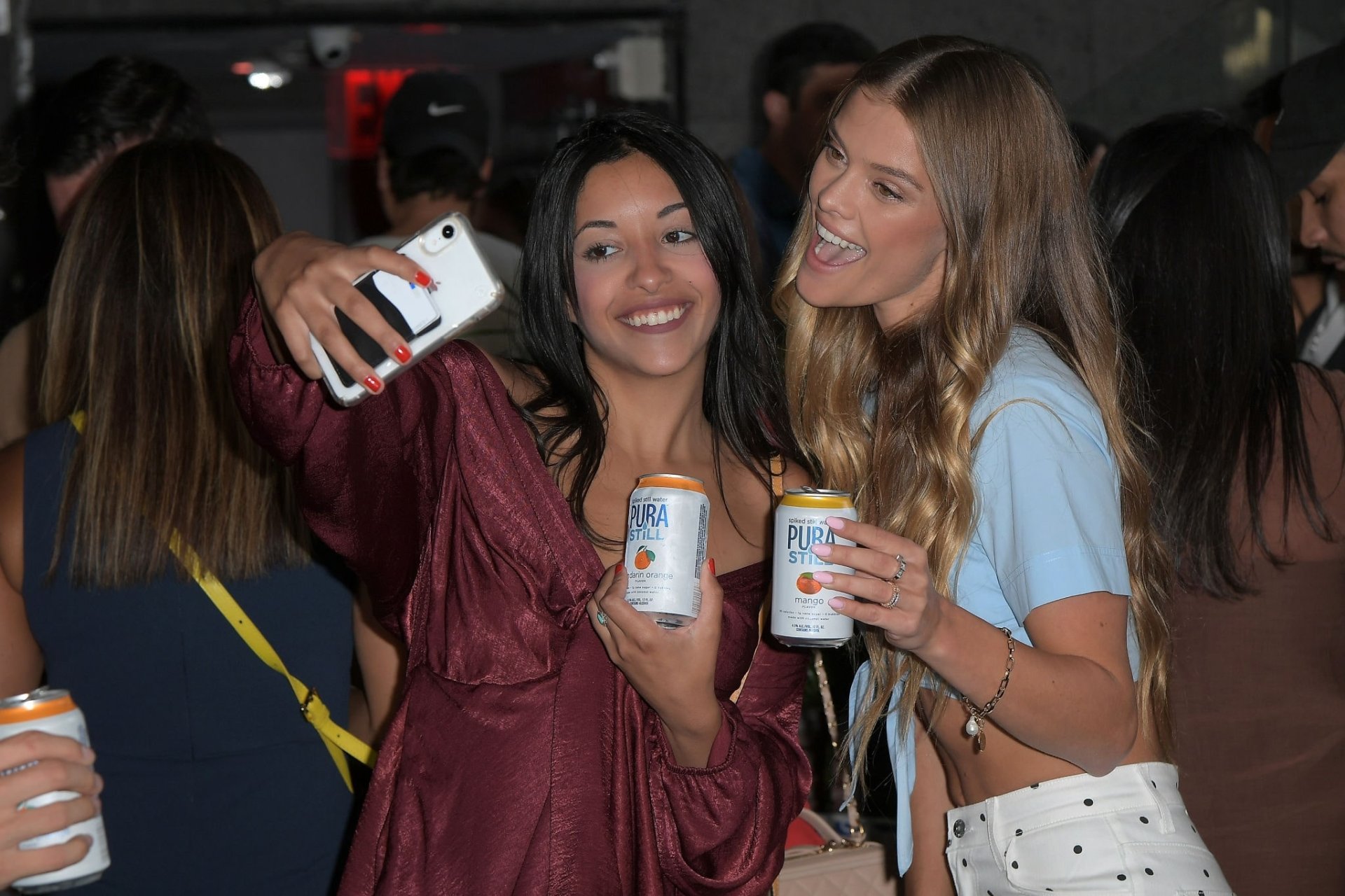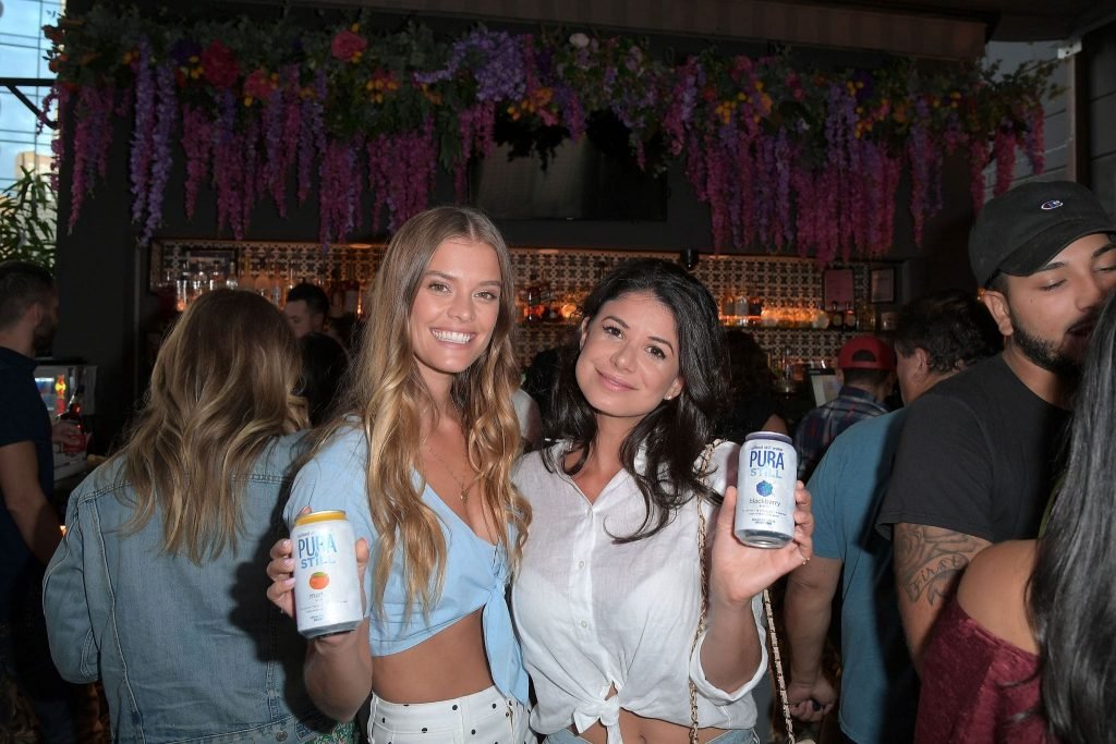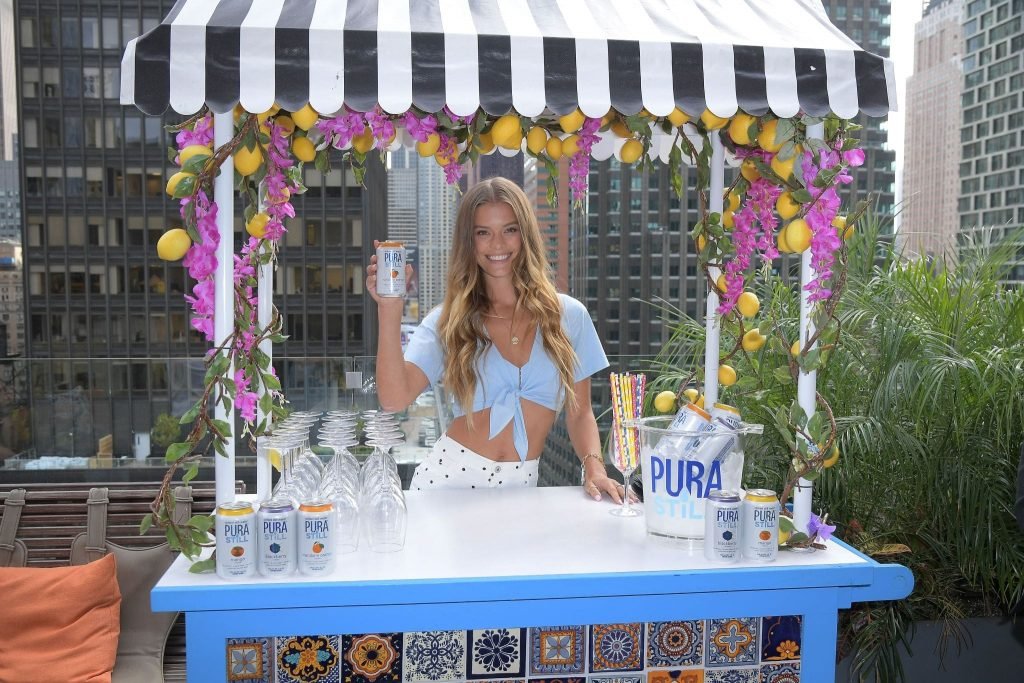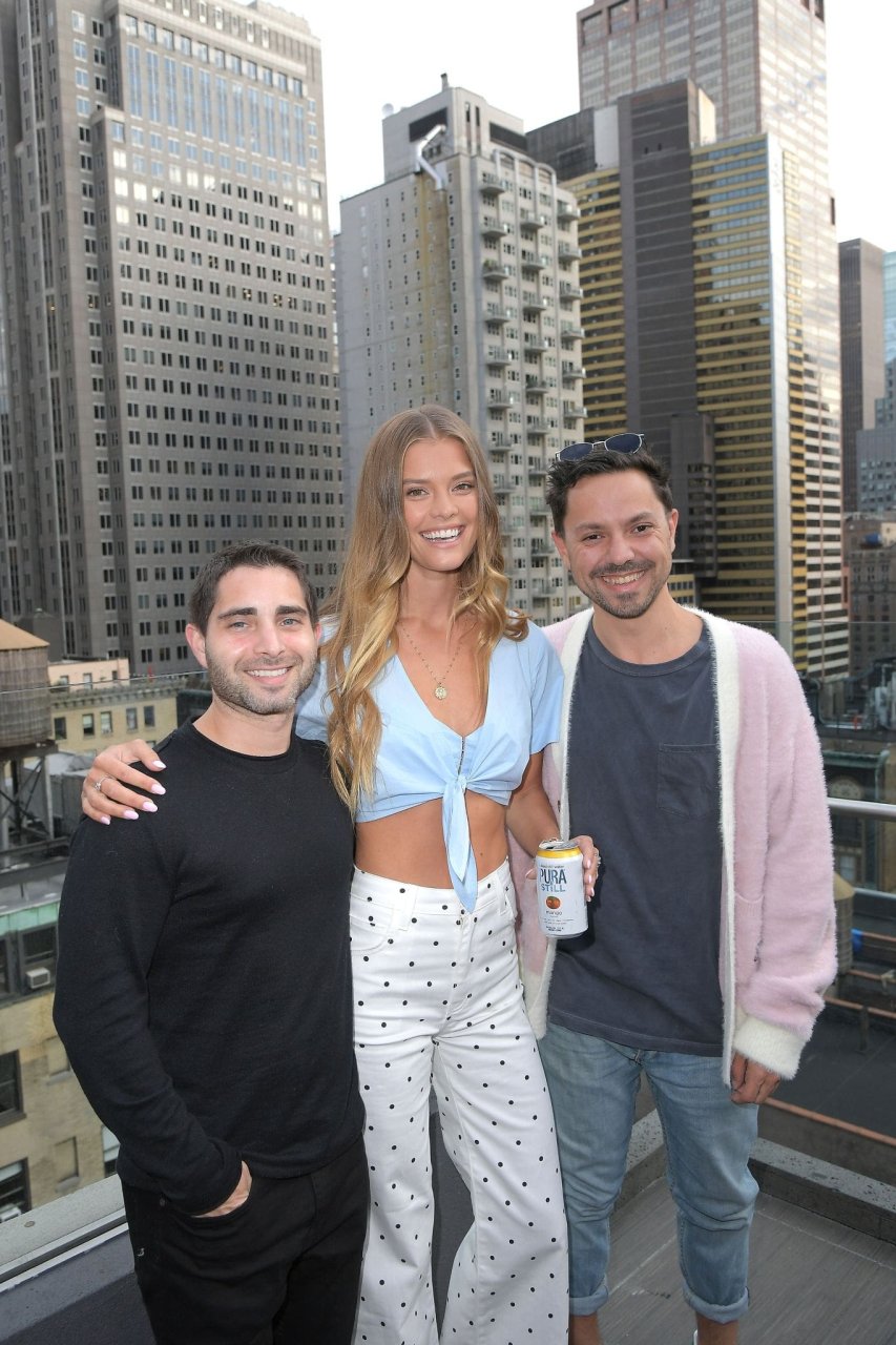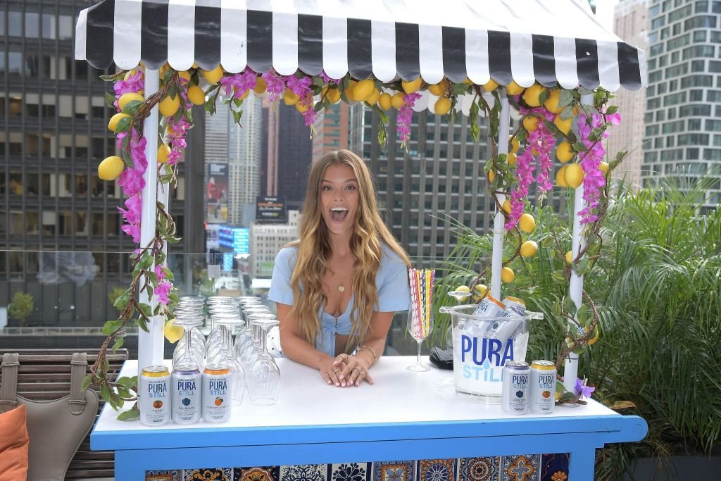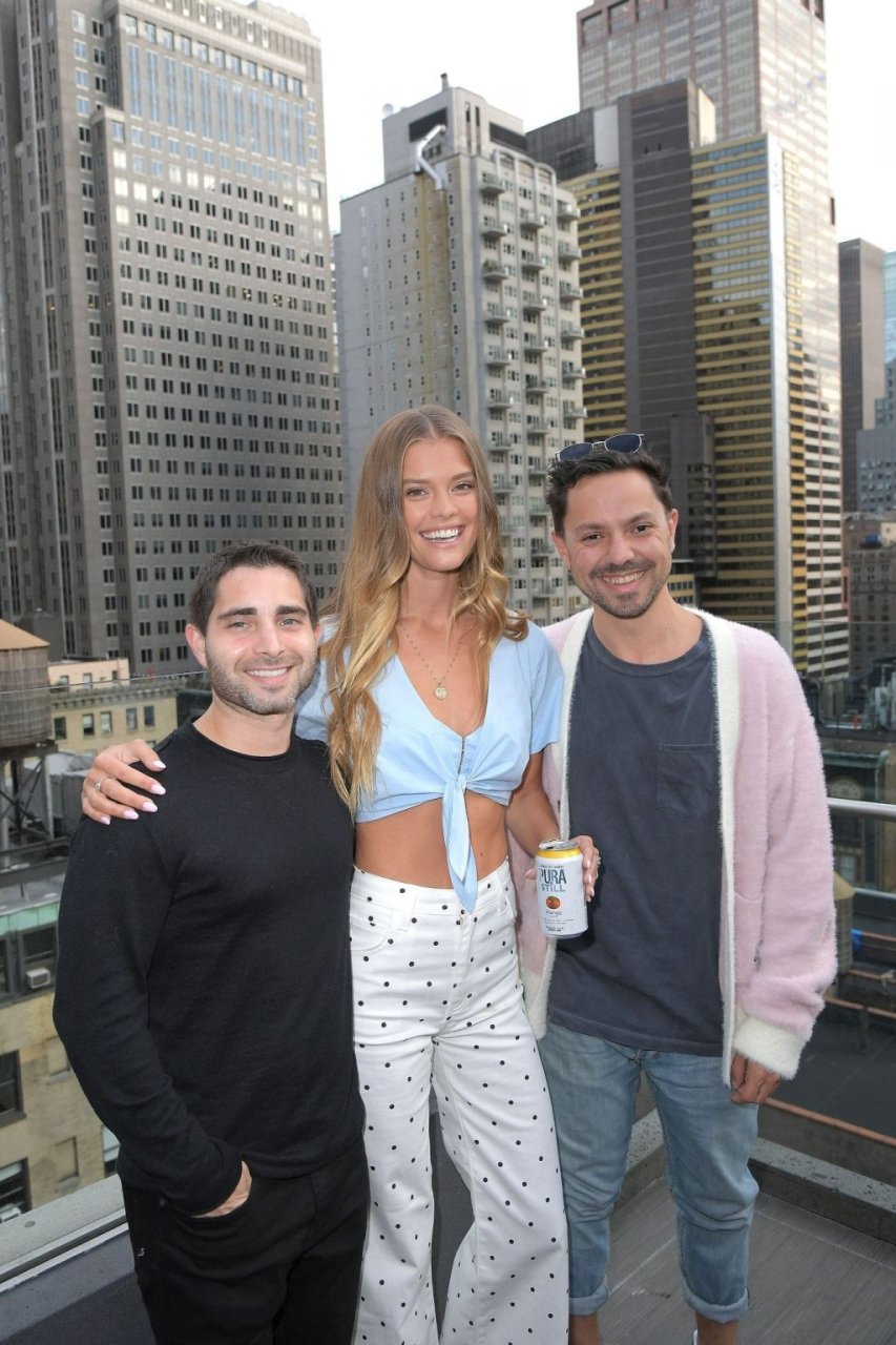 Nina Agdal fue vista en el Sip on Summer con Pura Still en Nueva York, 27/08/2019. La famosa modelo mostró su escote, posando con un top azul.