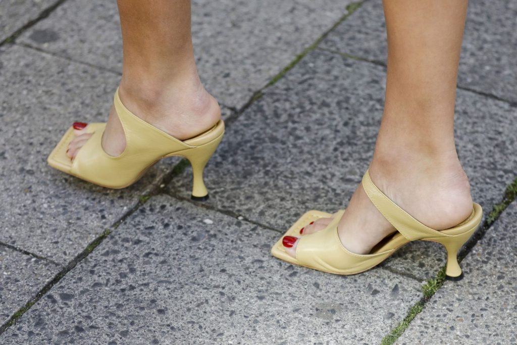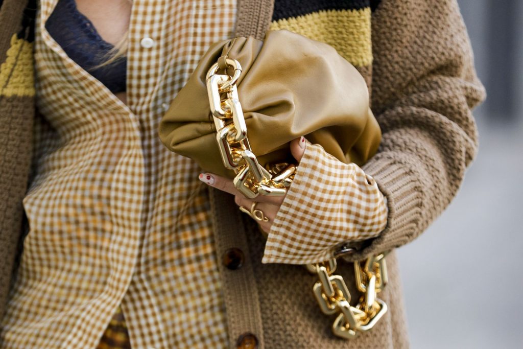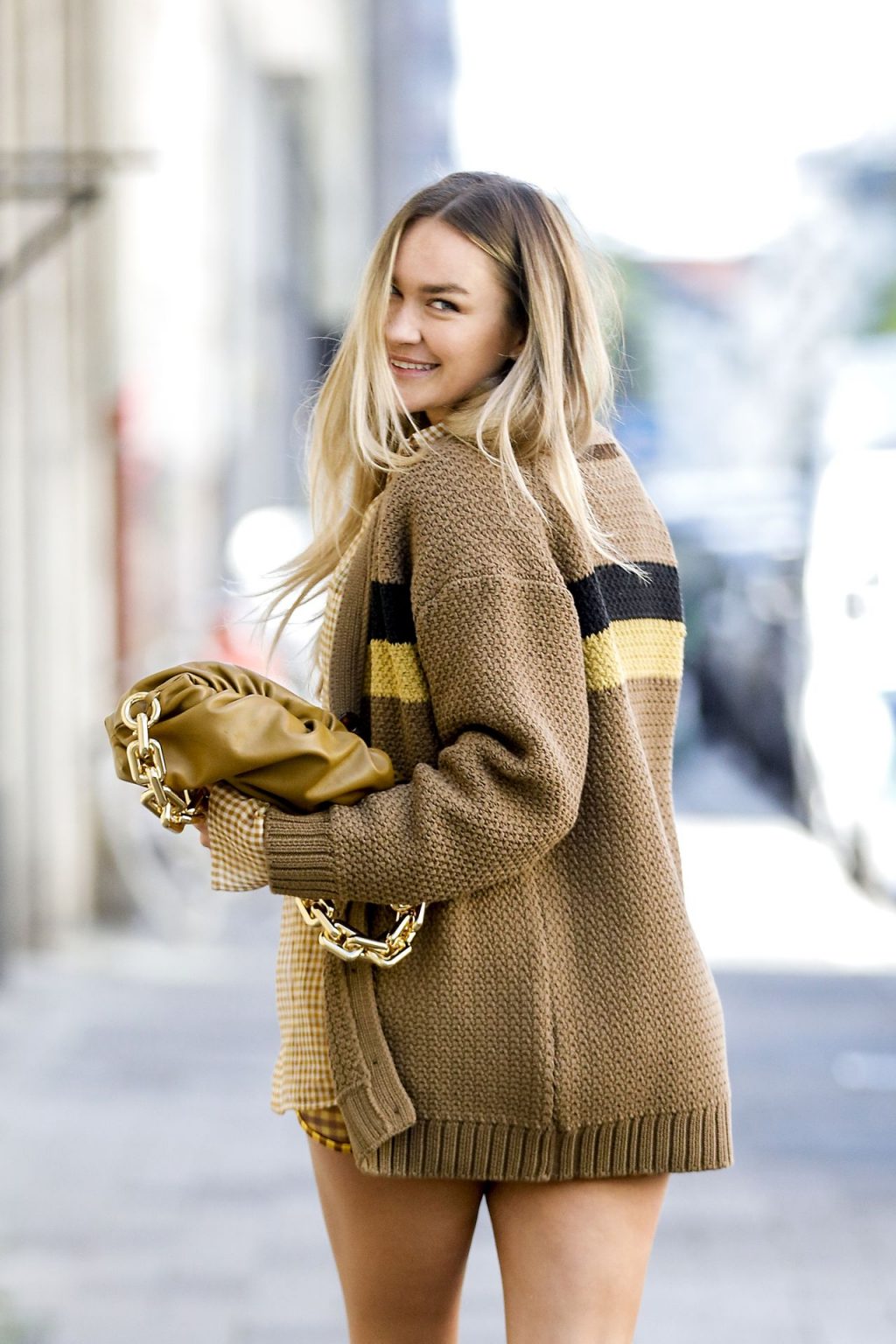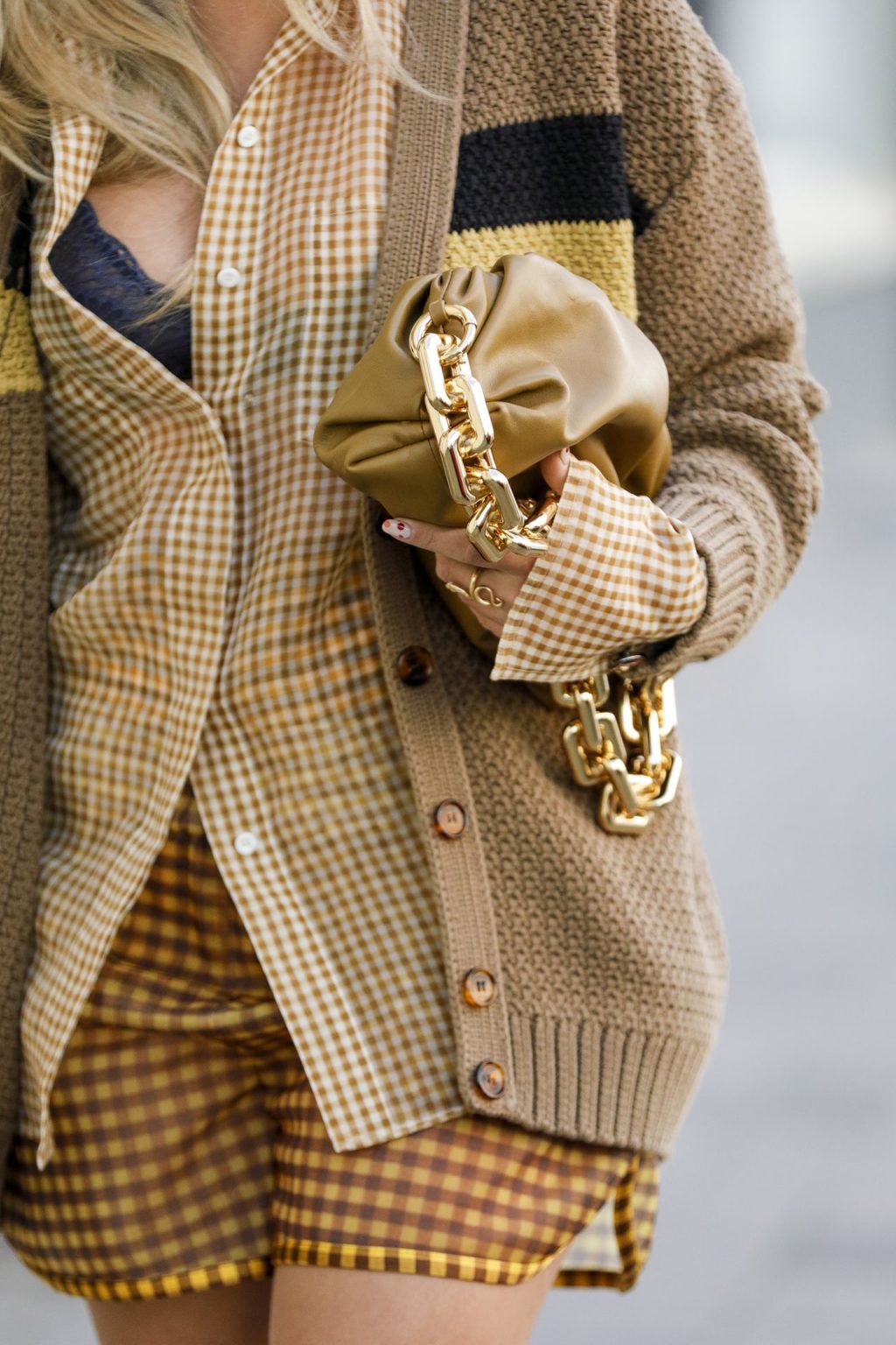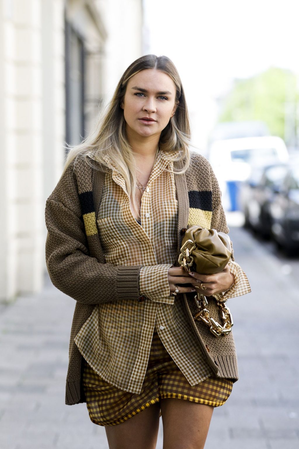 Influencer Nina Suess, vistiendo un cárdigan beige con una franja de bloque negra/amarilla a nivel del pecho, una blusa beige blanca a cuadros y unos shorts a cuadros amarillos y marrones, sandalias amarillas y un bolso tipo pouch color coñac con cadena durante una sesión de estilo callejero en Múnich, Alemania, 27/05/2020.