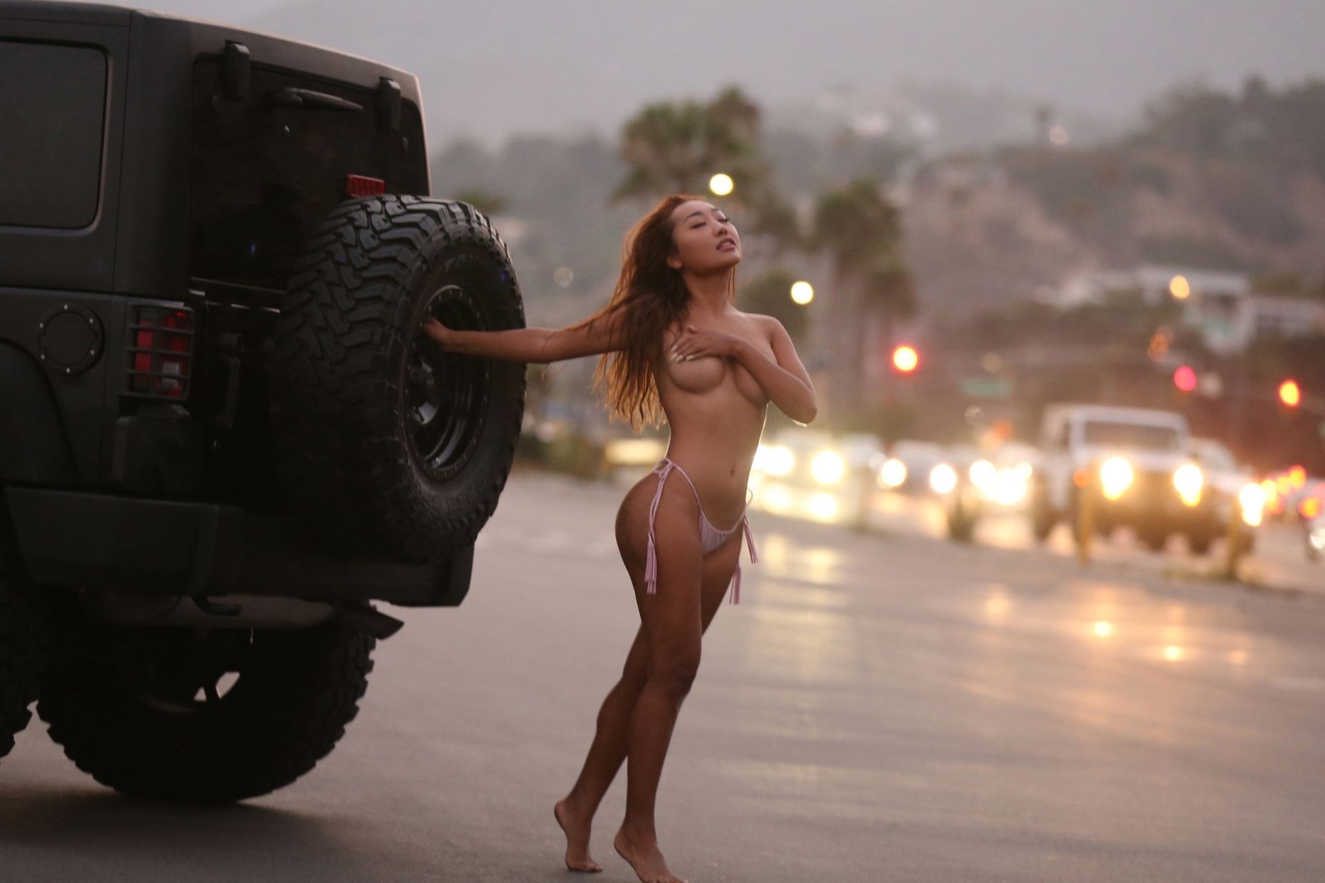 Nora Kyzy posa en una sensual sesión de fotos topless para 138 Water en Malibu (septiembre de 2021). La sexy modelo ha posado casi desnuda y ha adoptado varias poses junto a un Jeep Wrangler para el último anuncio de 138 en la Pacific Coast Highway!