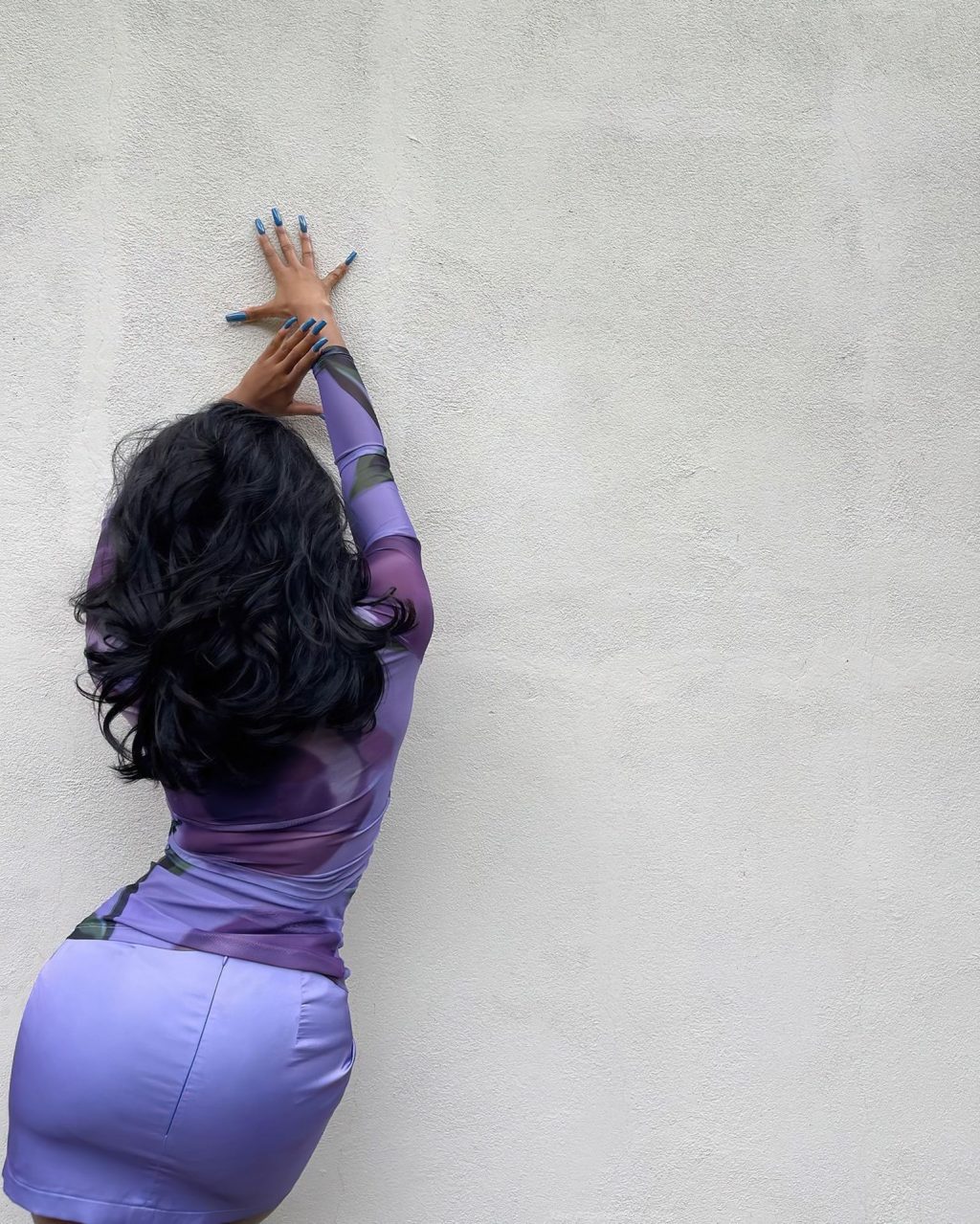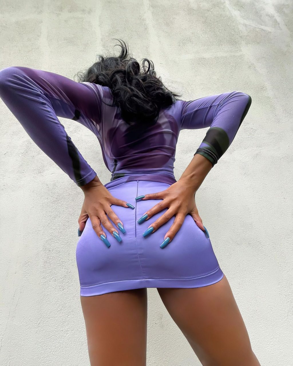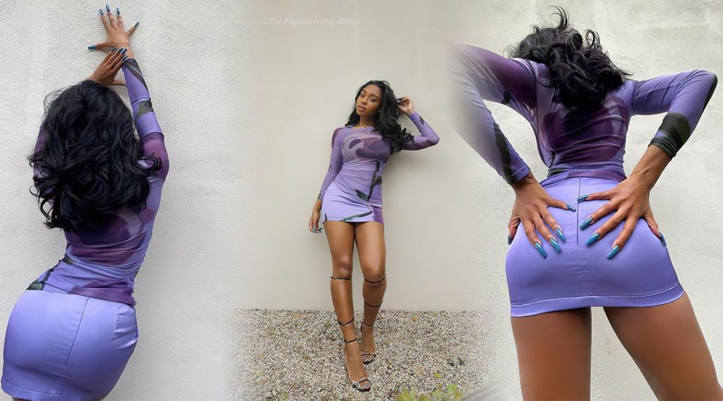 Normani Kordei muestra su hermosa figura y piernas posando con una minifalda morada y una blusa transparente para sus seguidores de Instagram, 11/02/2021.