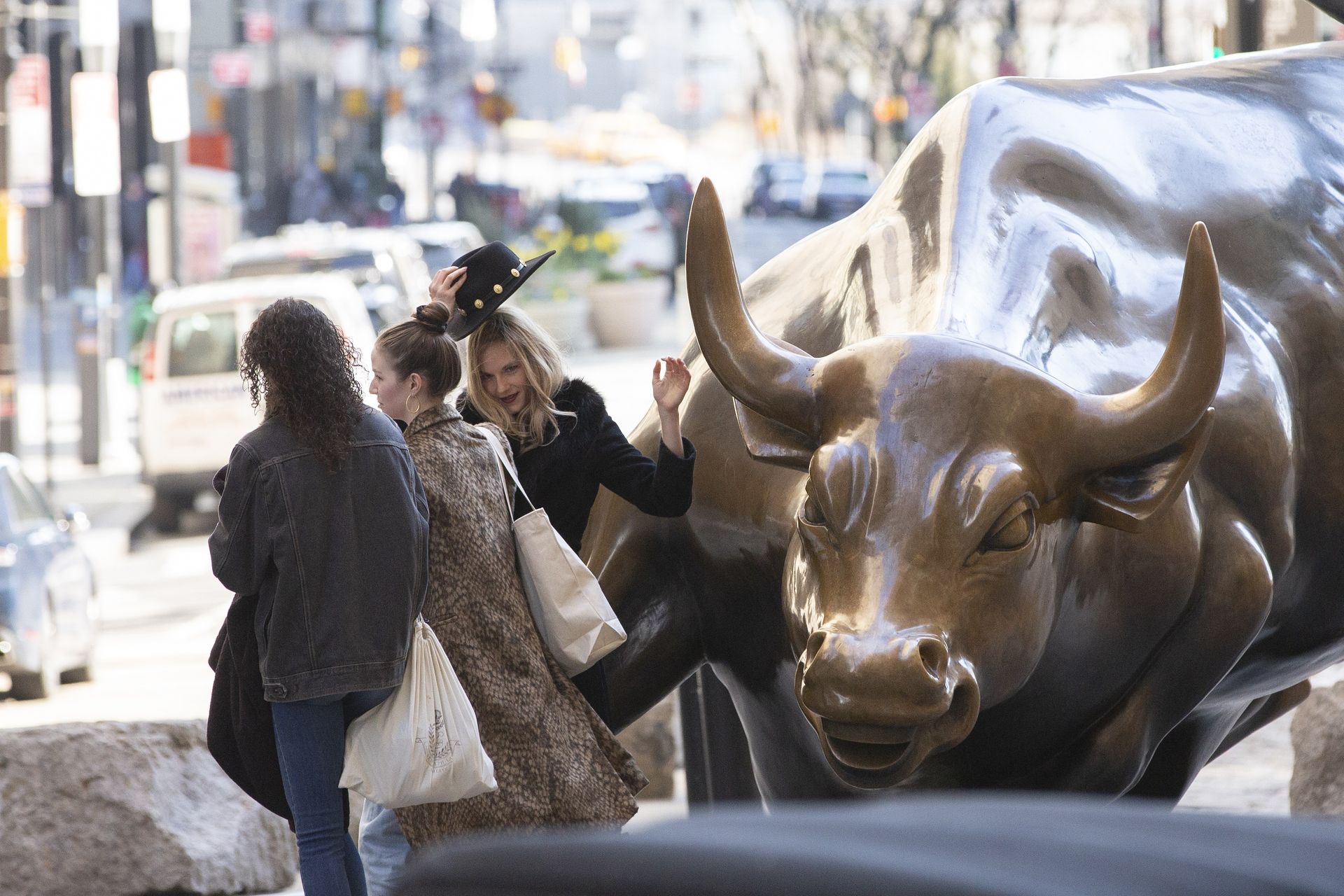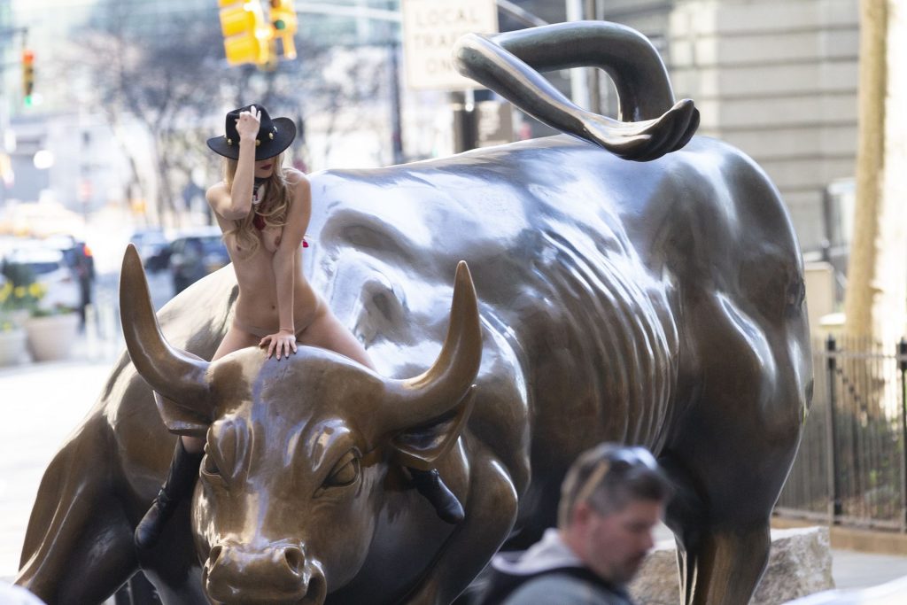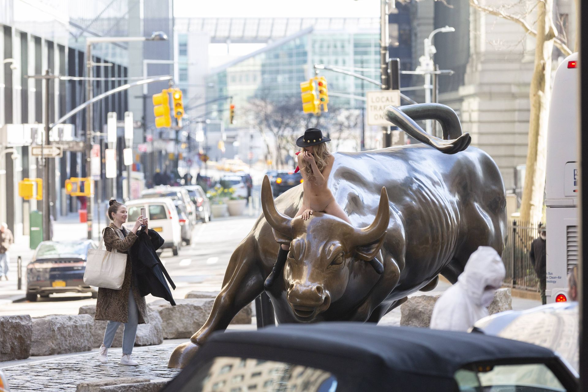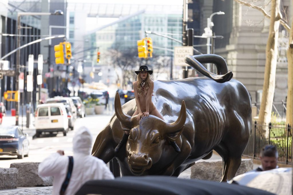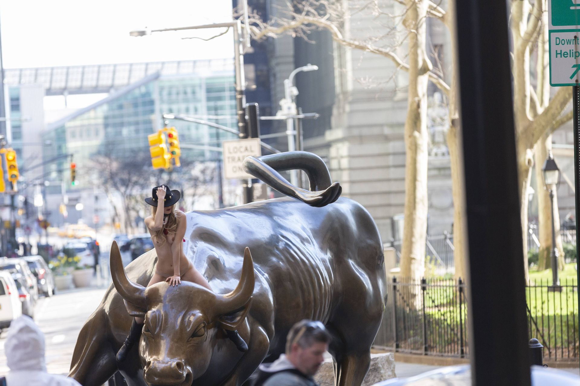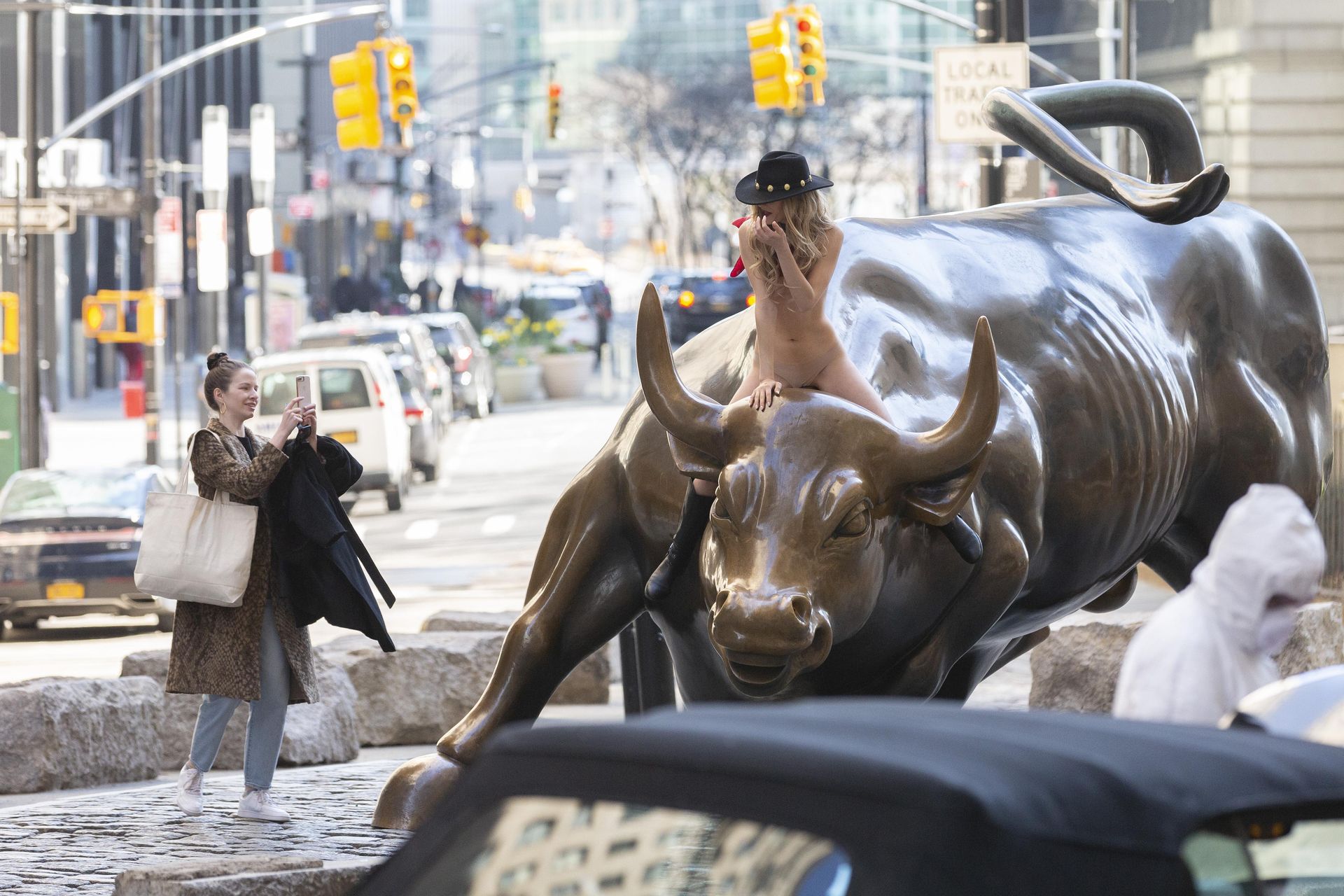 Con la cuarentena en vigor y las calles vacías, nadie estaba allí para detener a la vaquera despreocupada de montar a horcajadas el ícono de bronce del Distrito Financiero. Cuando vio a un fotógrafo de Post, la jinete del toro salió corriendo con un amigo que había estado tomando fotos con un iPhone.