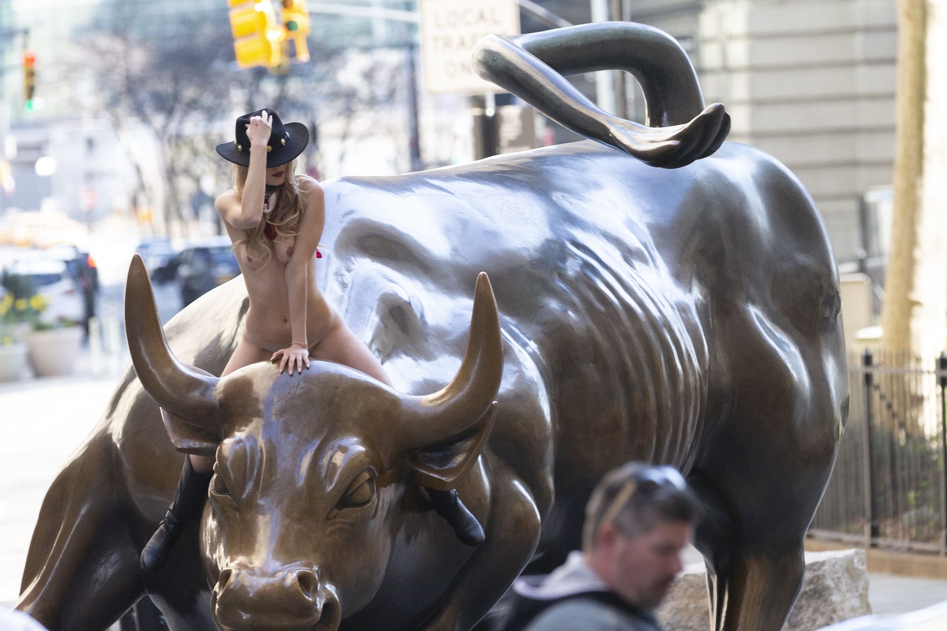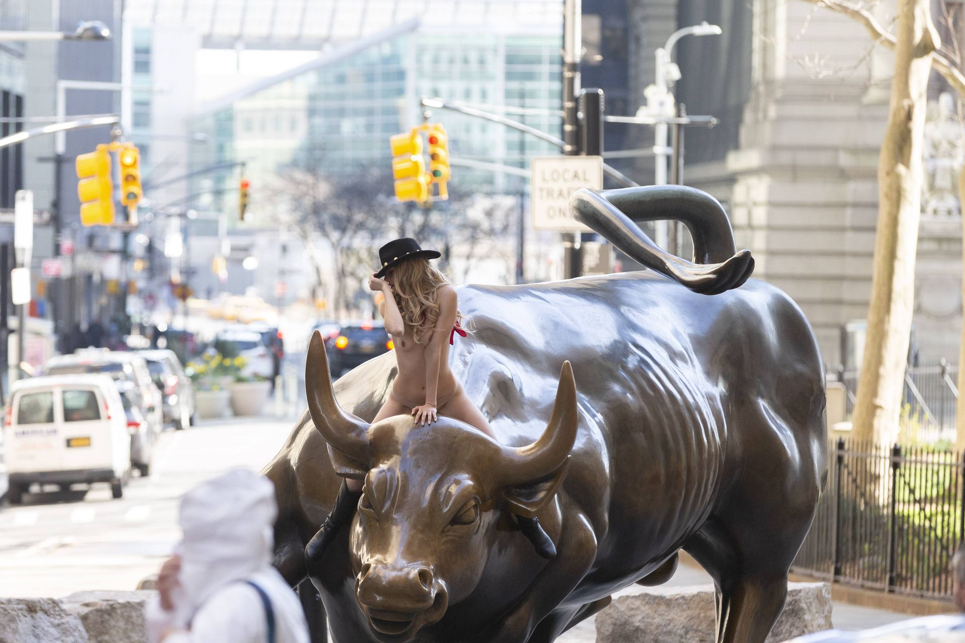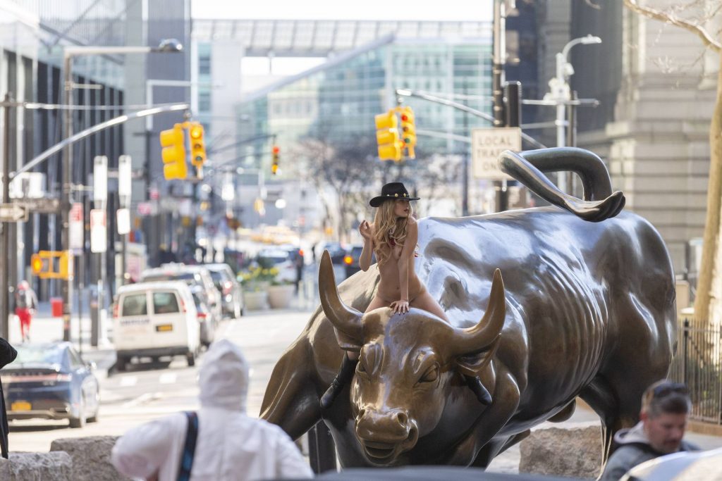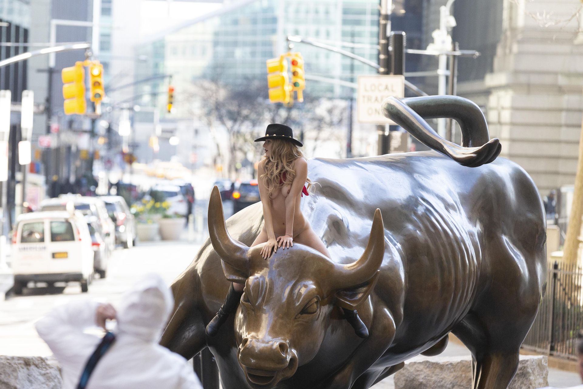 Esta bomba rubia montó a horcajadas la estatua del “Toro de Wall Street” desnuda el jueves, ignorando descaradamente todas las medidas de protección contra el coronavirus, 26/03/2020.