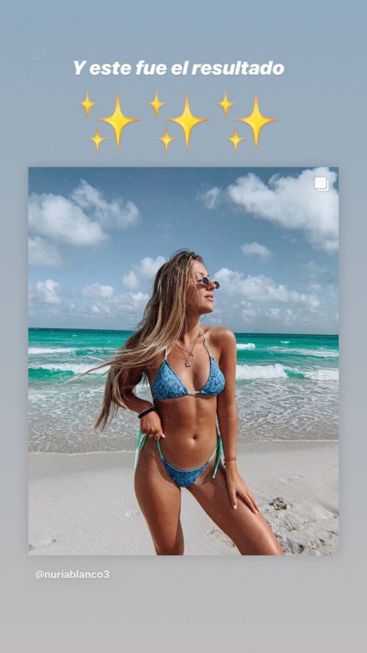La modelo española Nuria Blanco fue vista con un bikini azul junto a Jennifer Muchelas en la playa de Miami, 11/03/2019.
