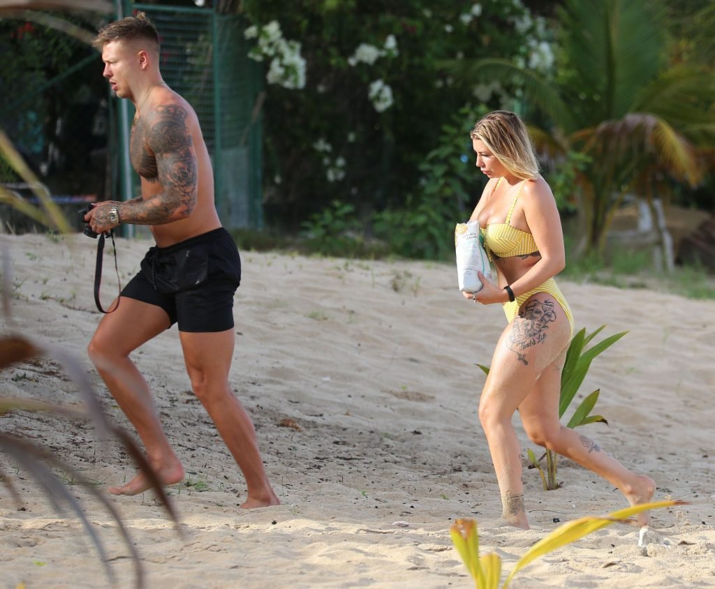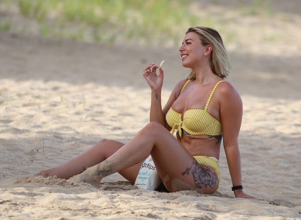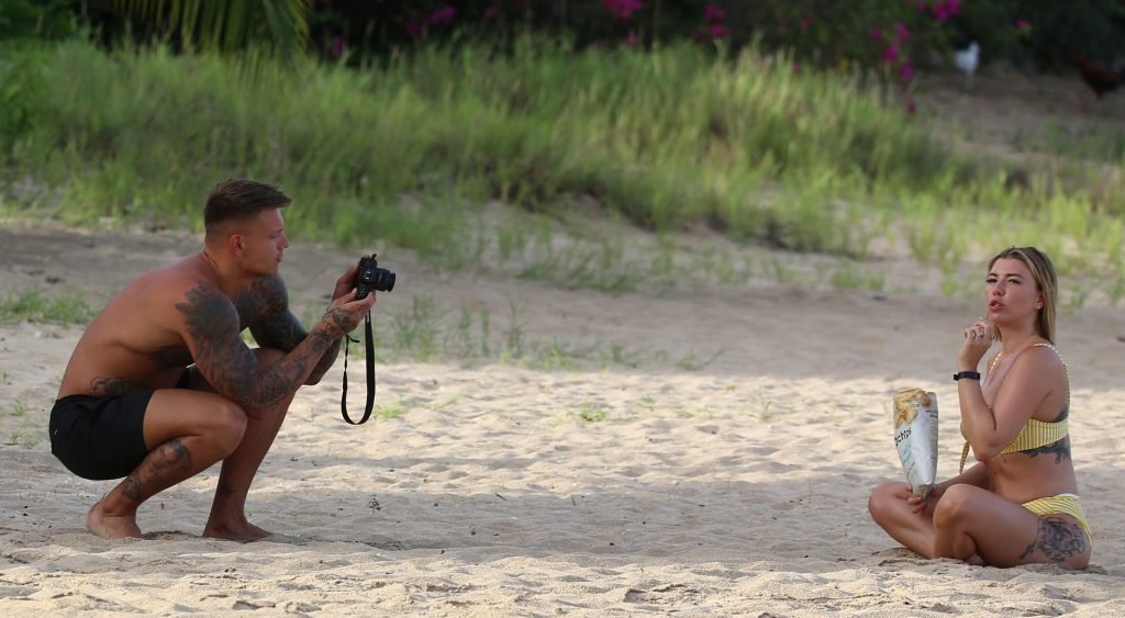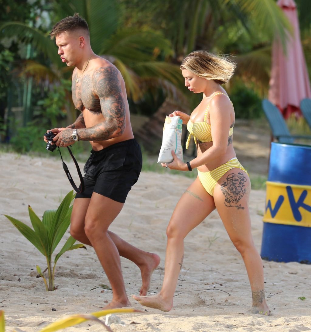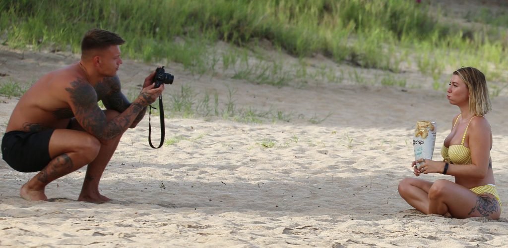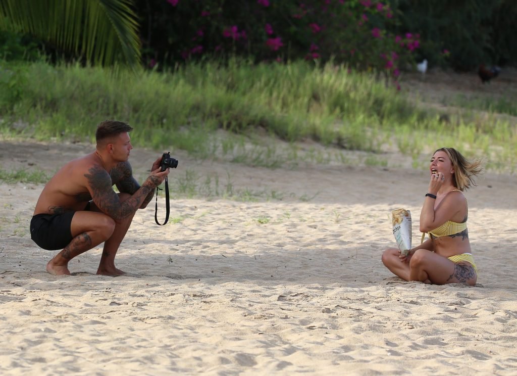 “Love Island” Alex Bowen es fotografiado tomando fotos de Olivia Buckland mientras ella mordisquea papas fritas en la playa de Barbados, 22/07/2019.
