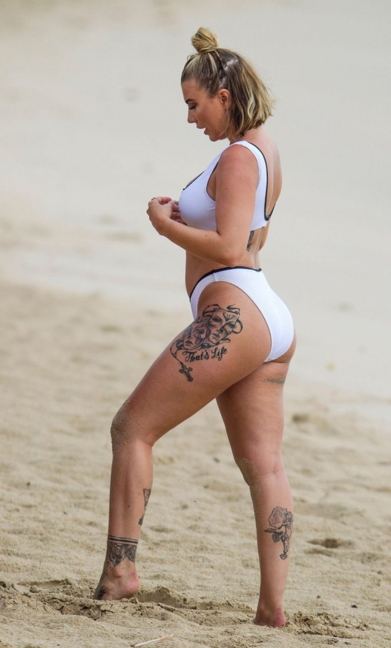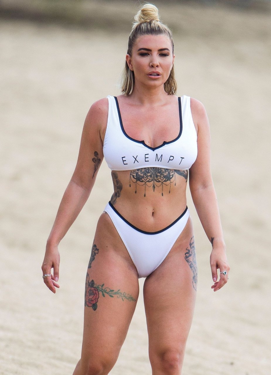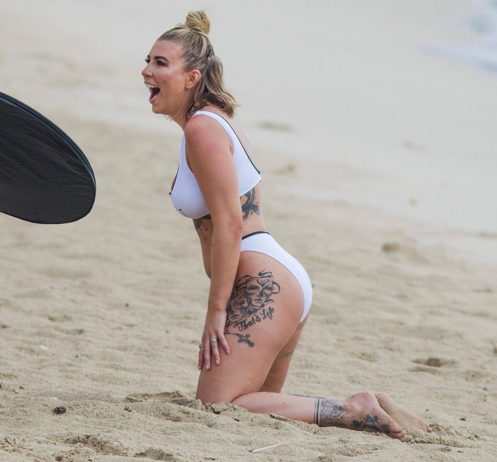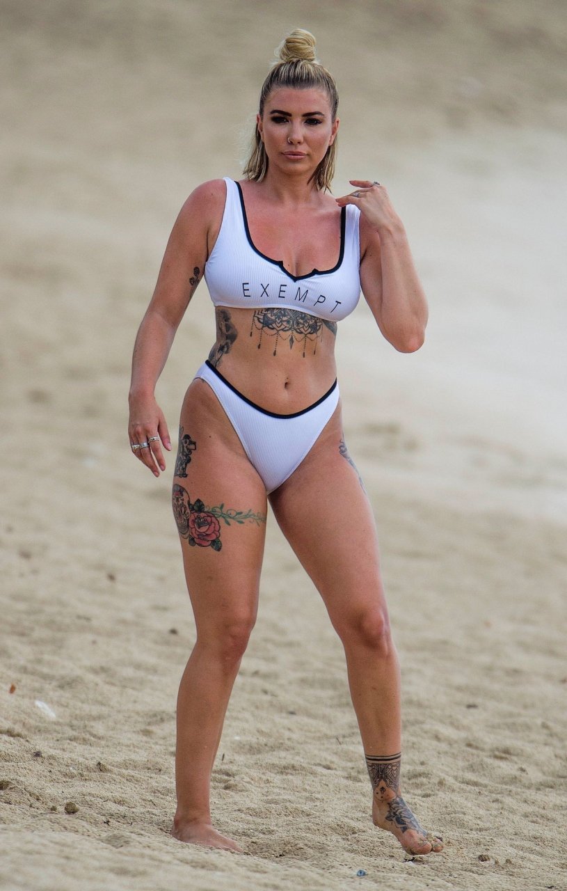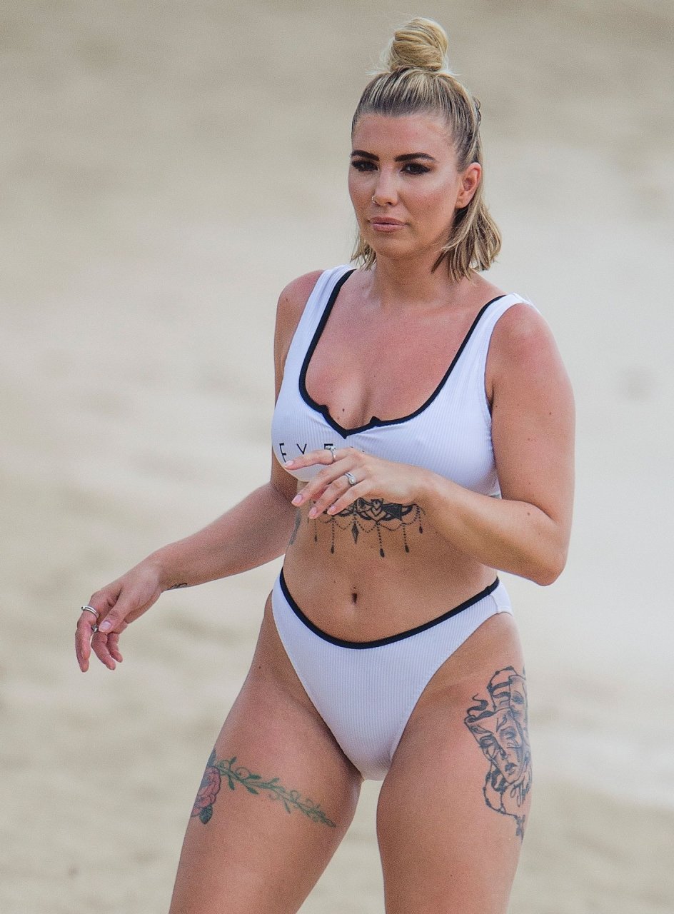Olivia Buckland luce un sexy bikini blanco hoy mientras continúa sus vacaciones en Barbados, 25/07/2019. La estrella británica pasó el rato en la playa para tomar un poco de sol con su top deportivo que dice “Exempt.”