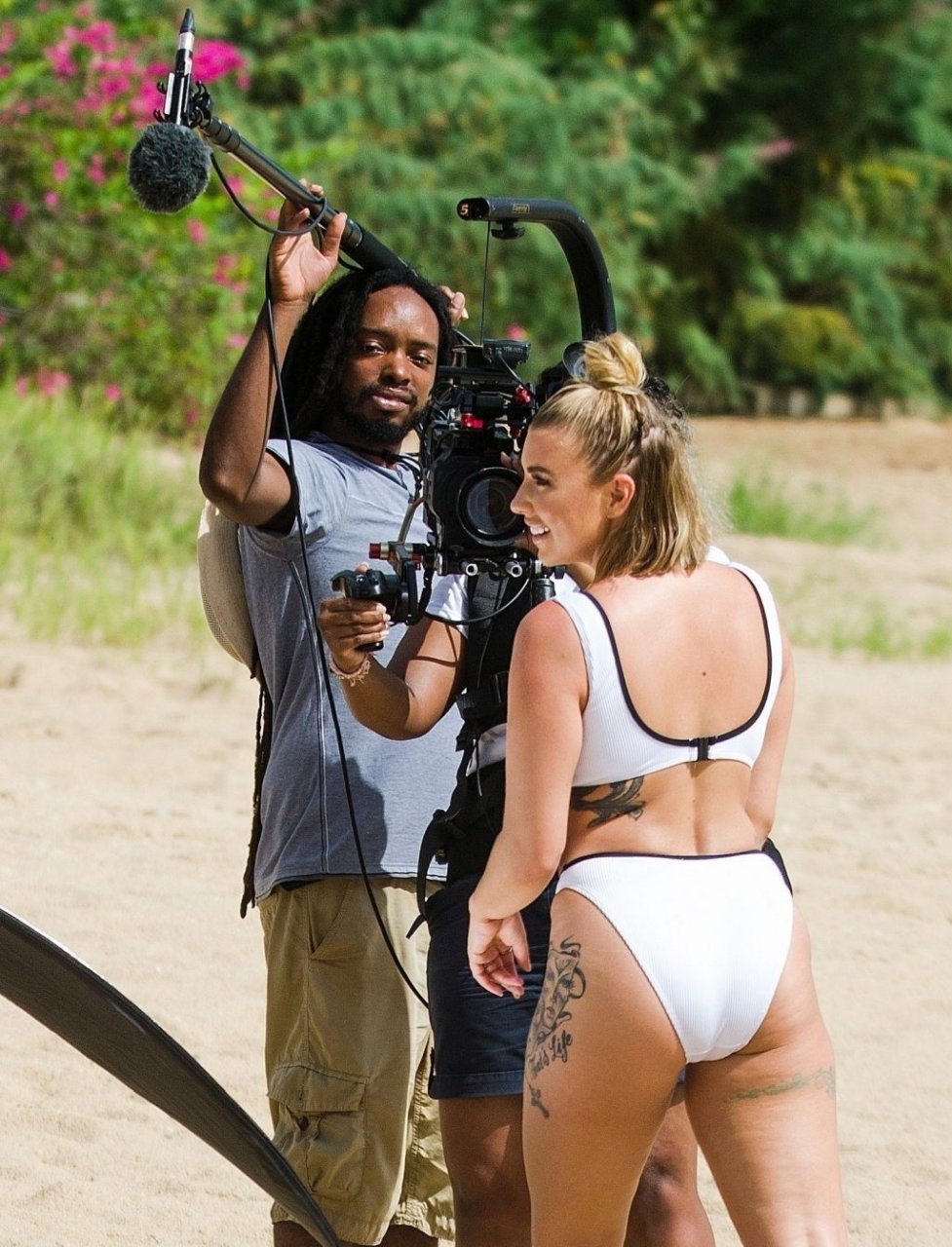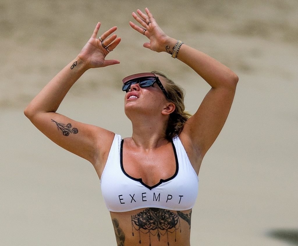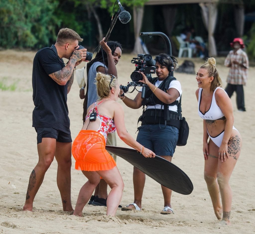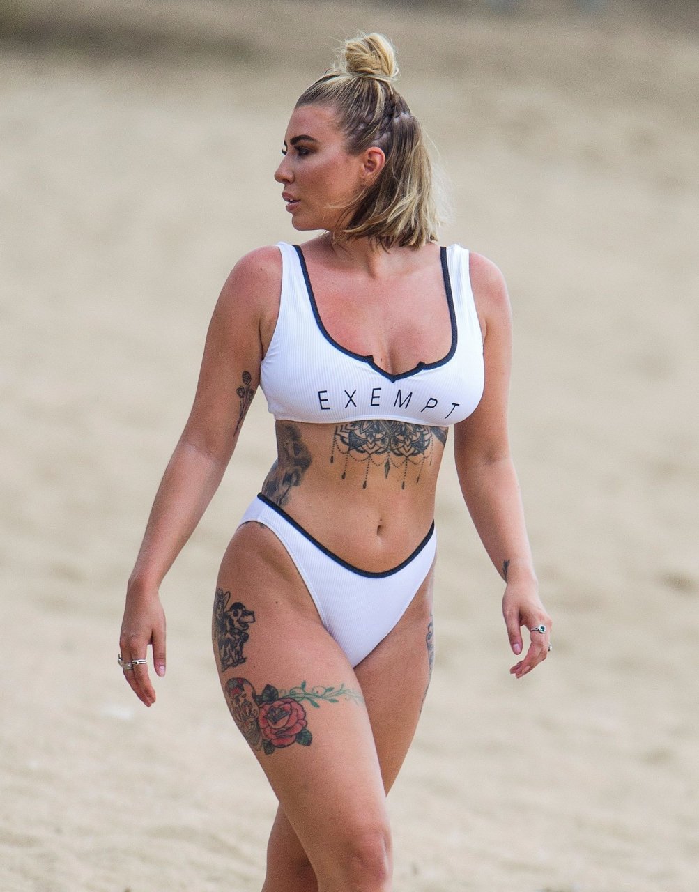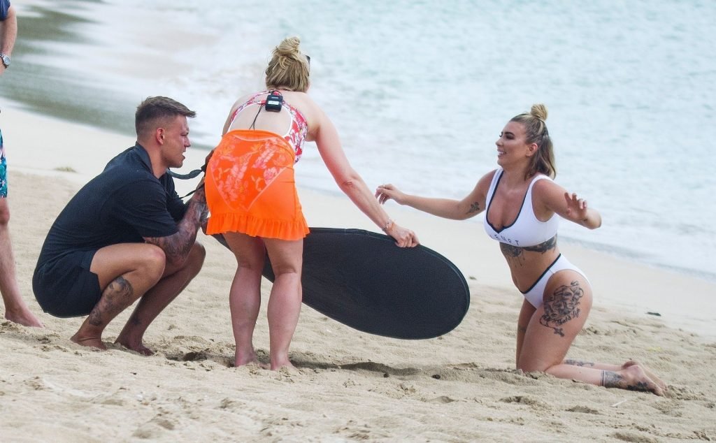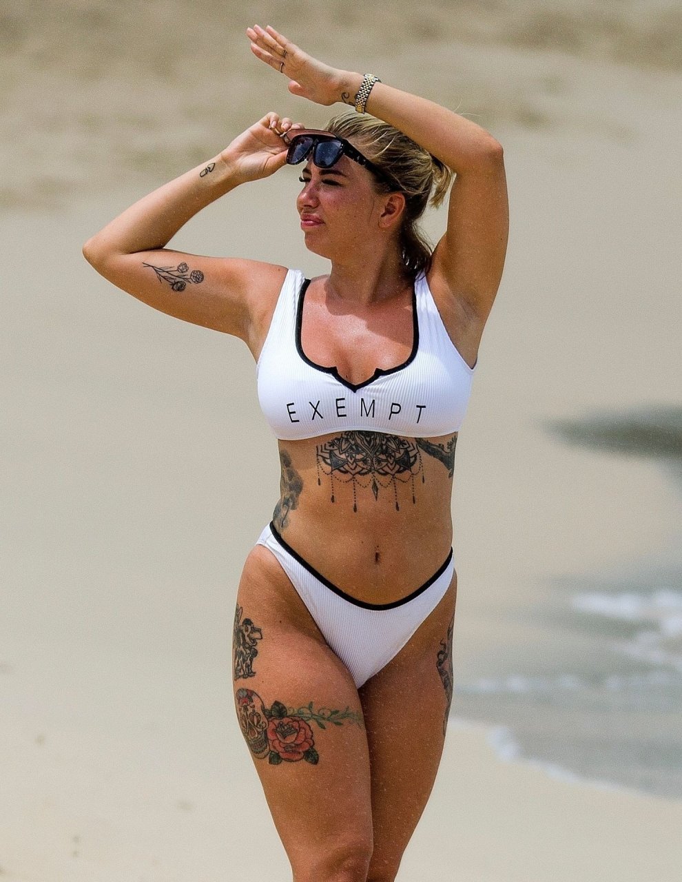 Olivia Buckland luce un sexy bikini blanco hoy mientras continúa sus vacaciones en Barbados, 25/07/2019. La estrella británica pasó el rato en la playa para tomar un poco de sol con su top deportivo que dice “Exempt.”