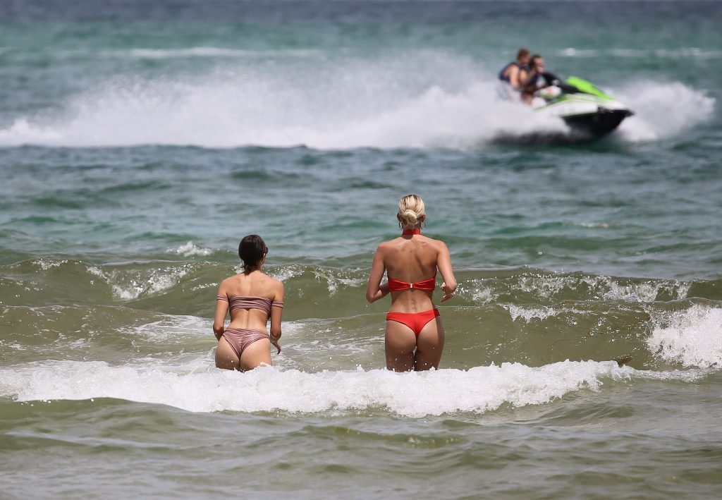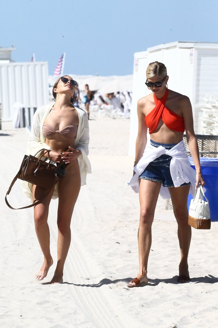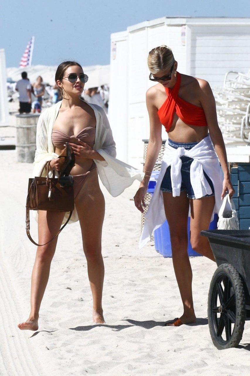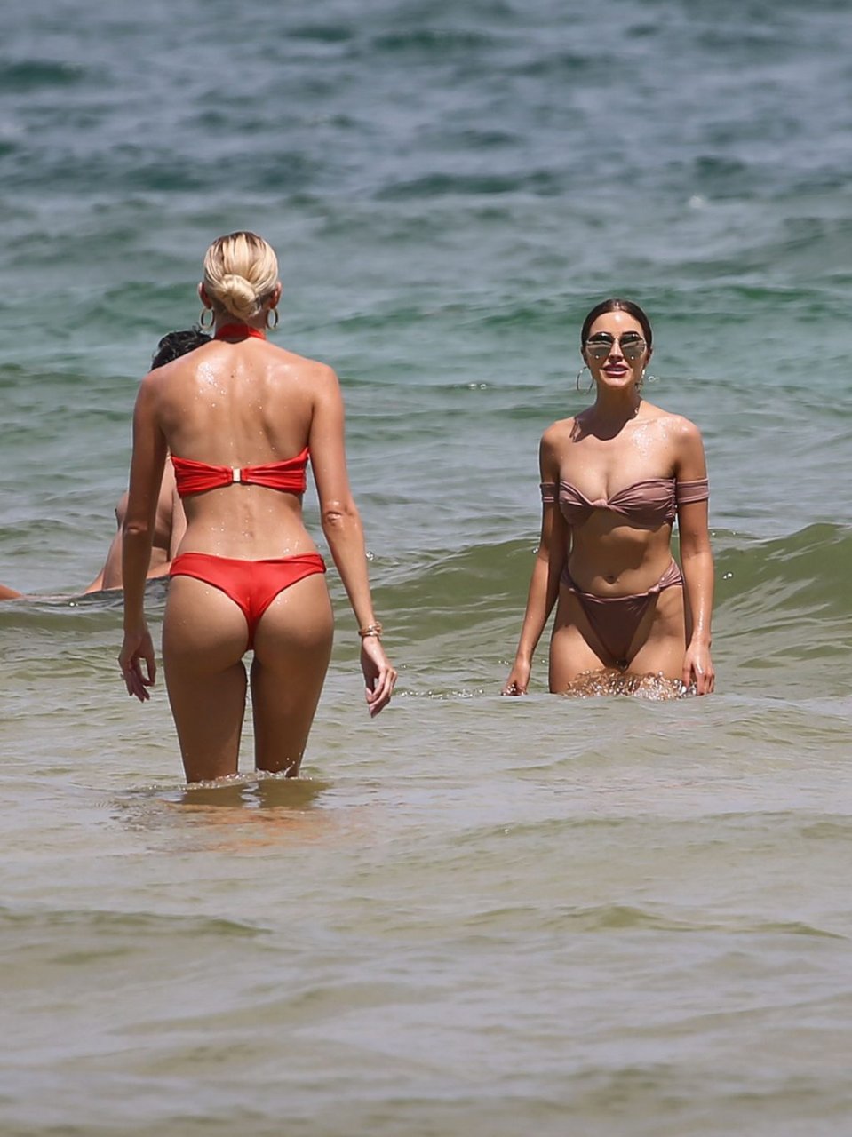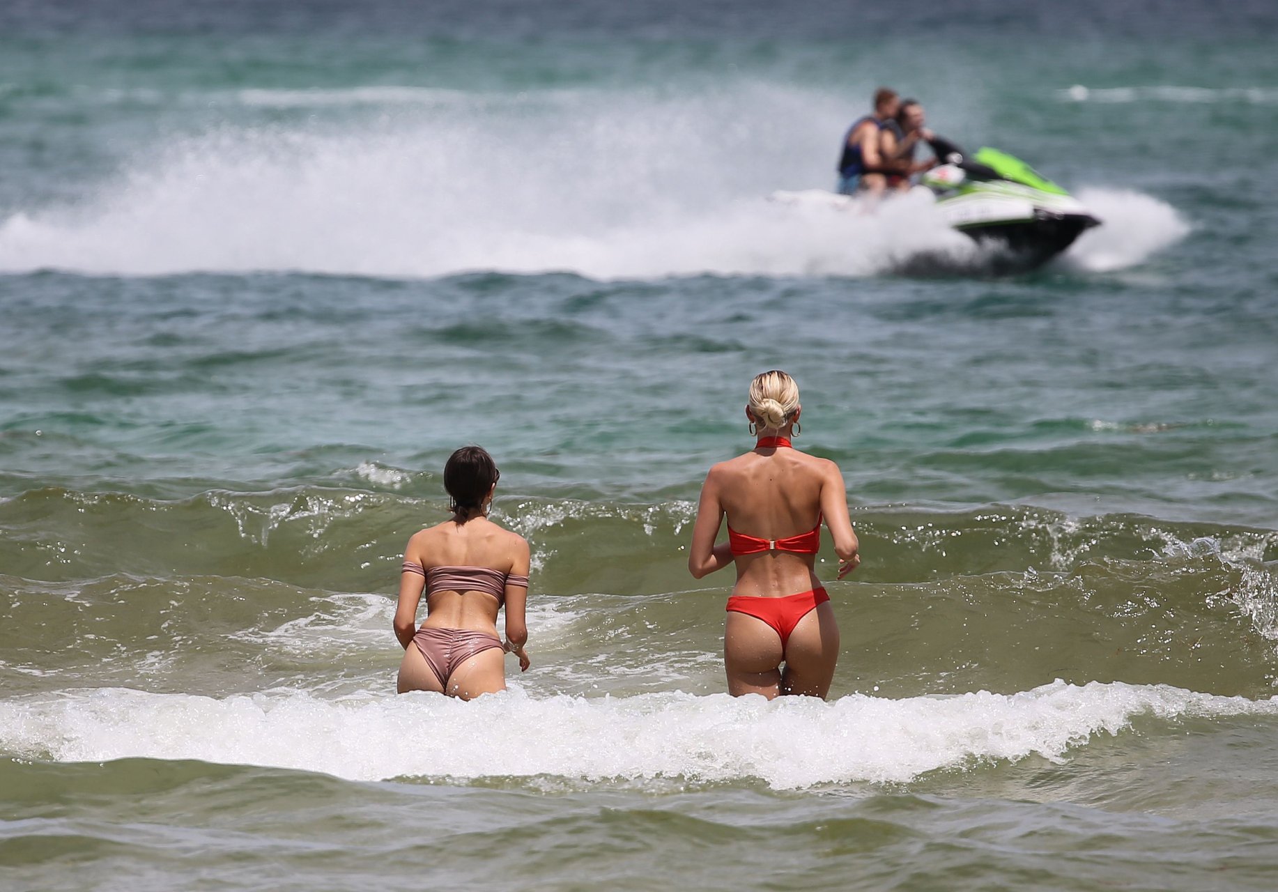 Olivia Culpo y Devon Windsor fueron vistas usando bikinis reveladores mientras se daban un chapuzón en el océano en Miami, 13/08/2018.