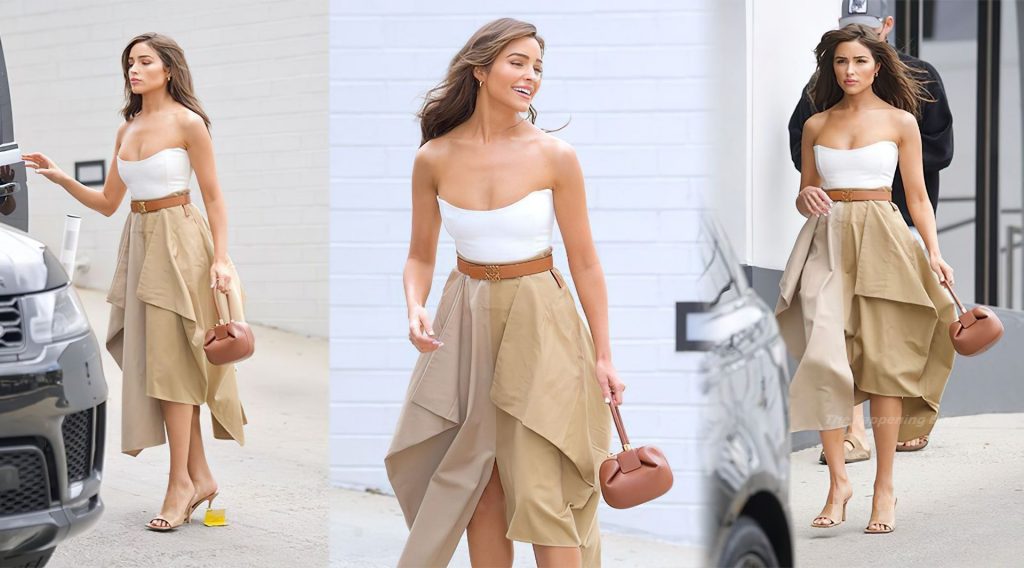 Olivia Culpo fue vista con una elegante blusa blanca y una falda beige ondeante mientras salía de una reunión de negocios en Beverly Hills el lunes.