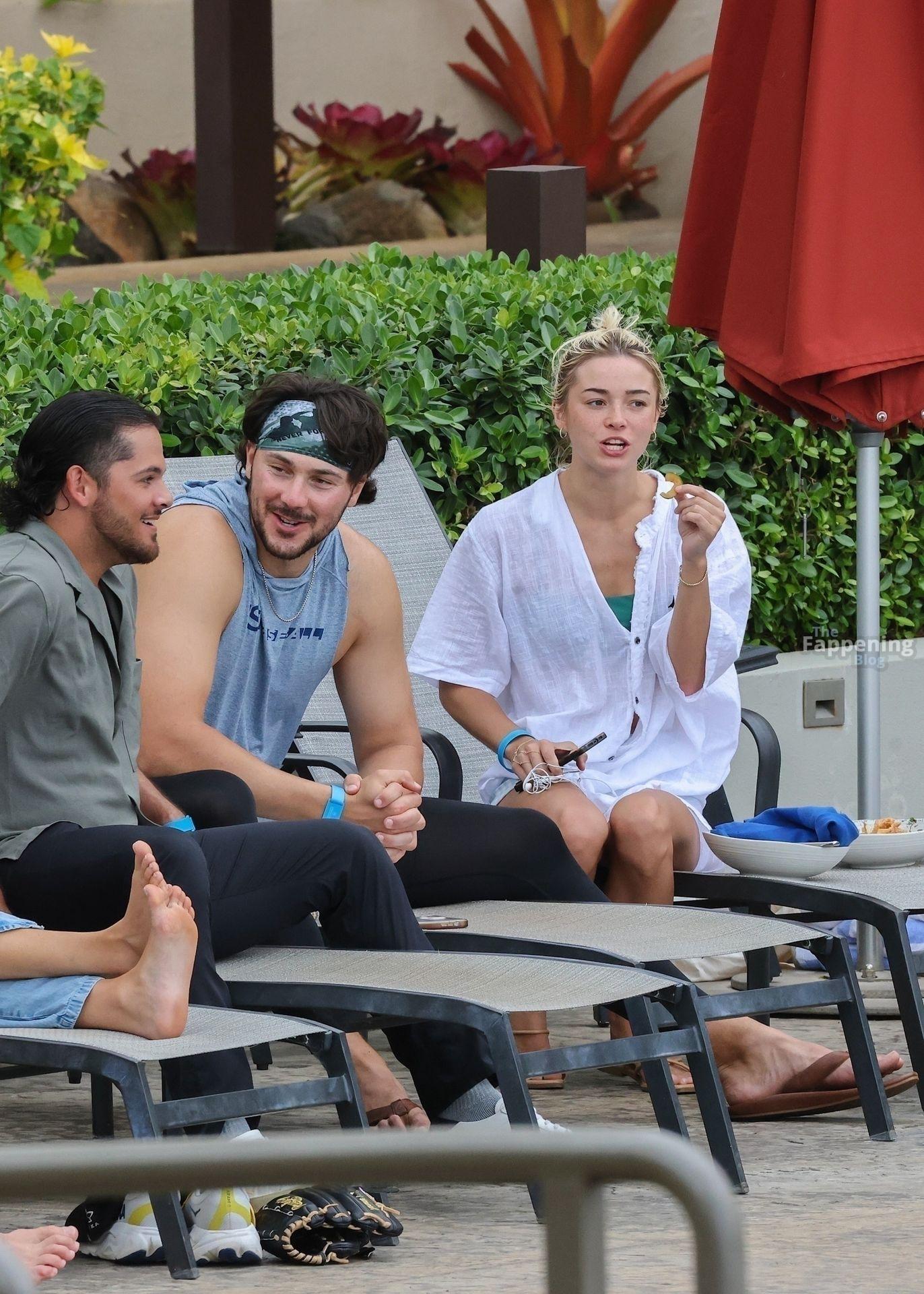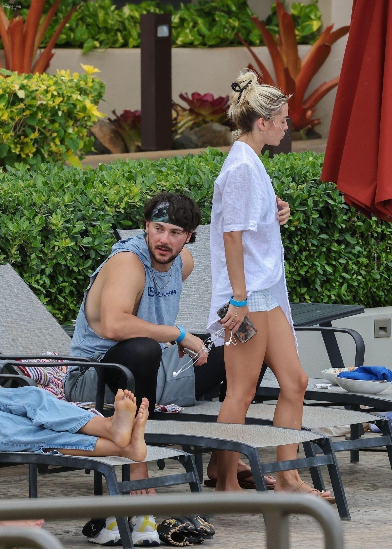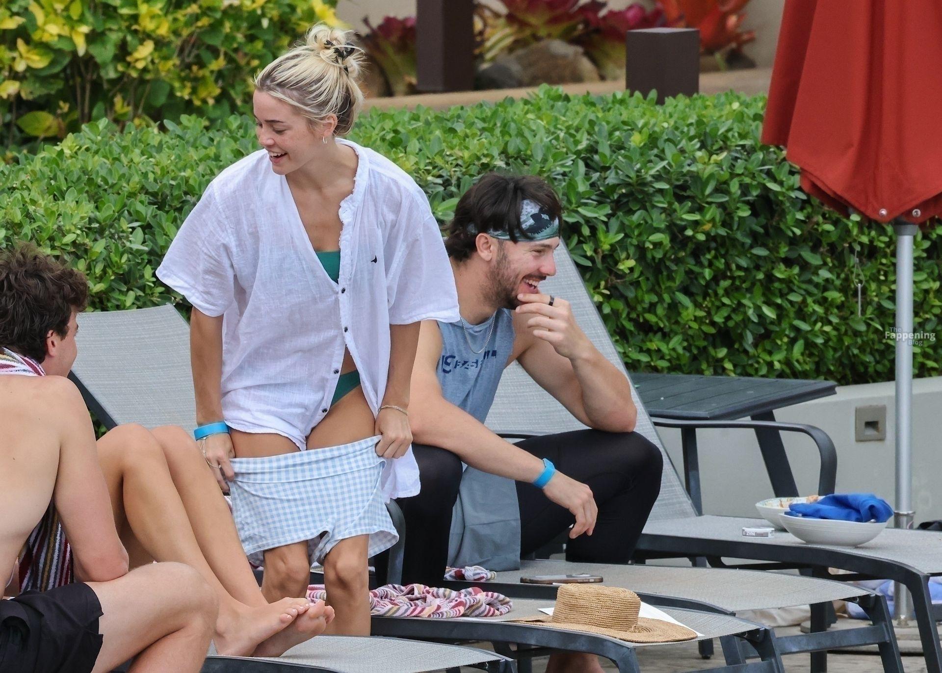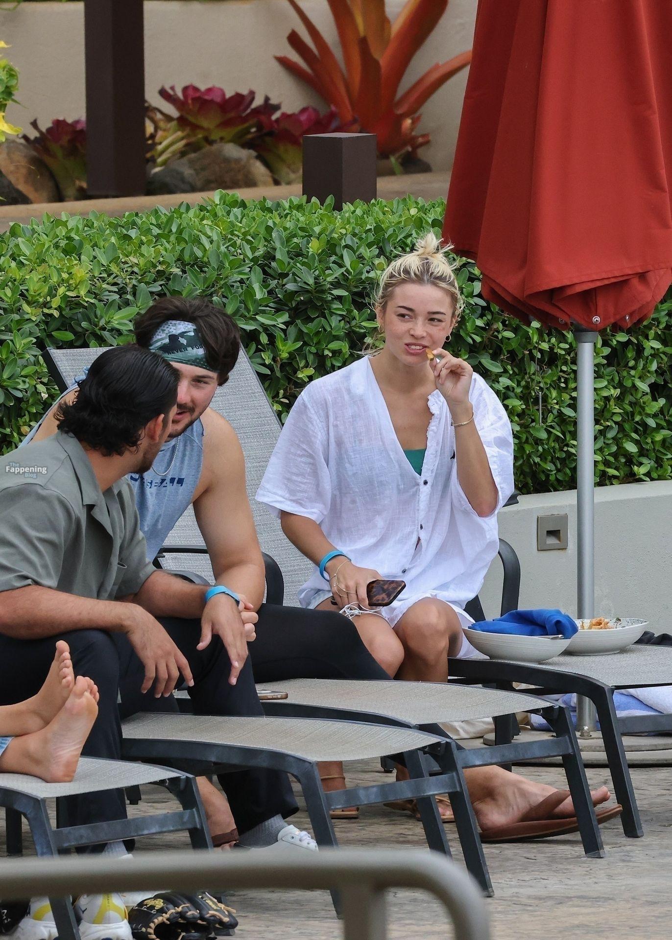 Olivia Dunne y su novio, el lanzador de la MLB Paul Skenes, disfrutan junto a la piscina en Kauai con amigos como el lanzador de los Pirates Jared Jones. La ex gimnasta de LSU de 23 años luce un bikini verde y un sombrero de paja mientras Paul mantiene un estilo casual con una camiseta sin mangas.