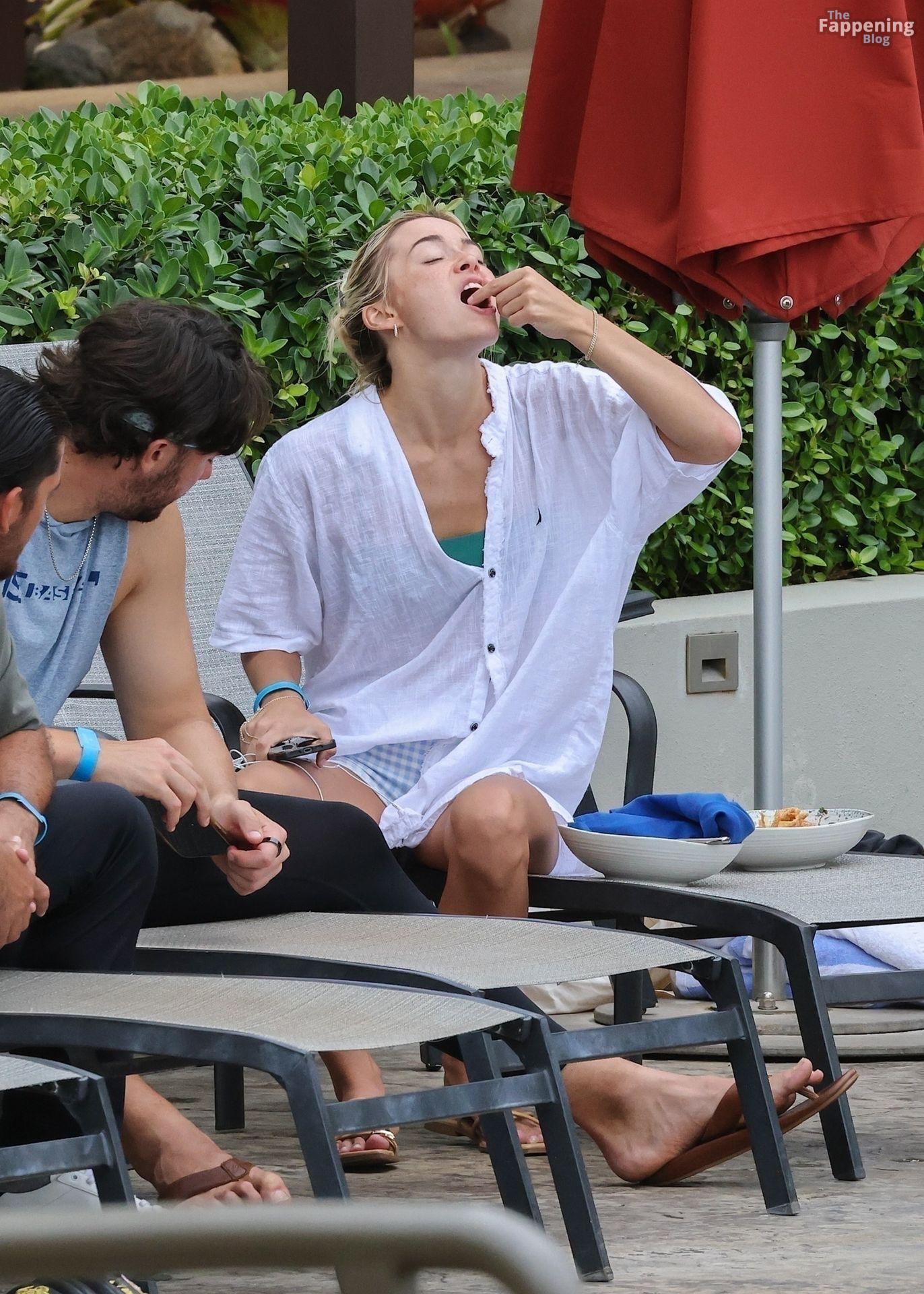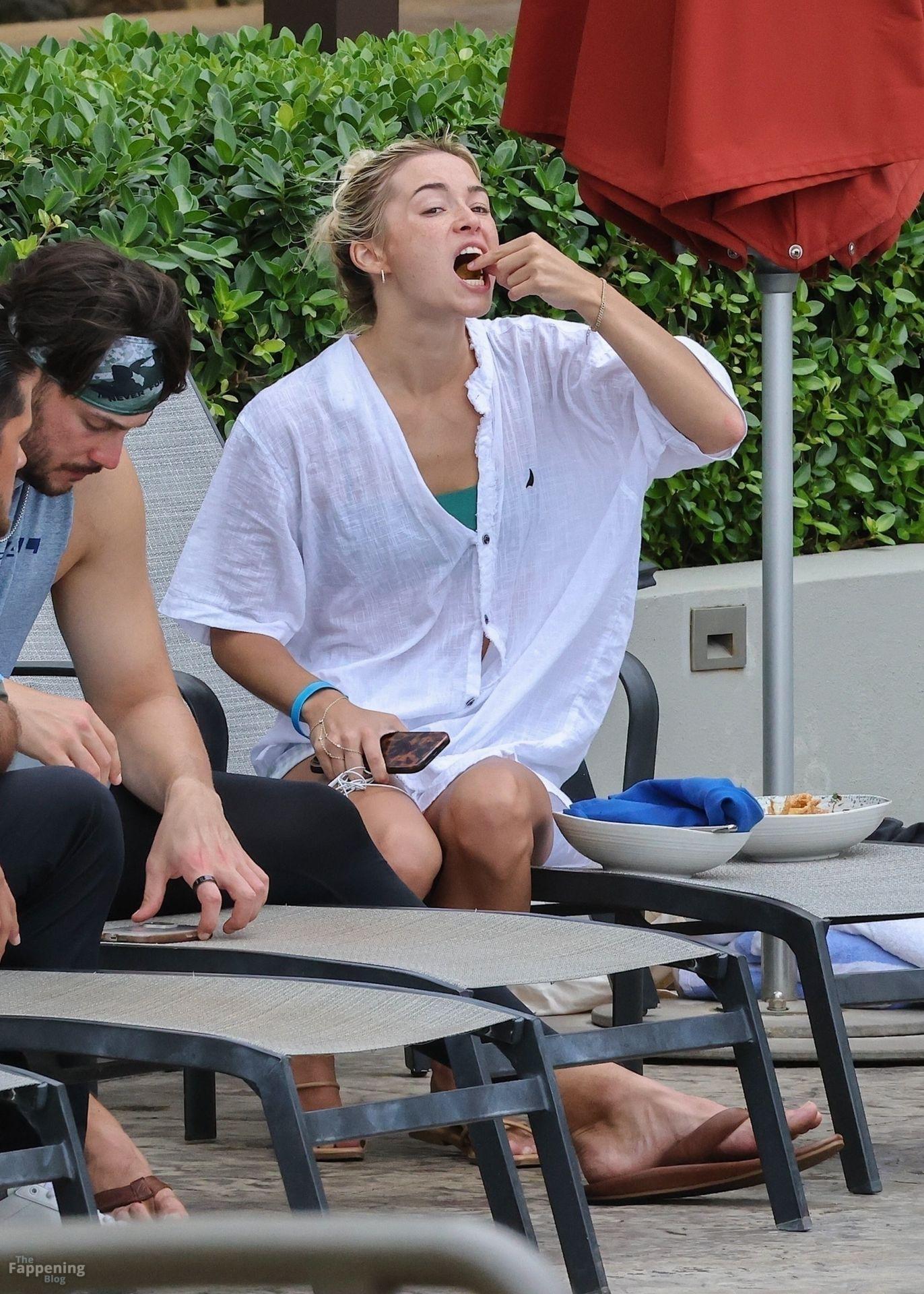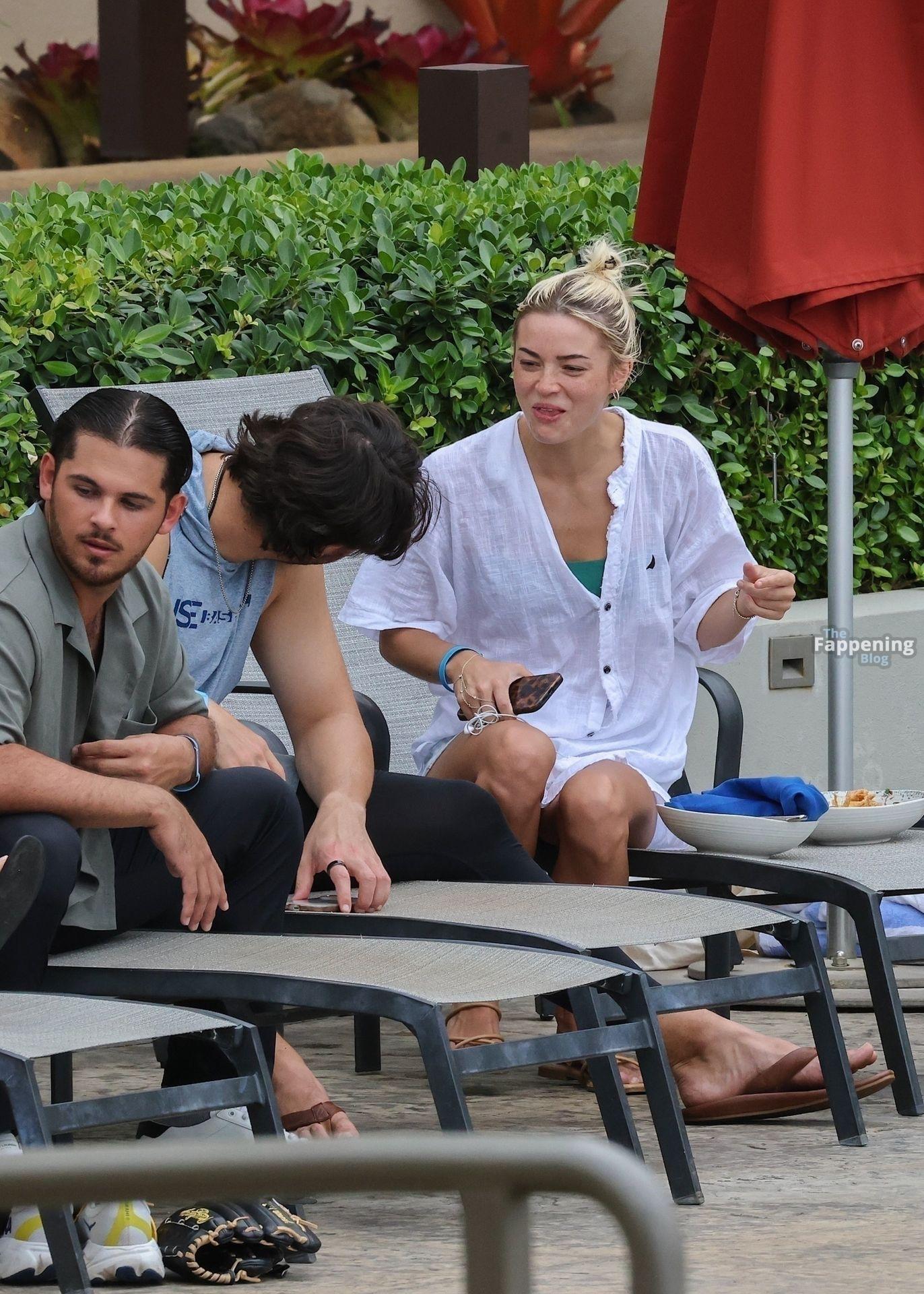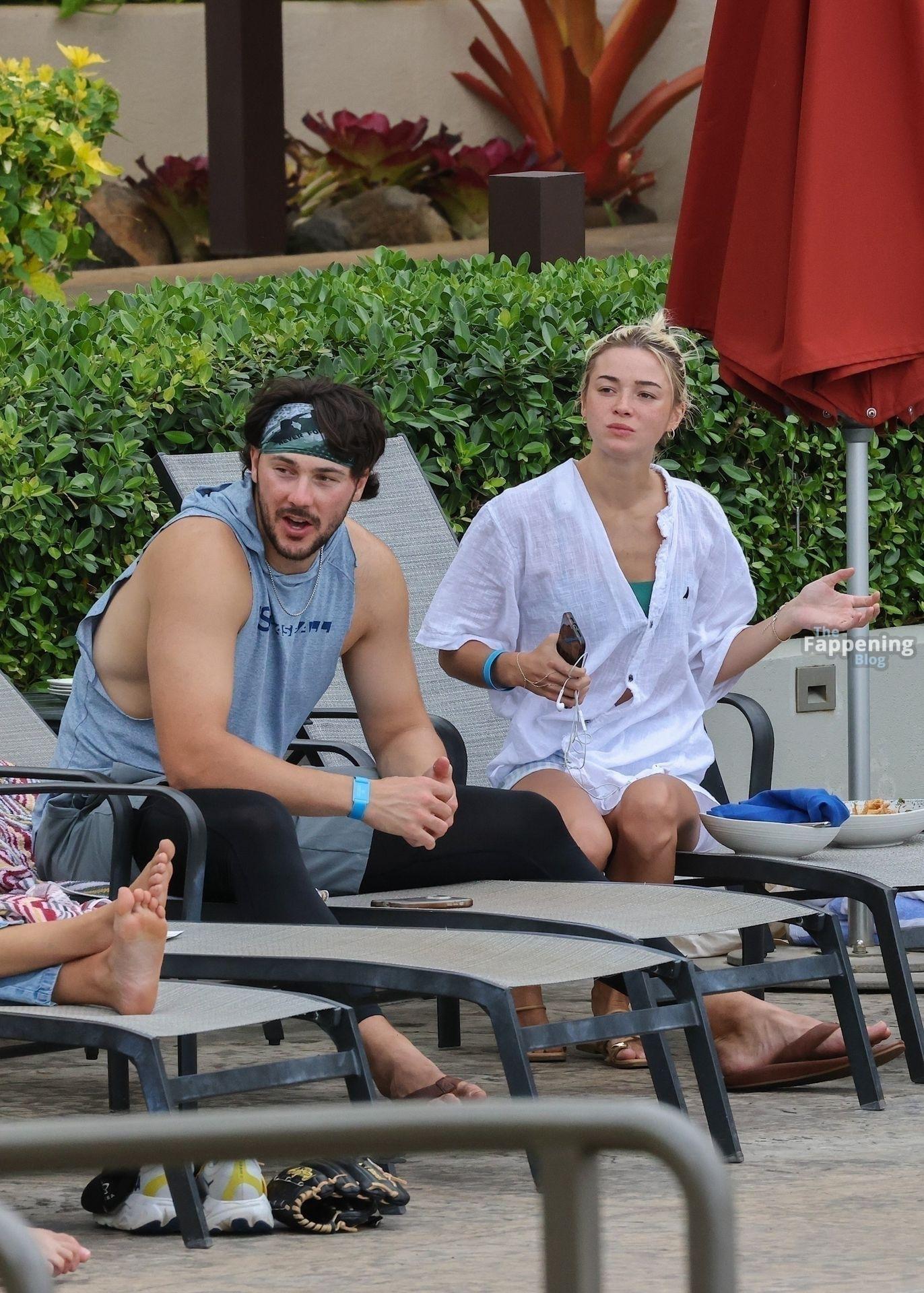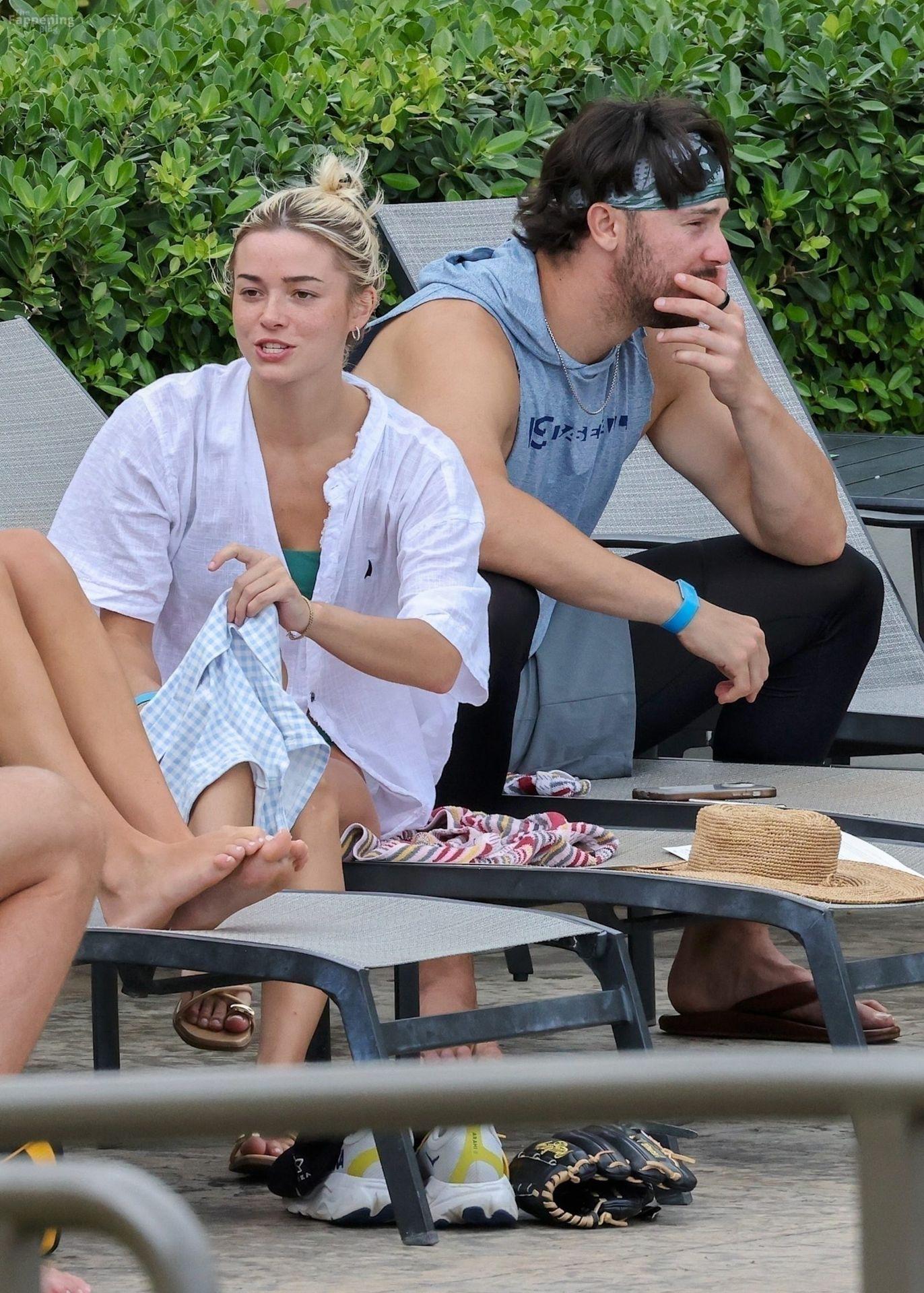 Olivia Dunne y su novio, el lanzador de la MLB Paul Skenes, disfrutan junto a la piscina en Kauai con amigos como el lanzador de los Pirates Jared Jones. La ex gimnasta de LSU de 23 años luce un bikini verde y un sombrero de paja mientras Paul mantiene un estilo casual con una camiseta sin mangas.
