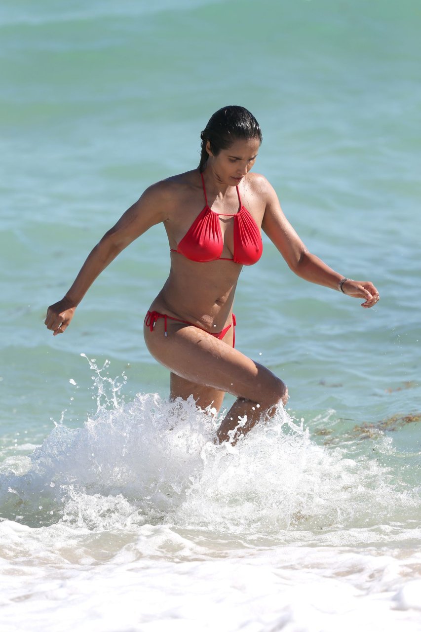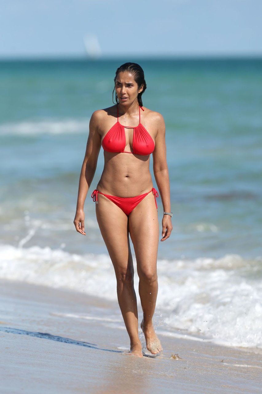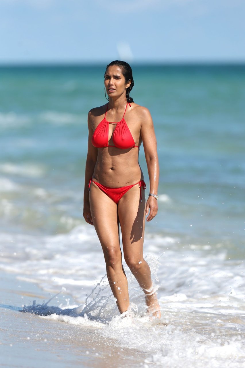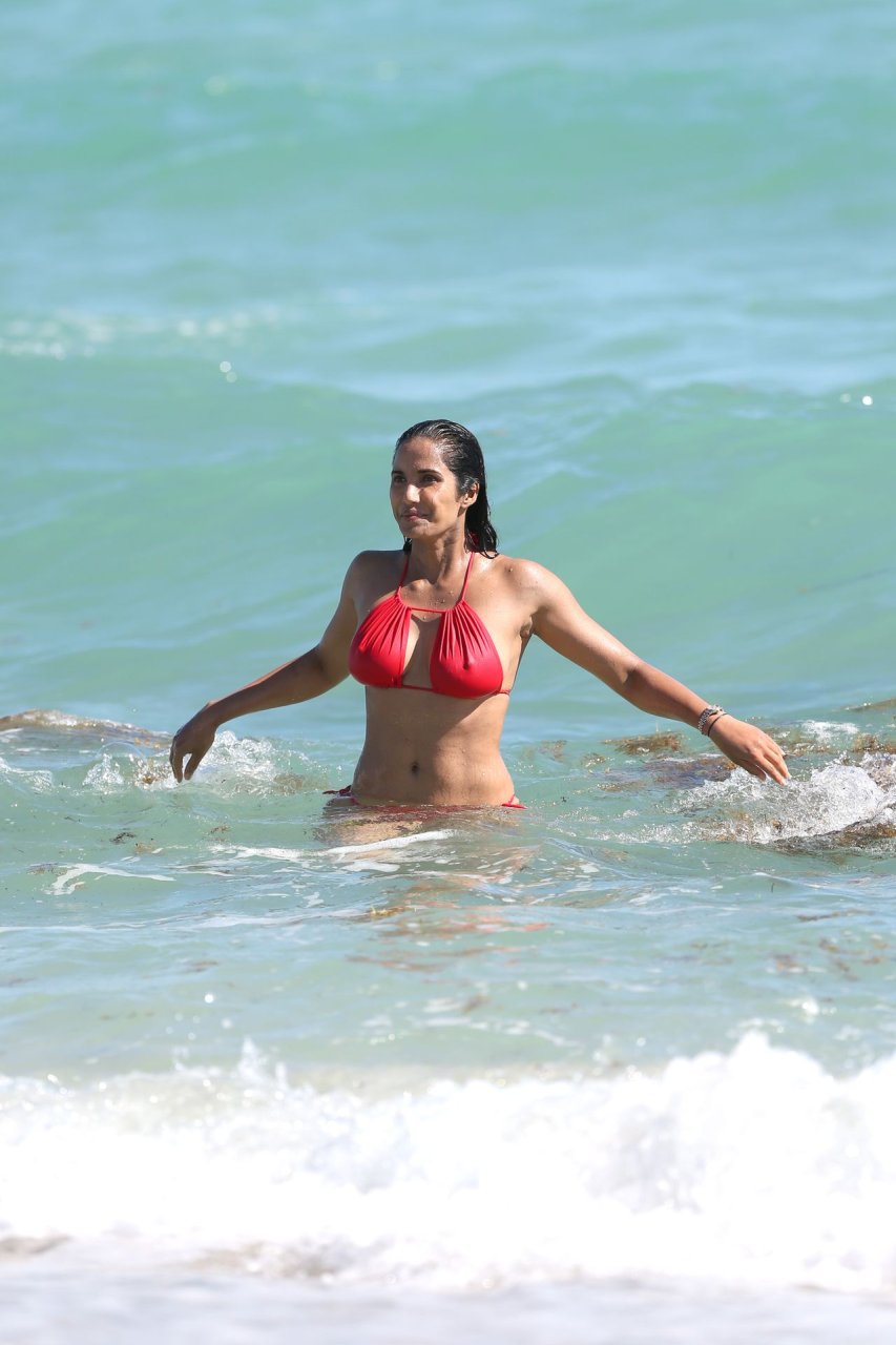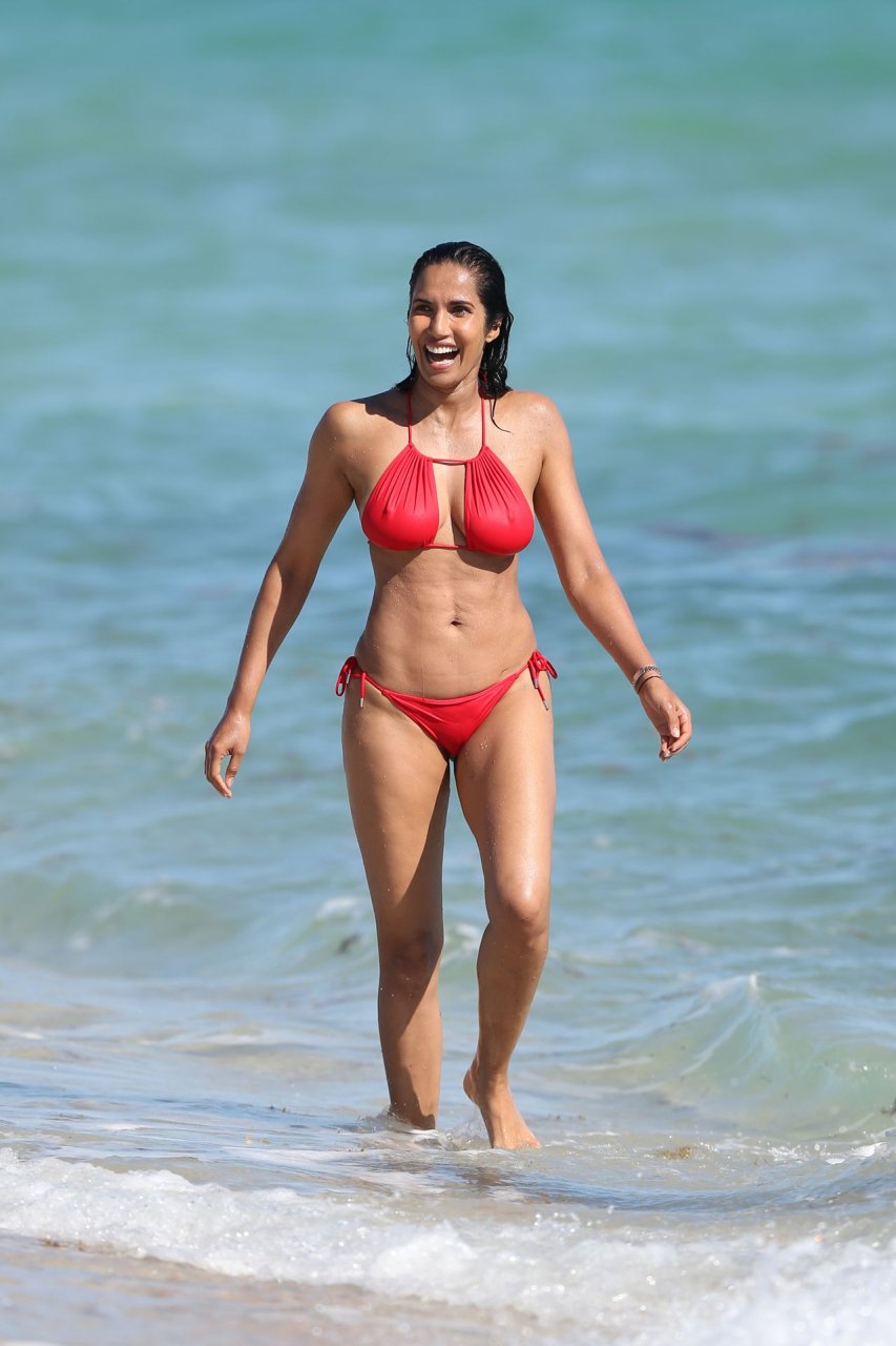 Padma Lakshmi con curvas está que arde mientras muestra su figura con un bikini rojo revelador mientras se da un chapuzón en Miami Beach, 01/07/2019. La estrella del reality show de 48 años incluso tiene su propio momento Baywatch mientras corría por la playa a toda velocidad.