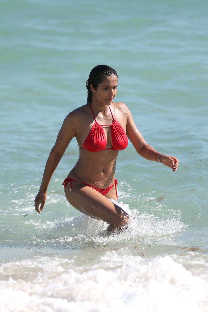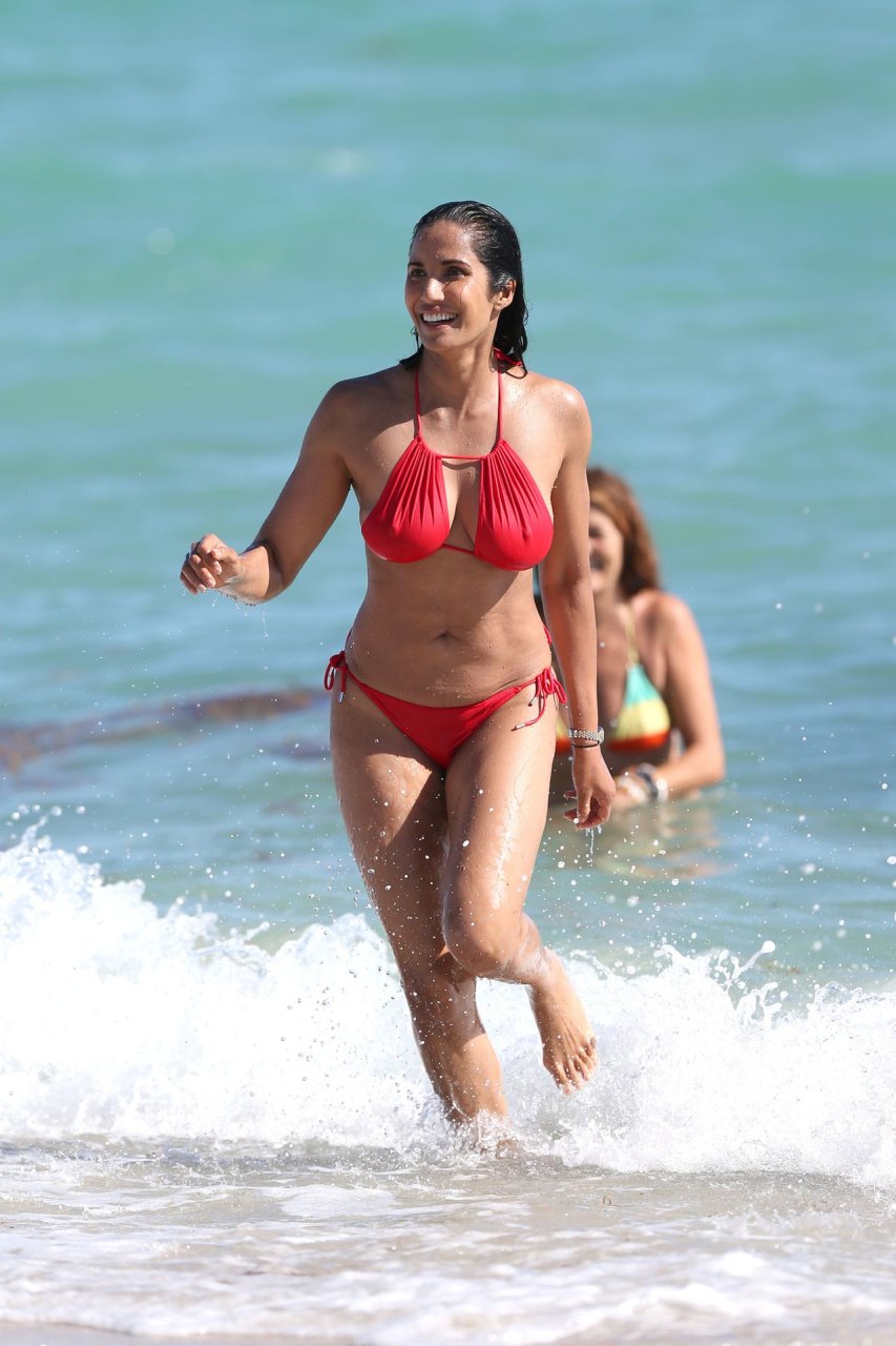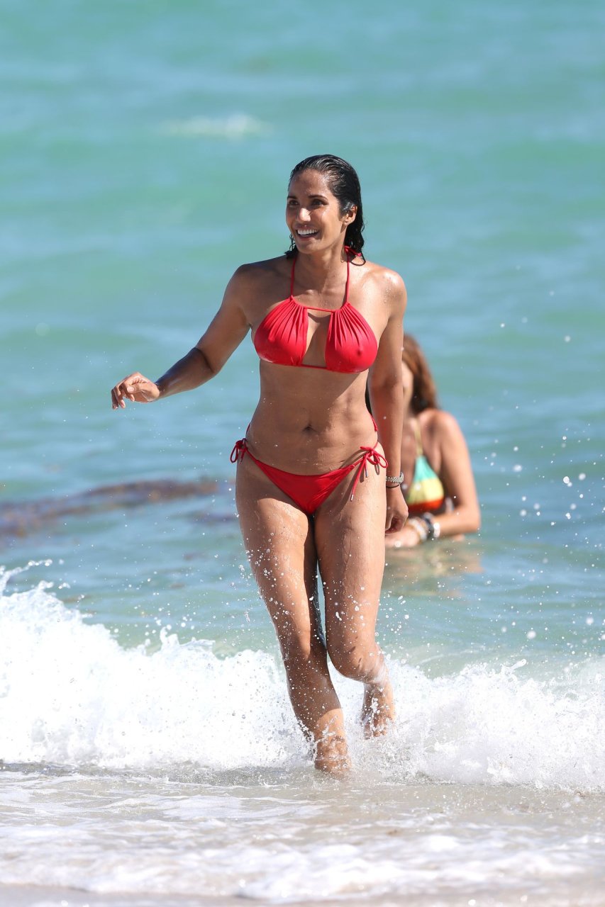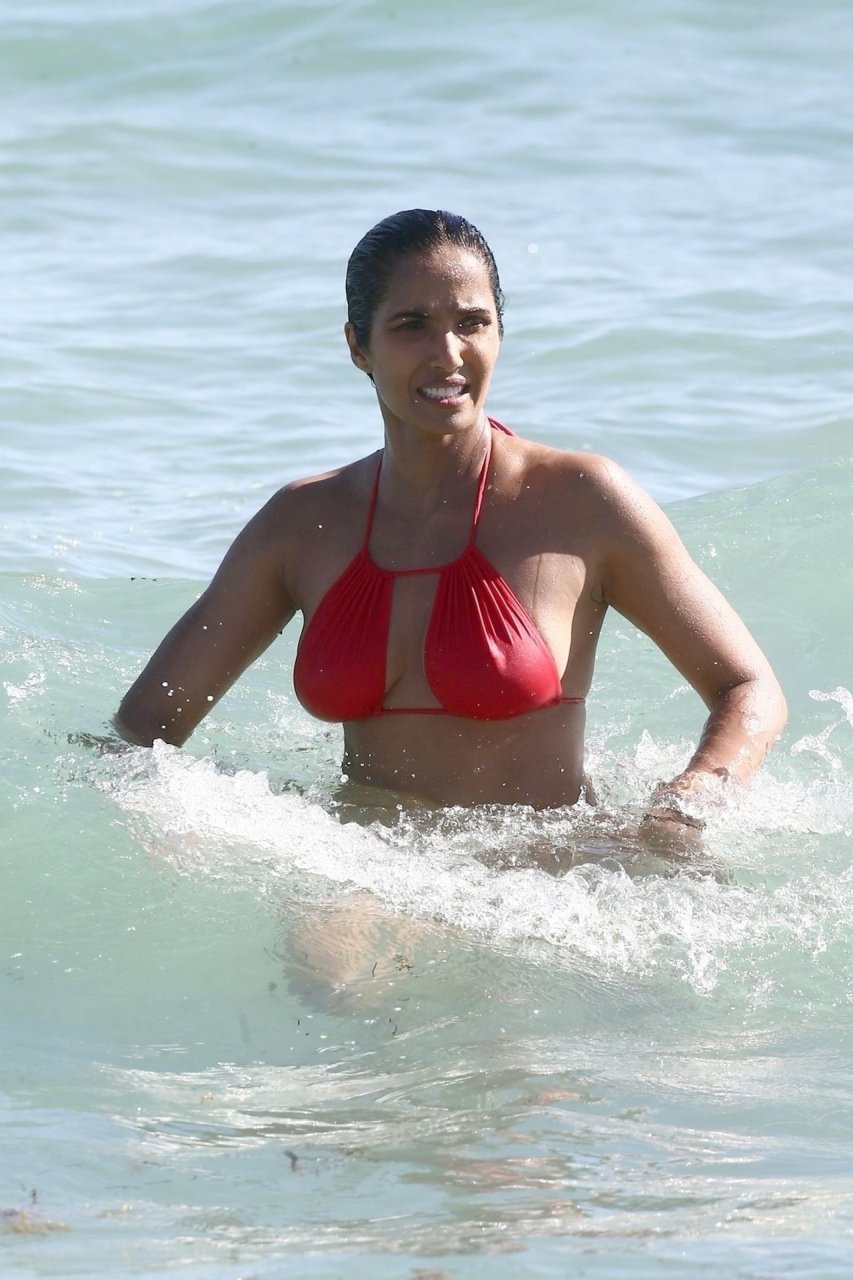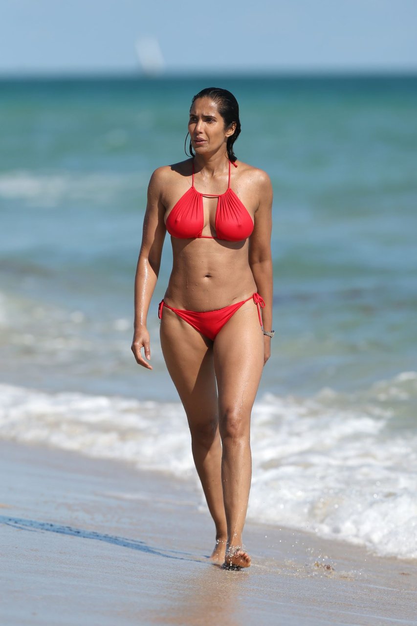 Padma Lakshmi con curvas está que arde mientras muestra su figura con un bikini rojo revelador mientras se da un chapuzón en Miami Beach, 01/07/2019. La estrella del reality show de 48 años incluso tiene su propio momento Baywatch mientras corría por la playa a toda velocidad.