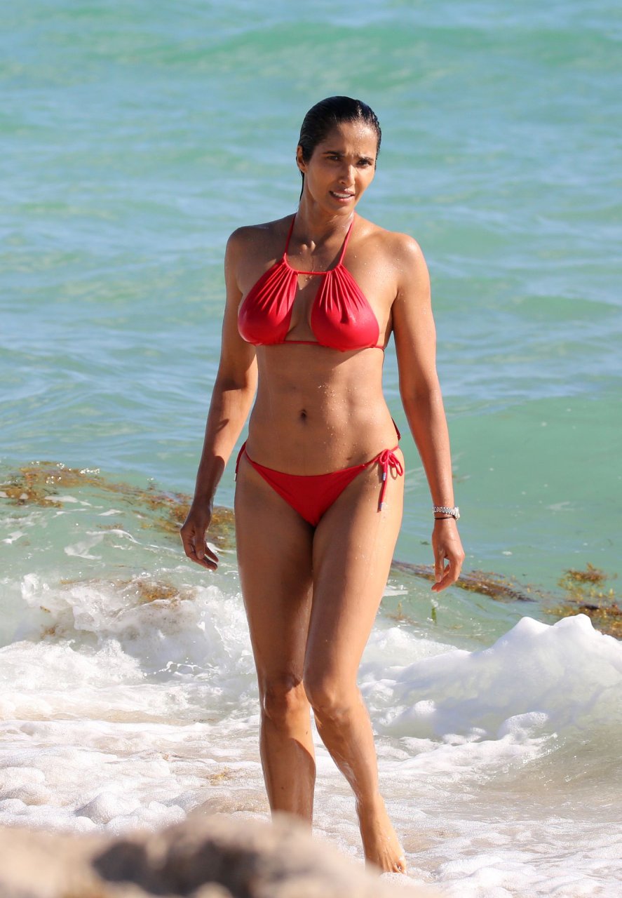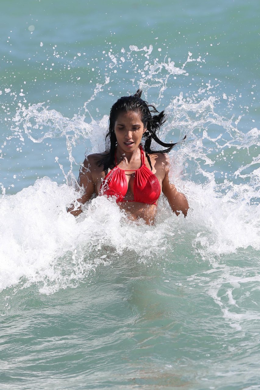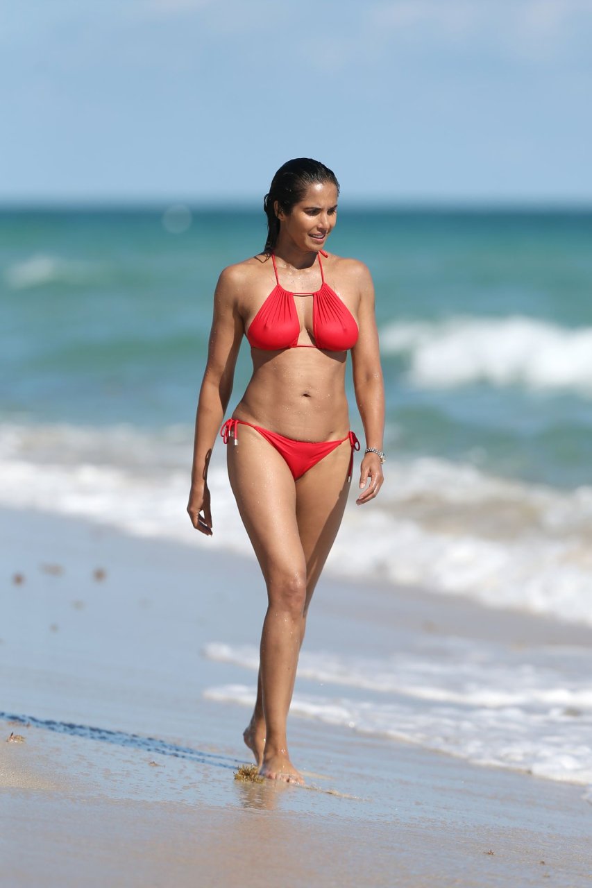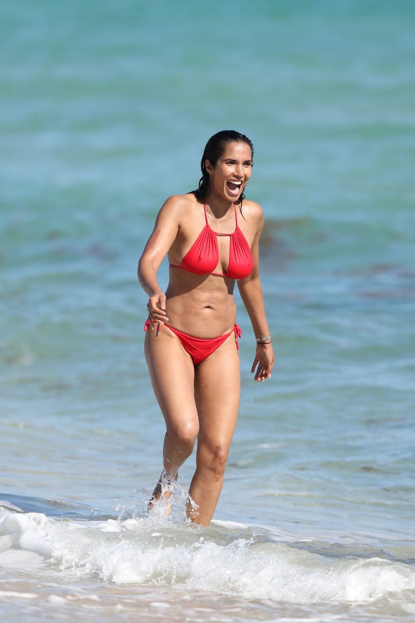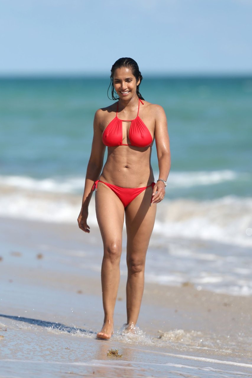 Padma Lakshmi con curvas está que arde mientras muestra su figura con un bikini rojo revelador mientras se da un chapuzón en Miami Beach, 01/07/2019. La estrella del reality show de 48 años incluso tiene su propio momento Baywatch mientras corría por la playa a toda velocidad.
