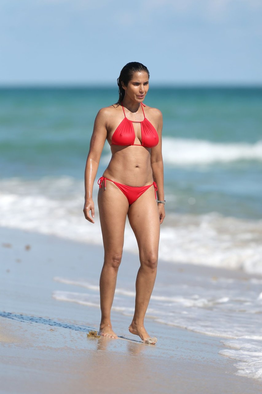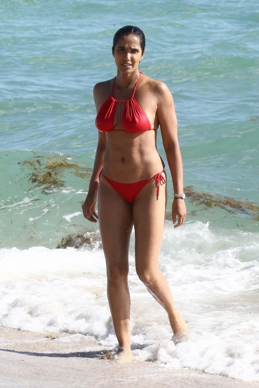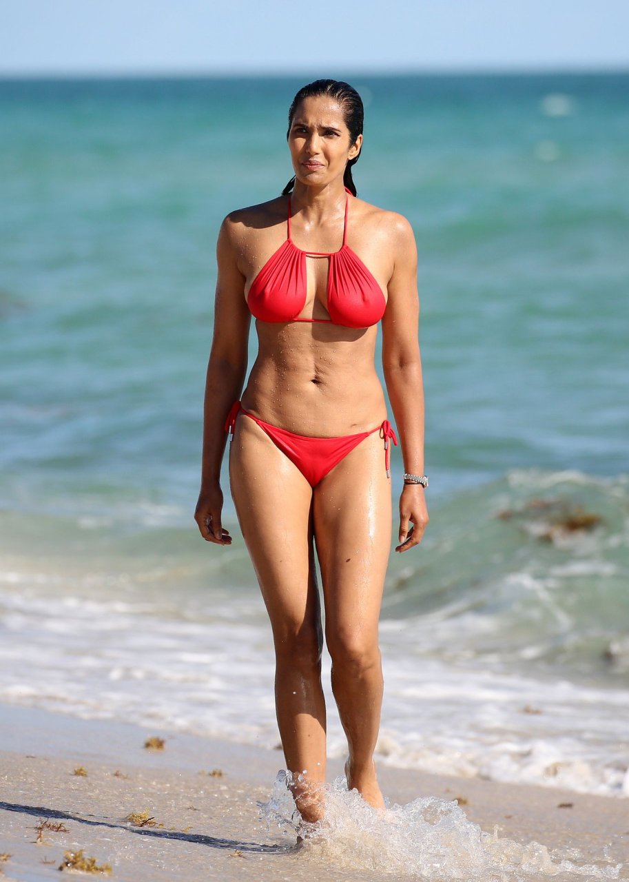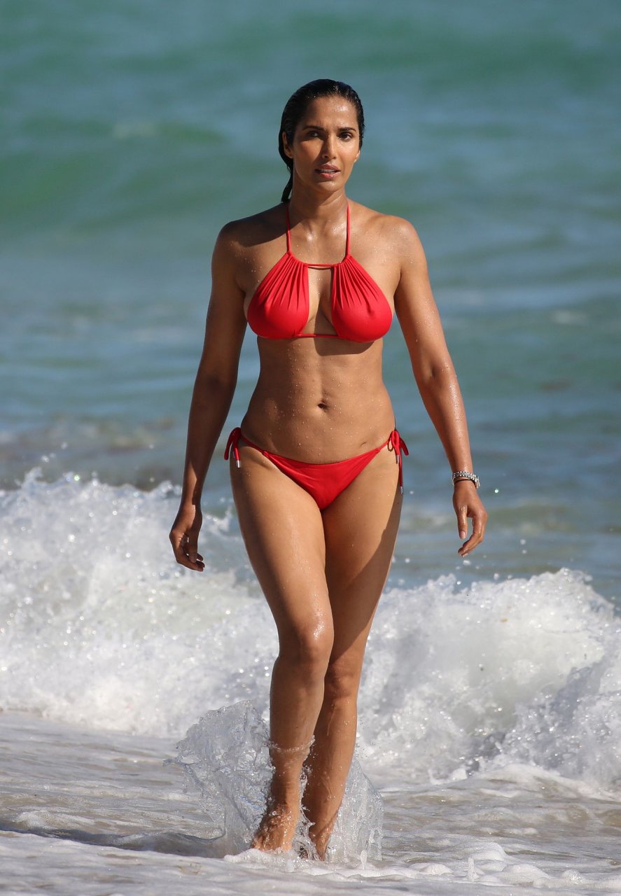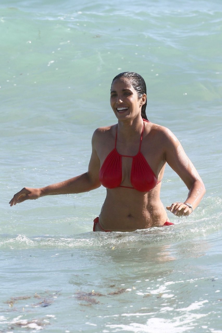 Padma Lakshmi con curvas está que arde mientras muestra su figura con un bikini rojo revelador mientras se da un chapuzón en Miami Beach, 01/07/2019. La estrella del reality show de 48 años incluso tiene su propio momento Baywatch mientras corría por la playa a toda velocidad.