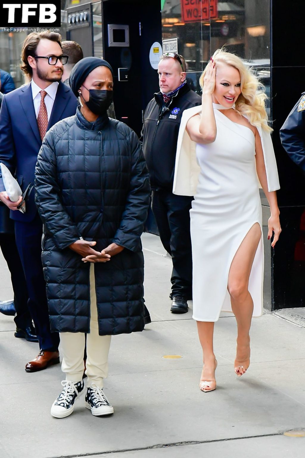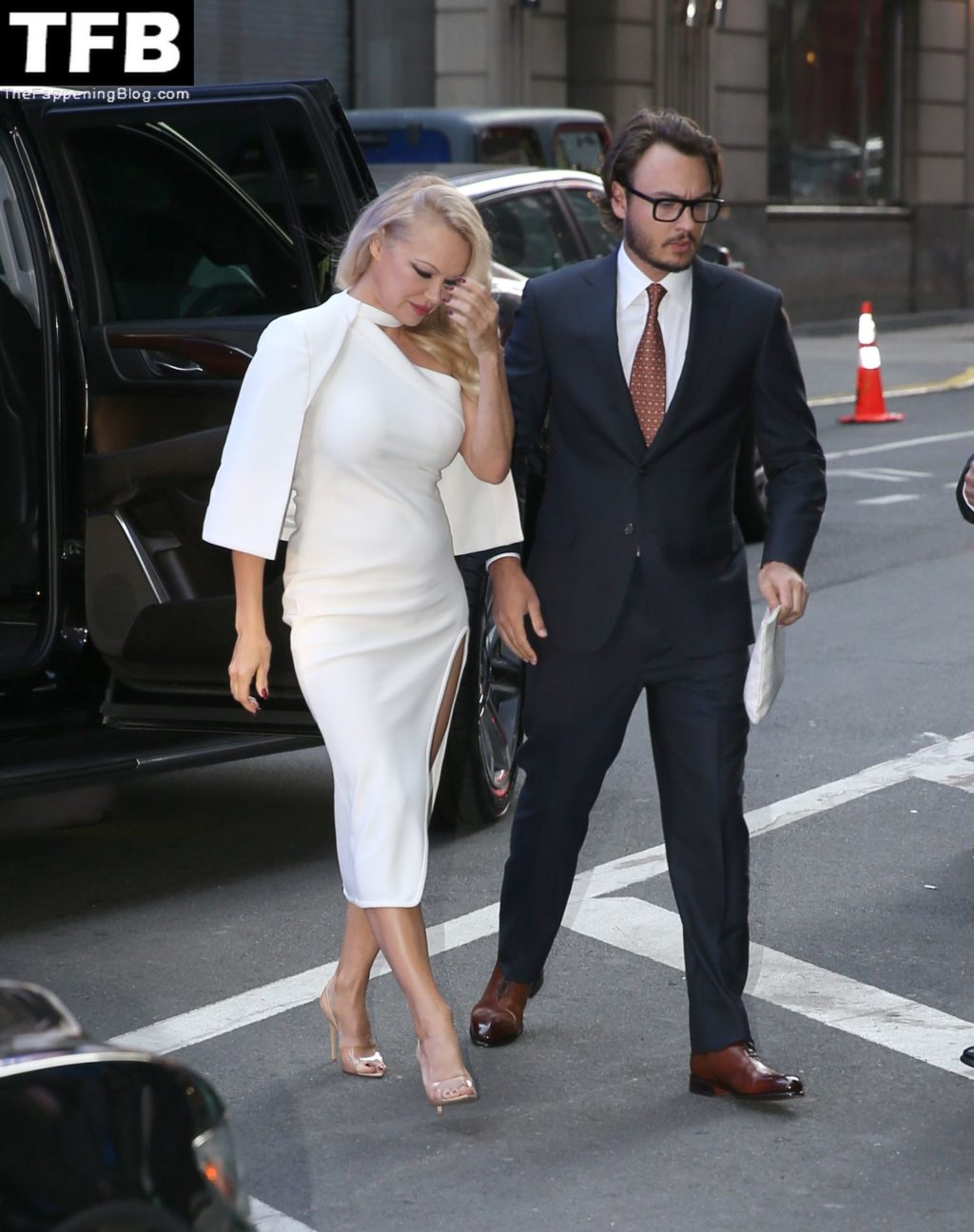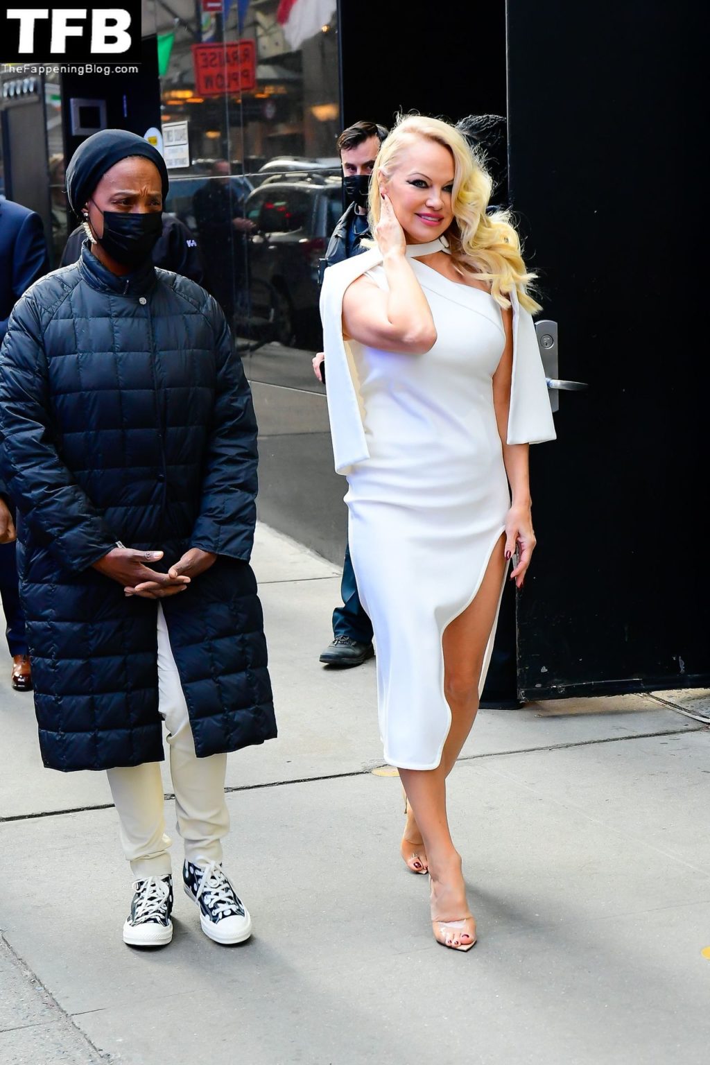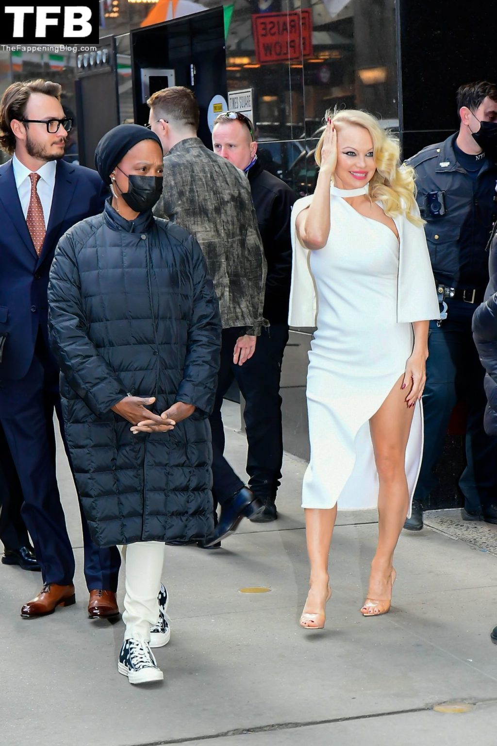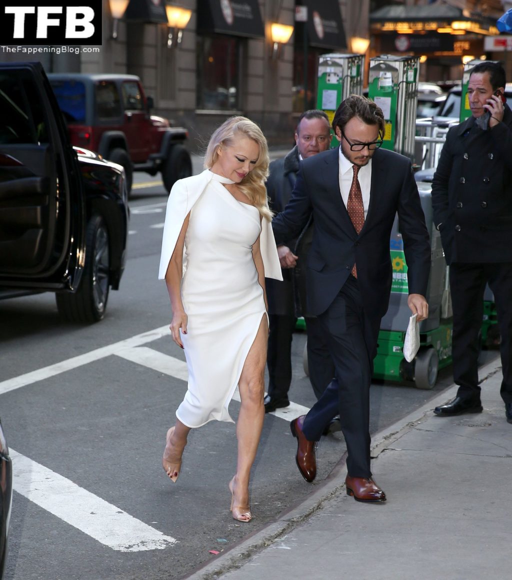 Pamela Anderson llega a Good Morning America en la ciudad de Nueva York, 23/03/2022. La actriz y modelo de “Baywatch” de 54 años llevaba un vestido blanco con un par de tacones transparentes.