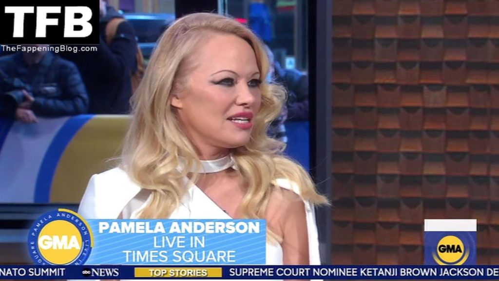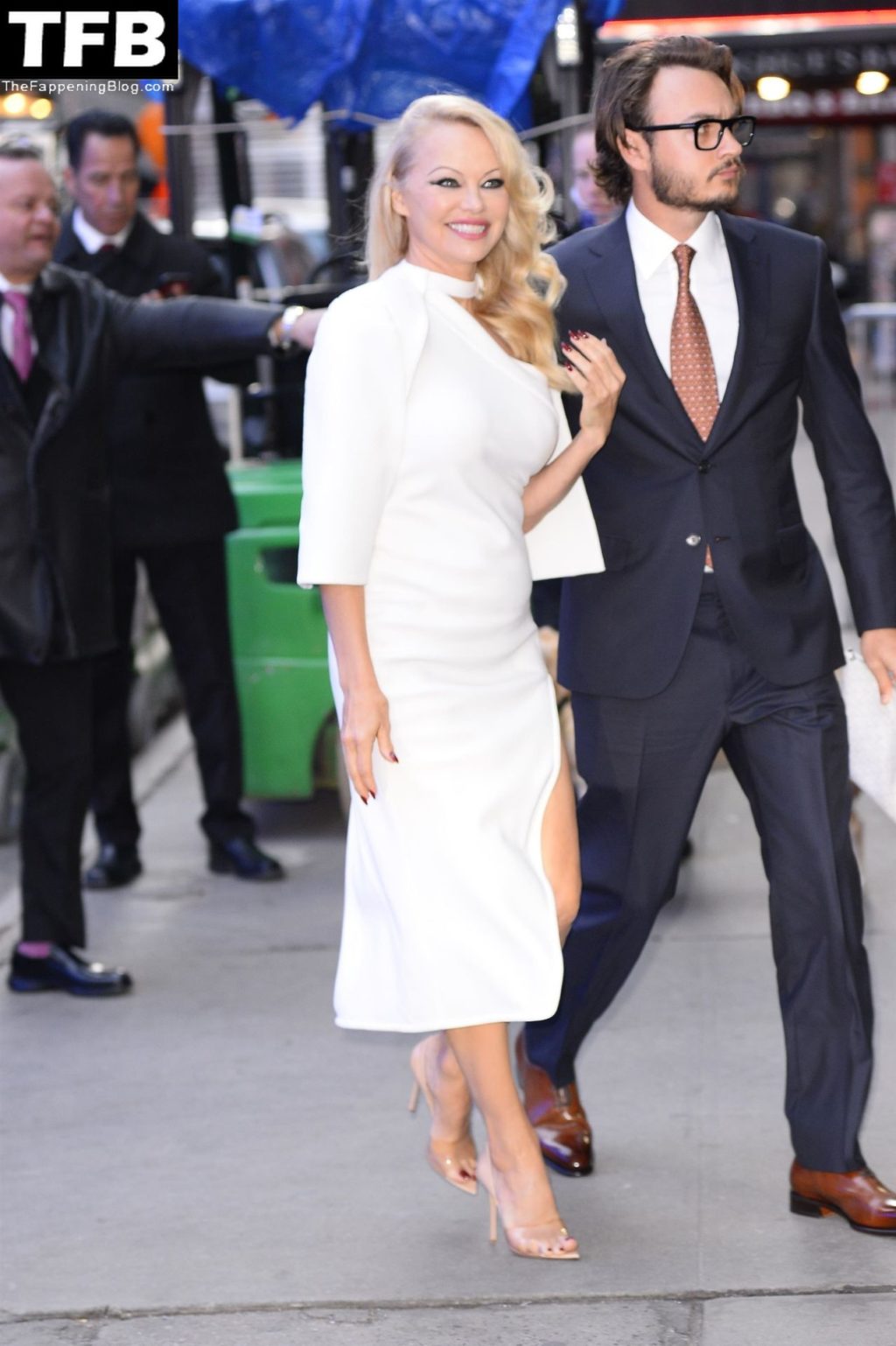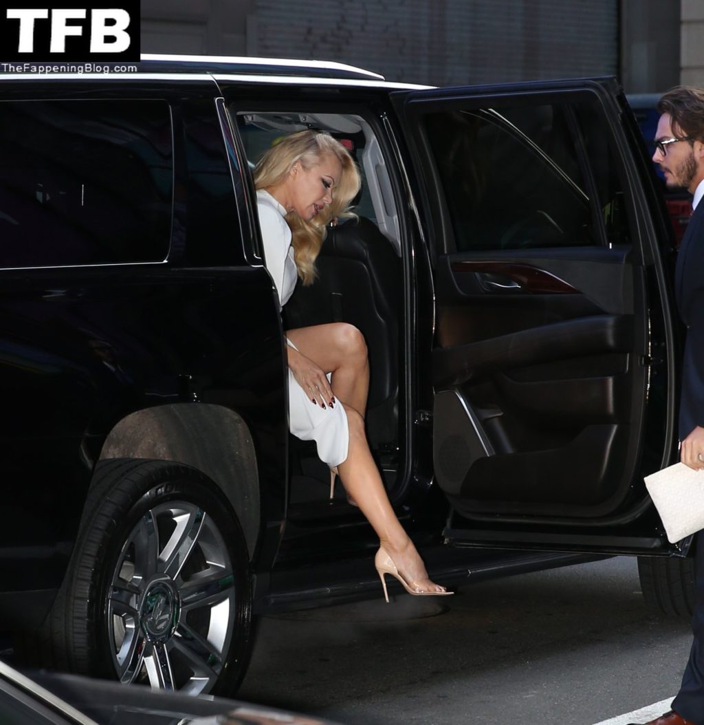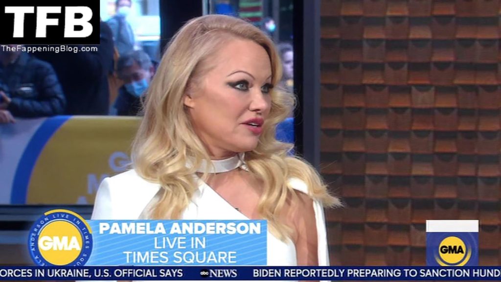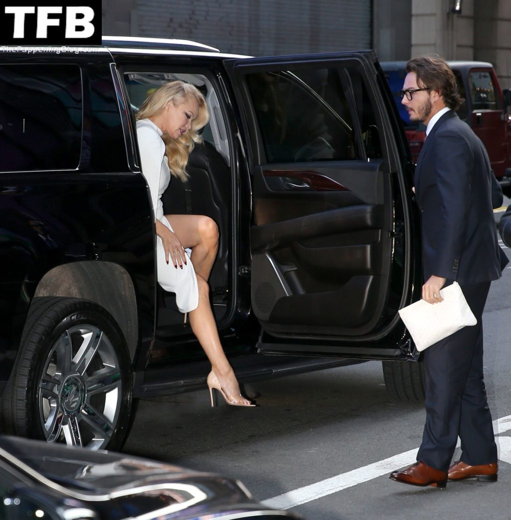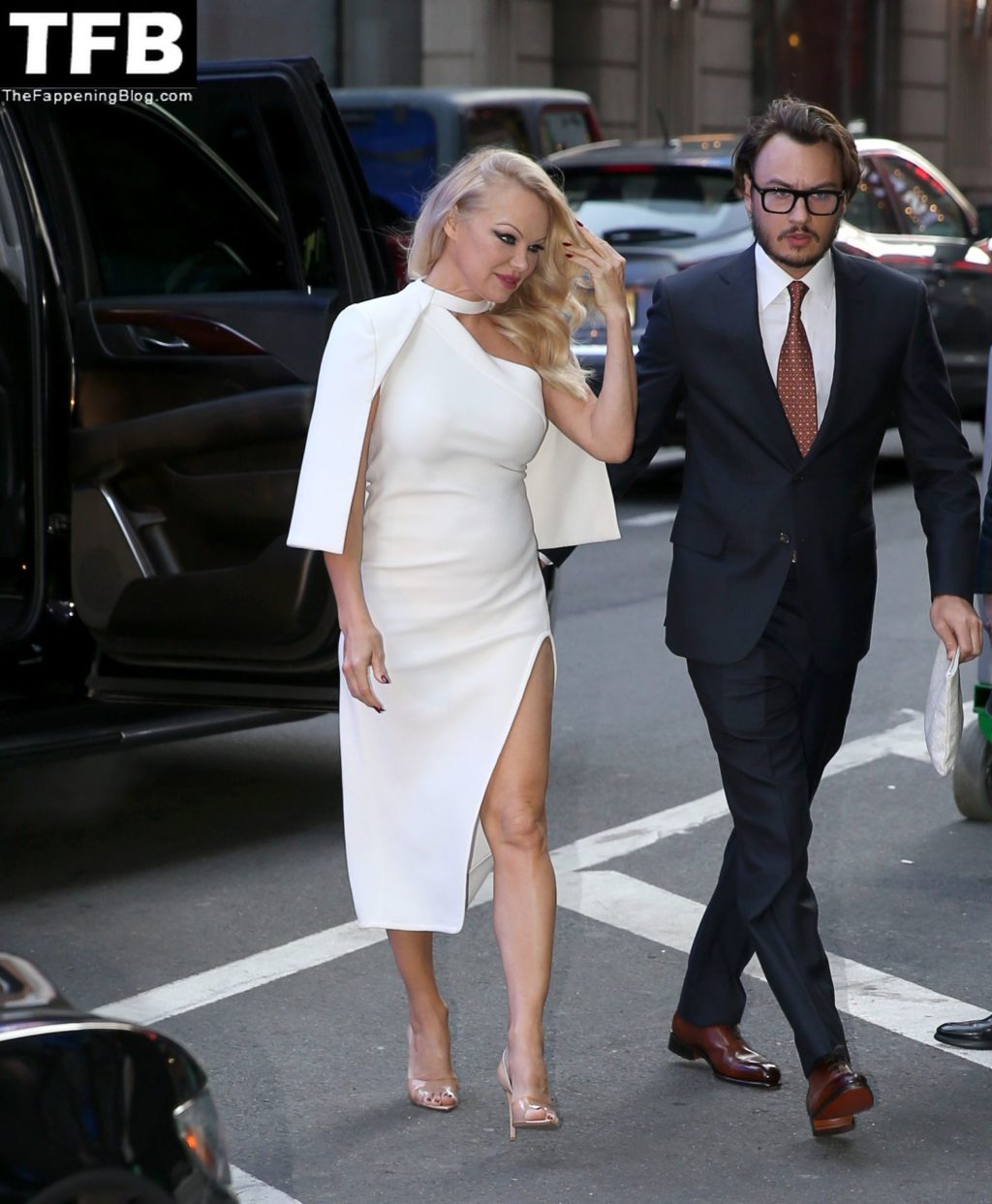 Pamela Anderson llega a Good Morning America en la ciudad de Nueva York, 23/03/2022. La actriz y modelo de “Baywatch” de 54 años llevaba un vestido blanco con un par de tacones transparentes.