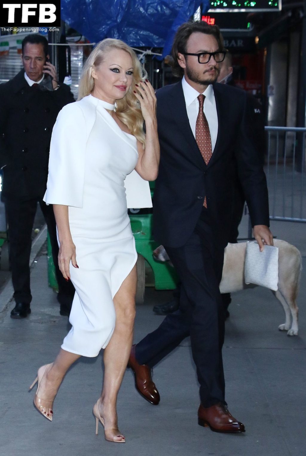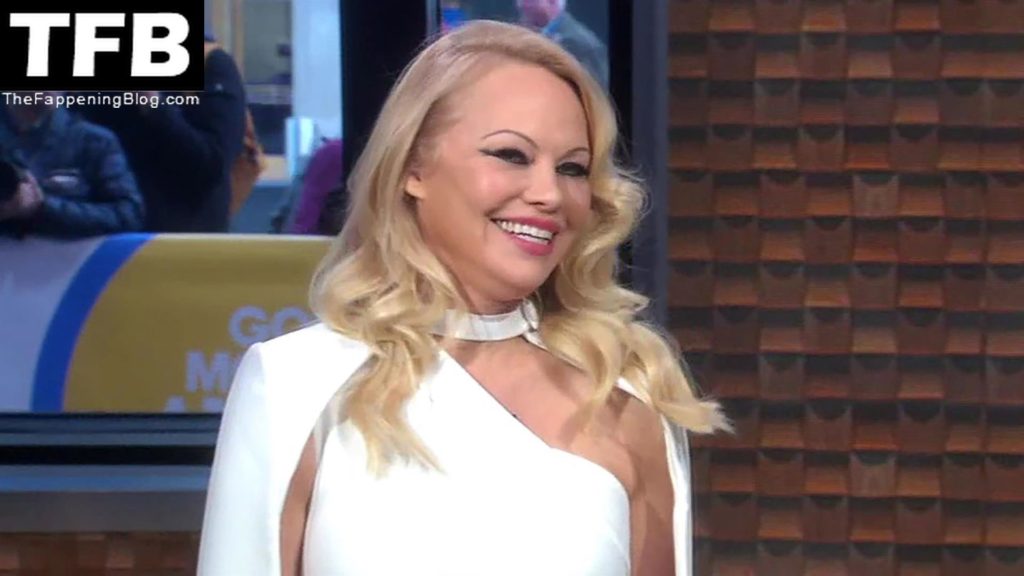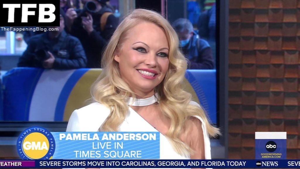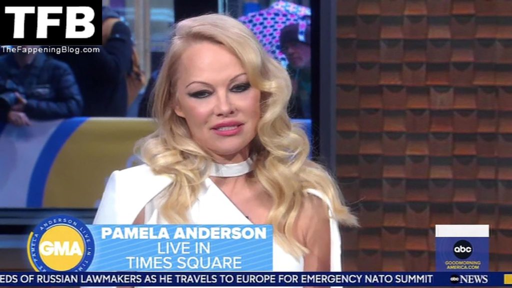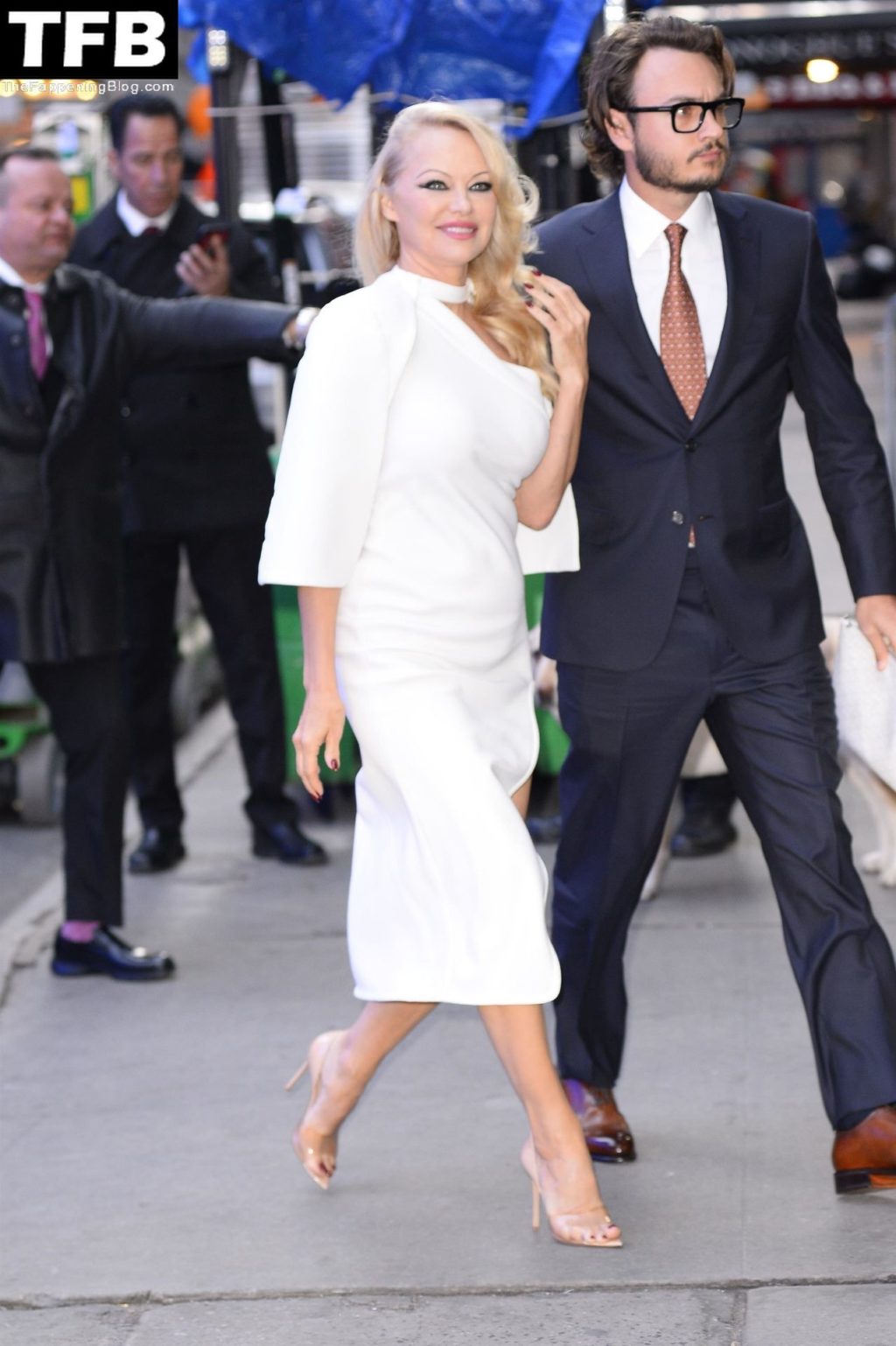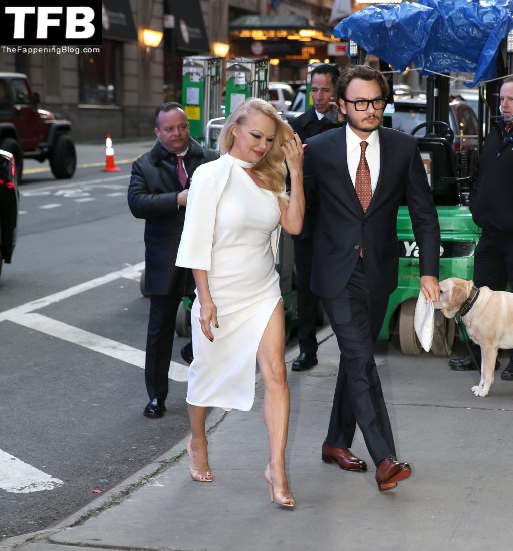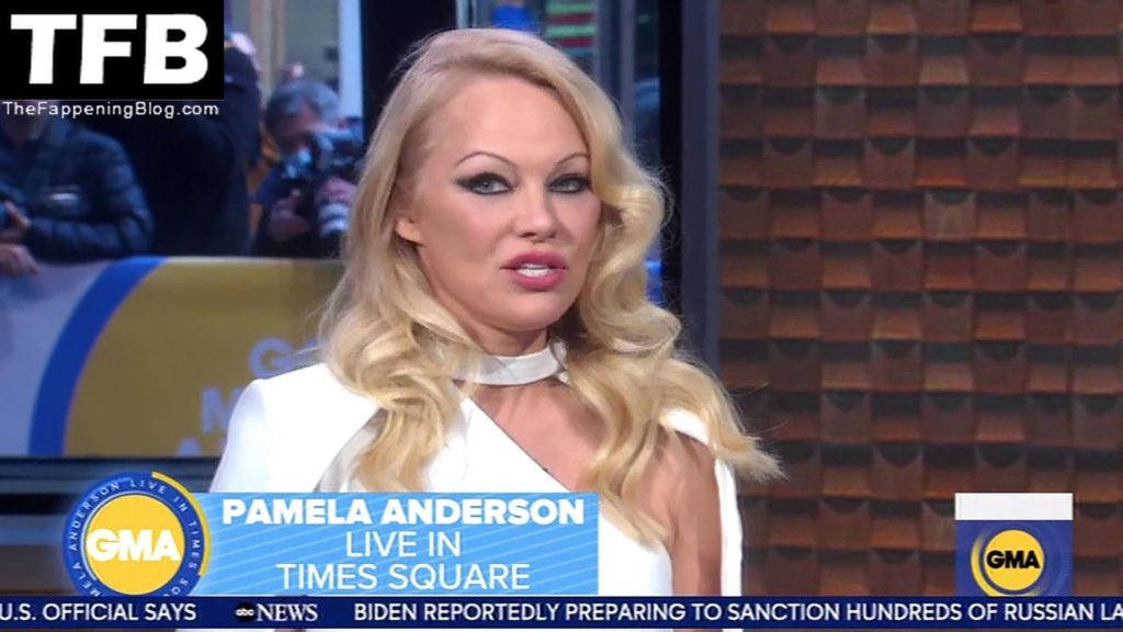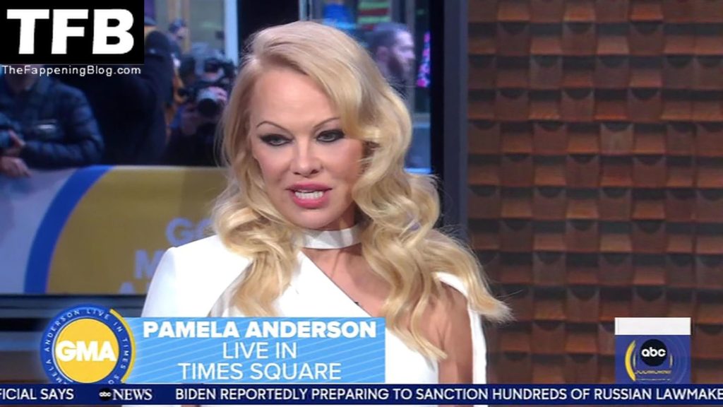 Pamela Anderson llega a Good Morning America en la ciudad de Nueva York, 23/03/2022. La actriz y modelo de “Baywatch” de 54 años llevaba un vestido blanco con un par de tacones transparentes.