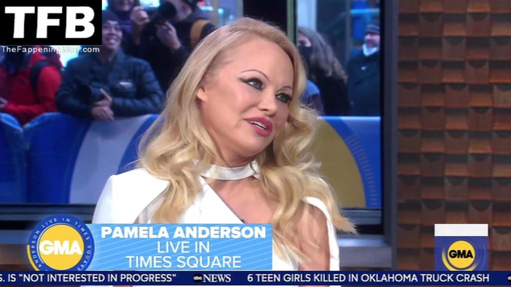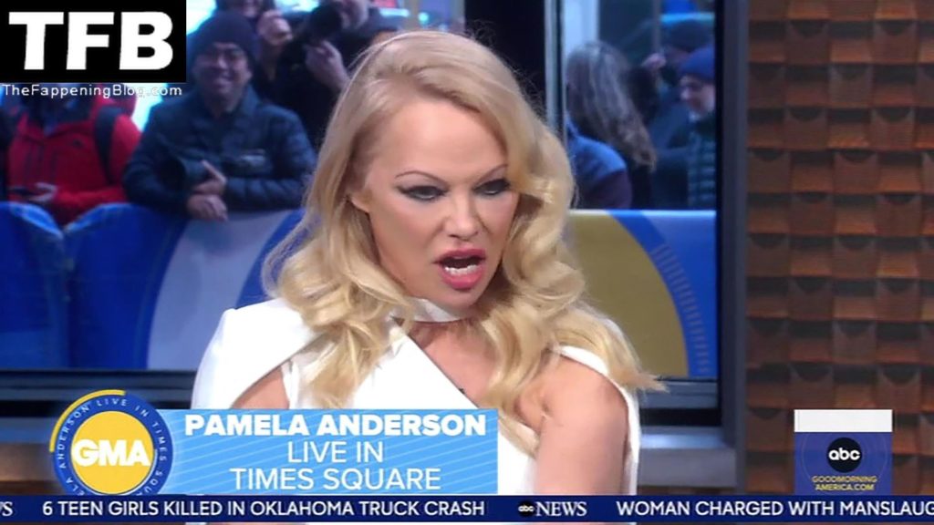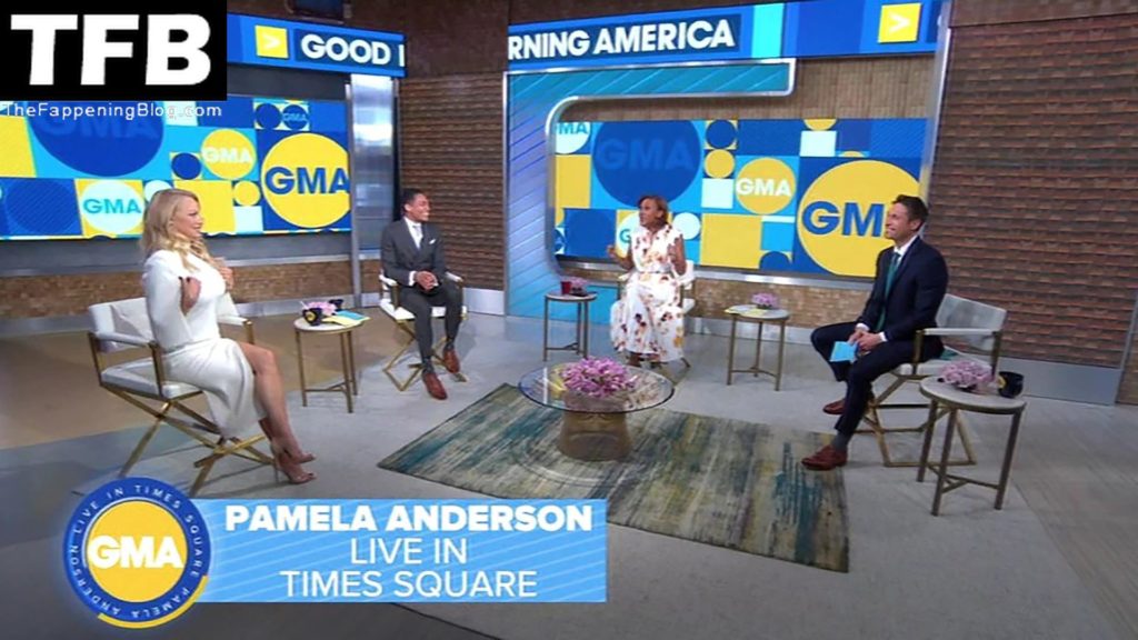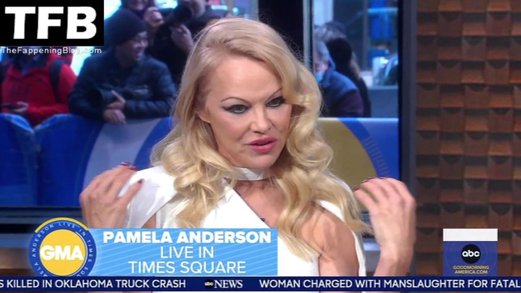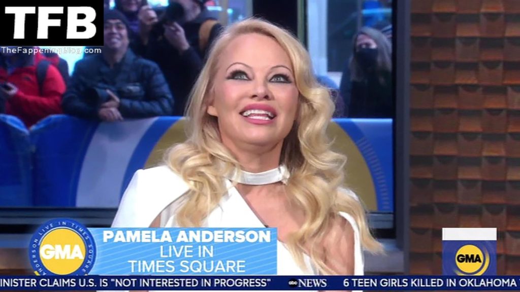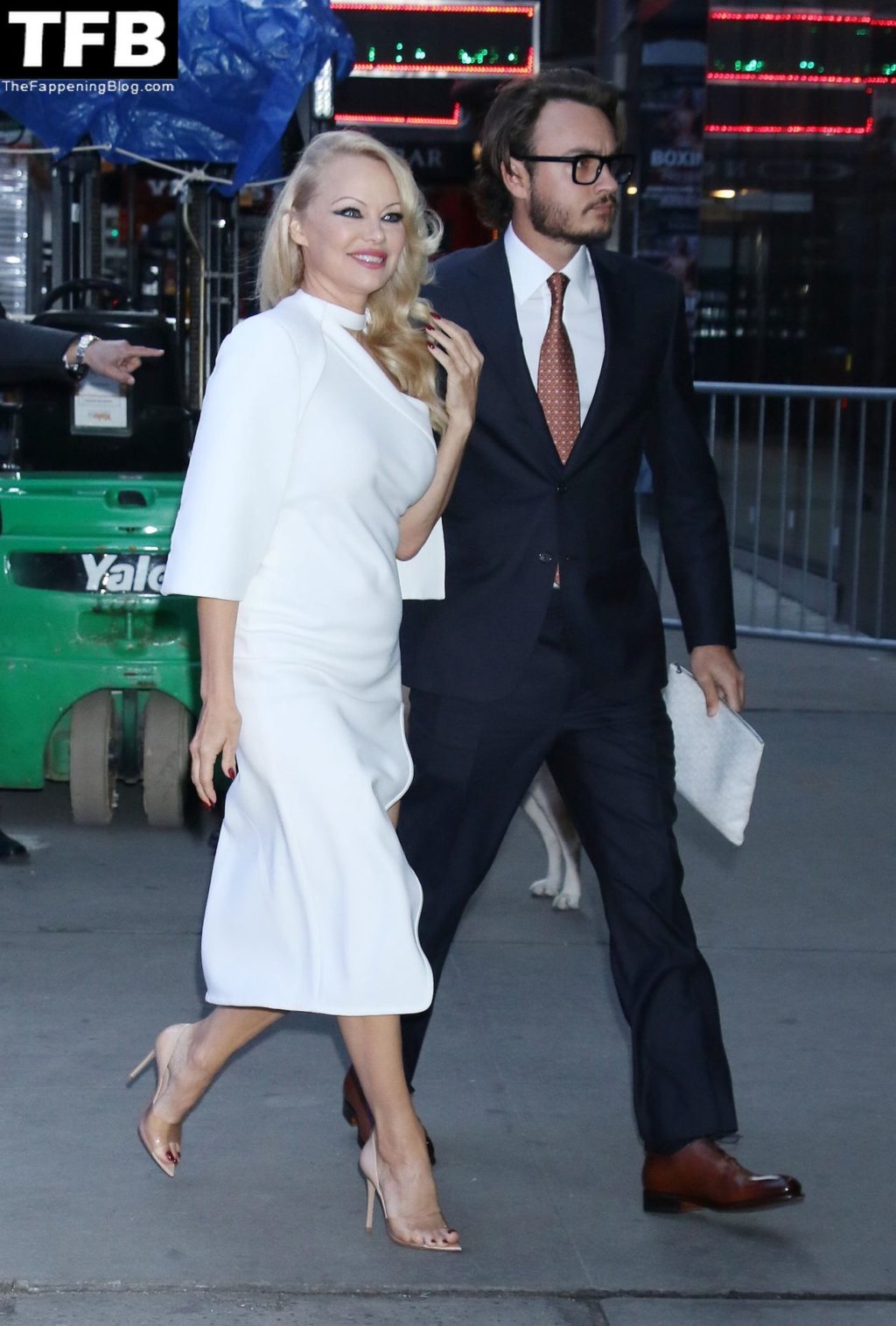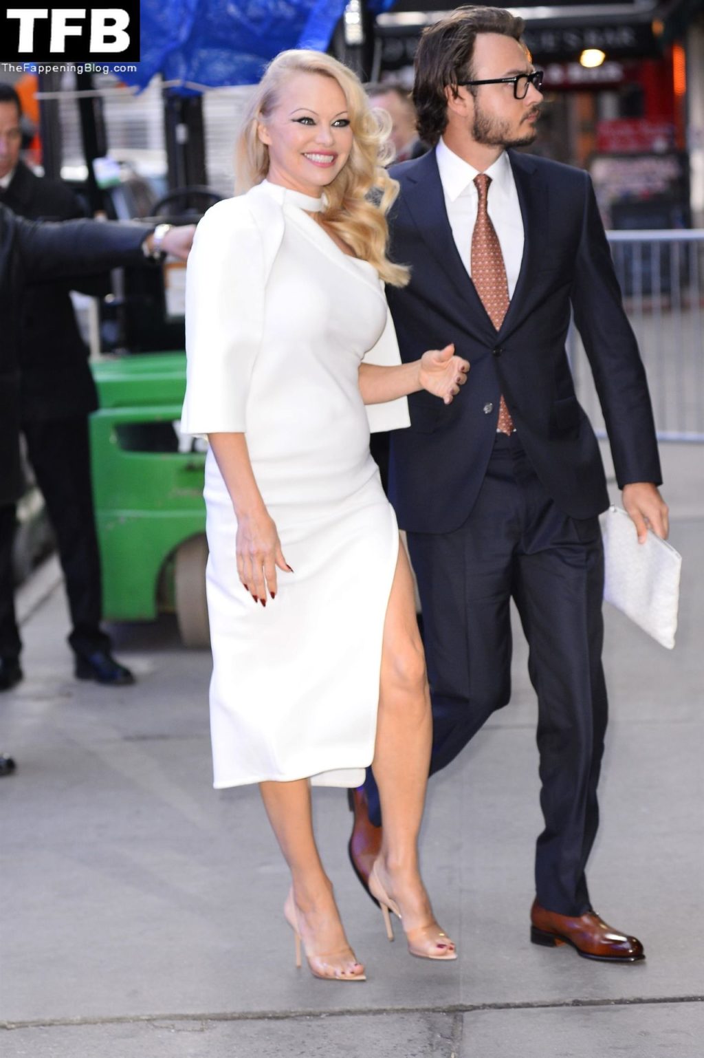 Pamela Anderson llega a Good Morning America en la ciudad de Nueva York, 23/03/2022. La actriz y modelo de “Baywatch” de 54 años llevaba un vestido blanco con un par de tacones transparentes.