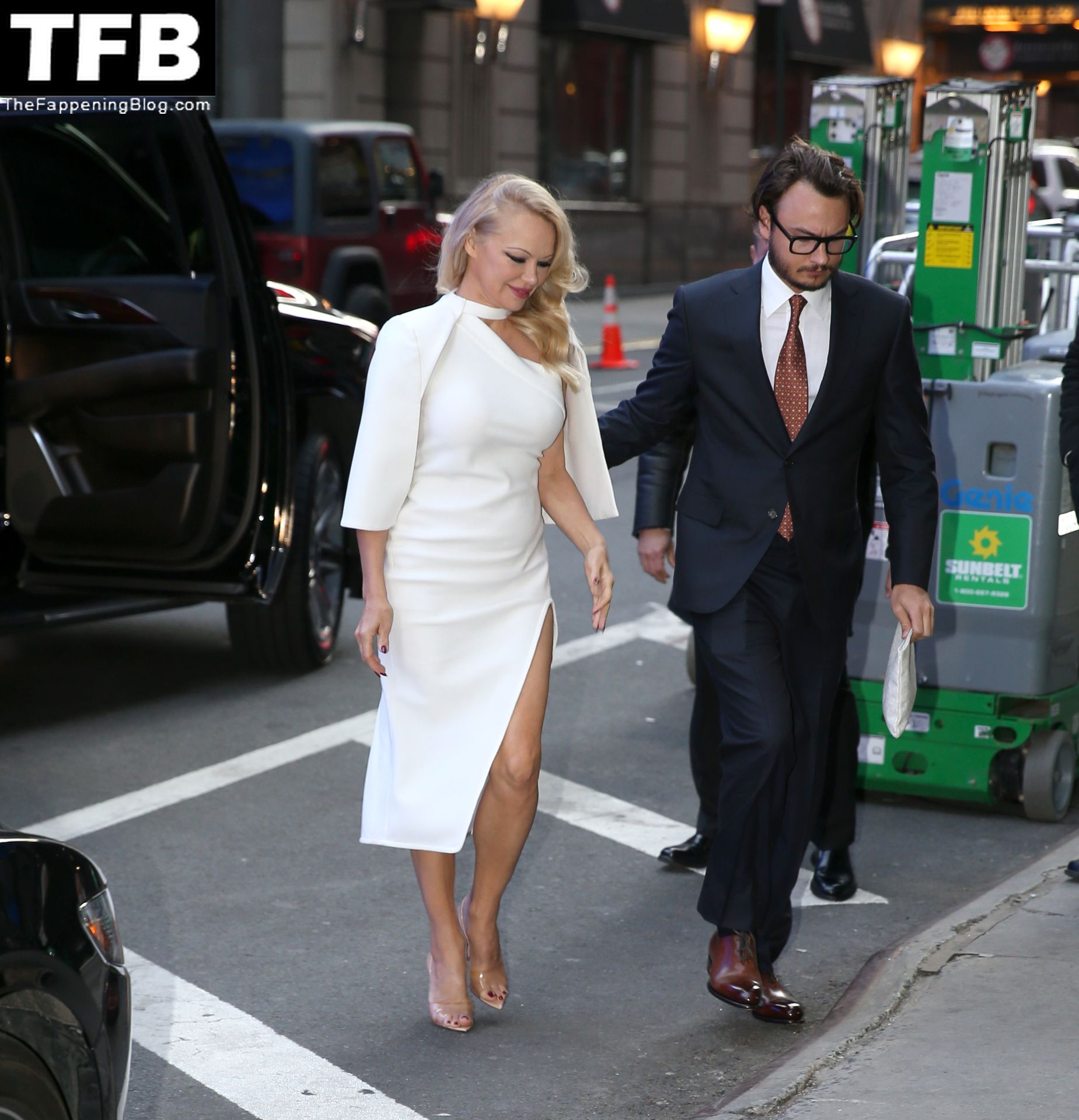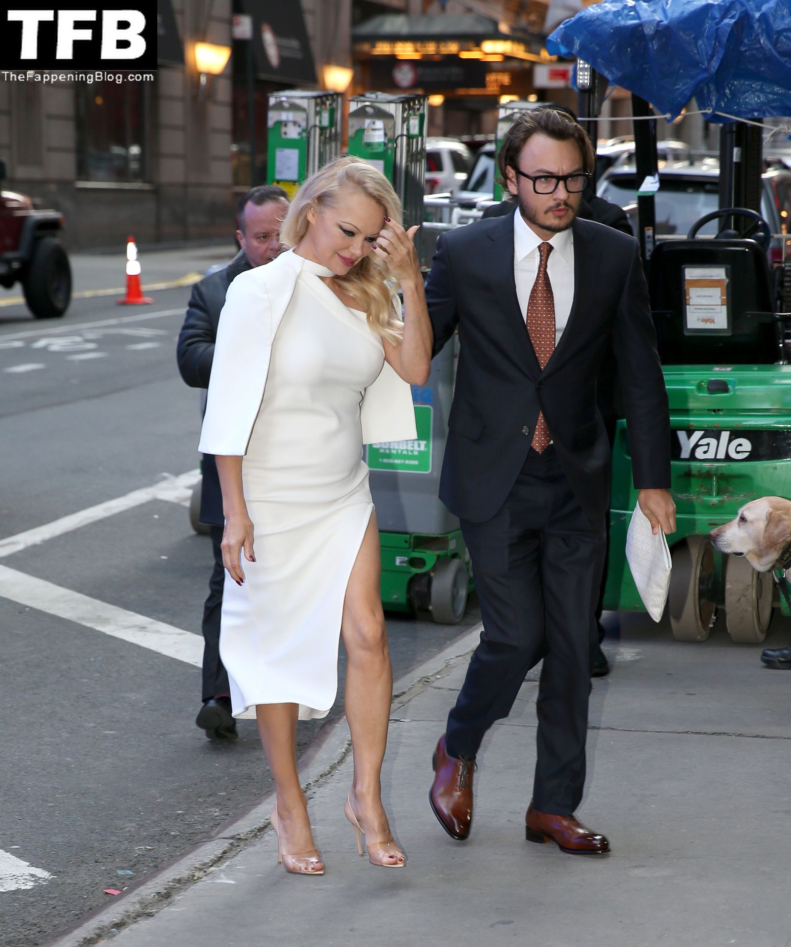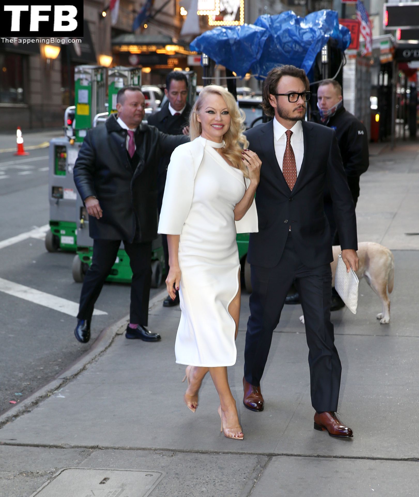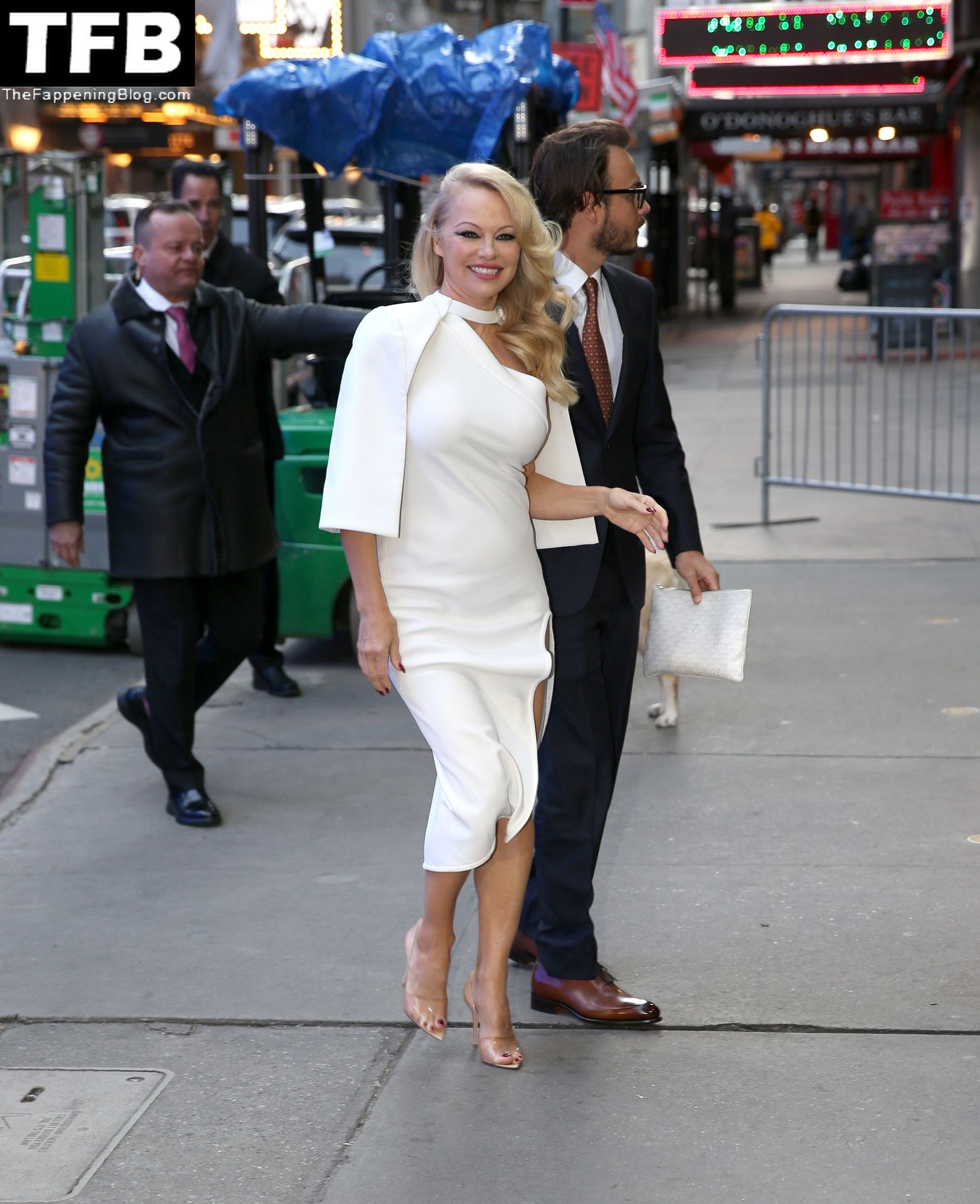 Pamela Anderson llega a Good Morning America en la ciudad de Nueva York, 23/03/2022. La actriz y modelo de “Baywatch” de 54 años llevaba un vestido blanco con un par de tacones transparentes.