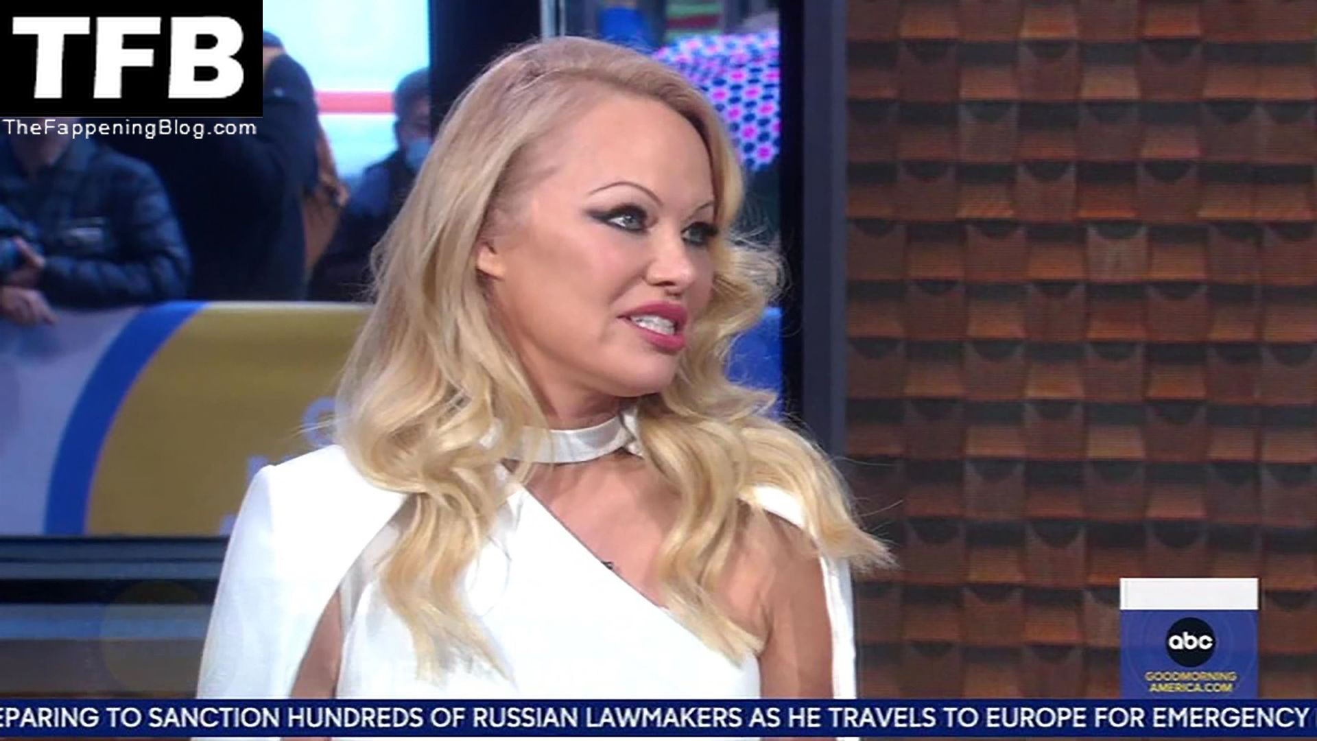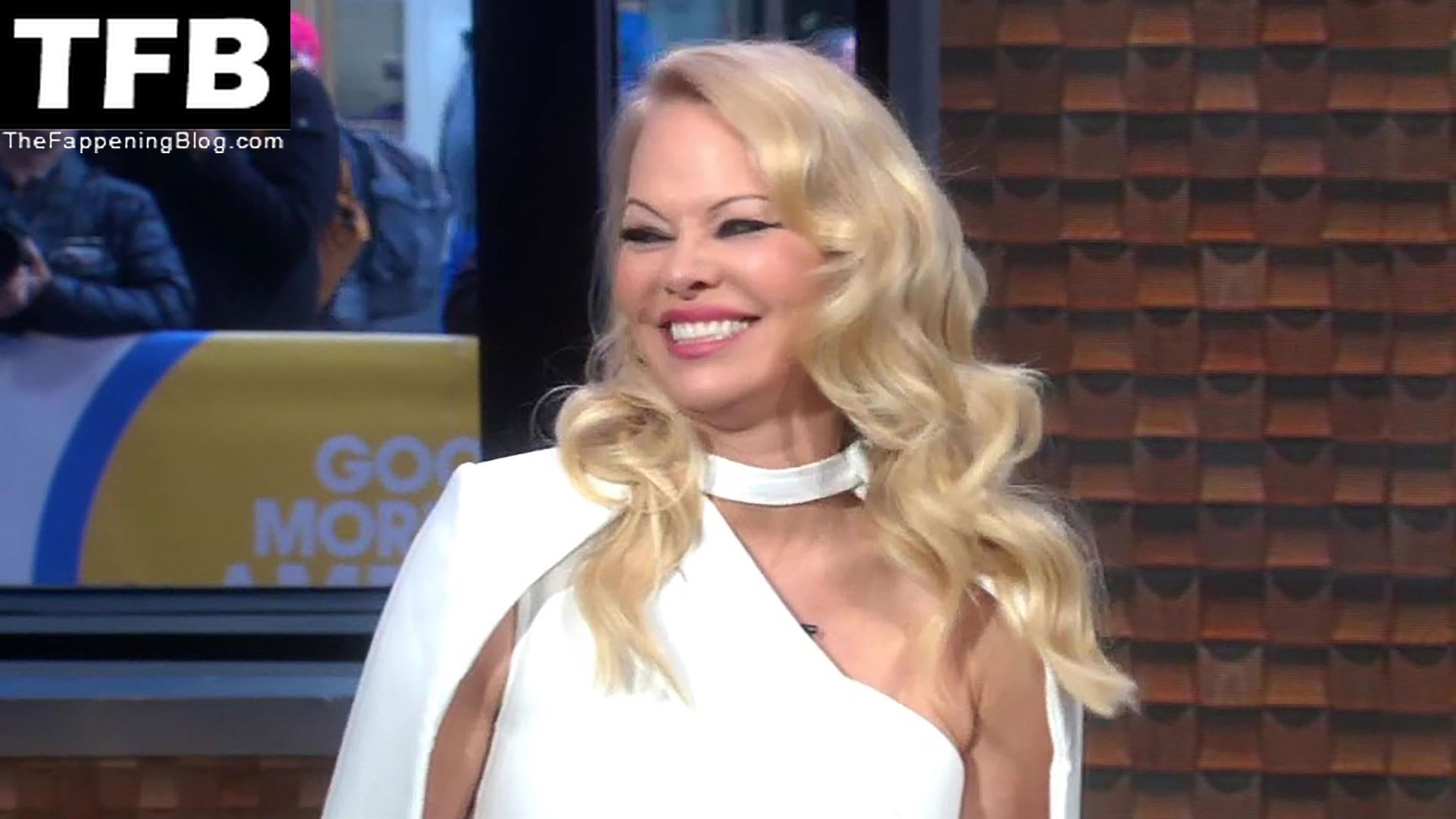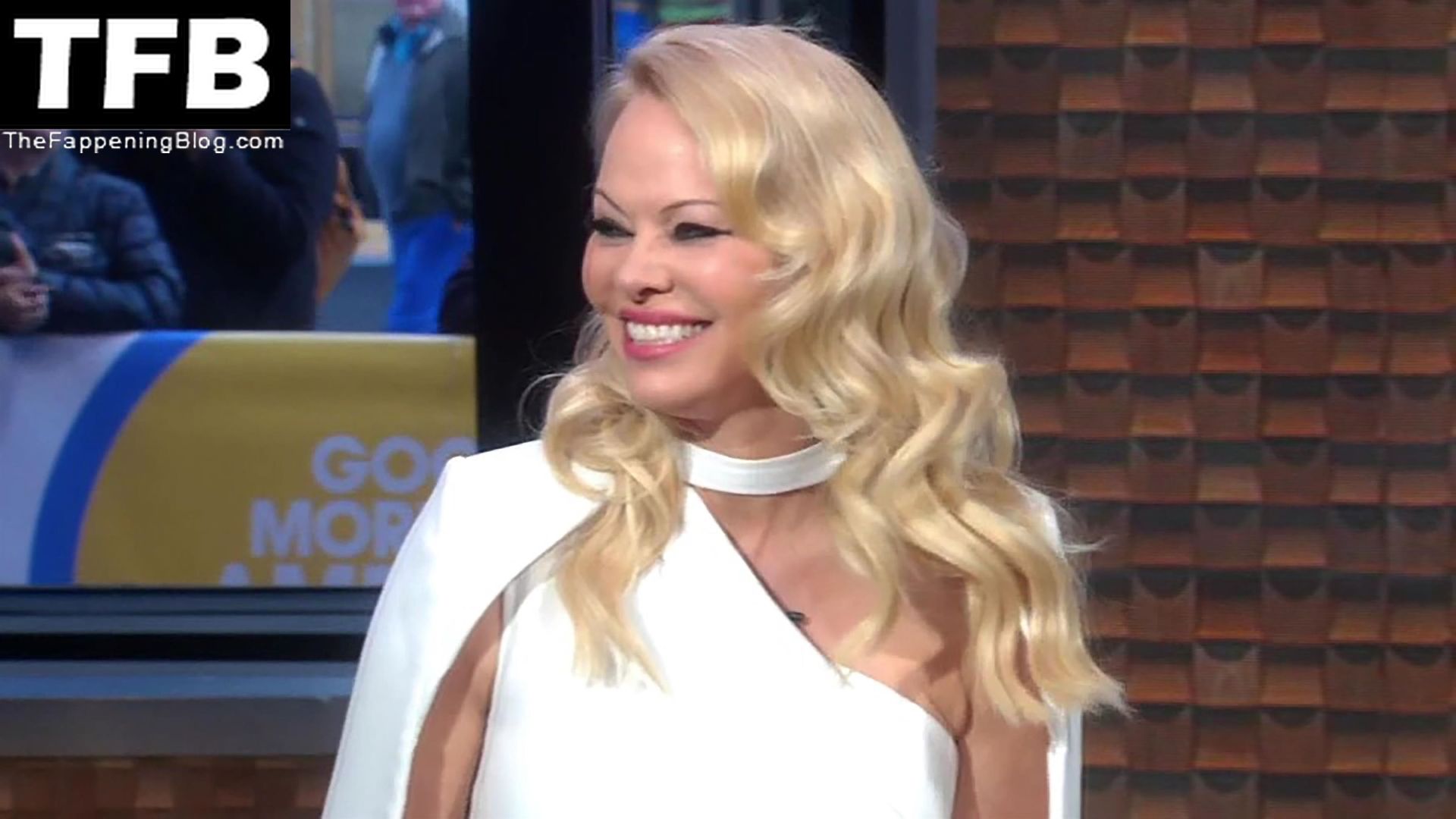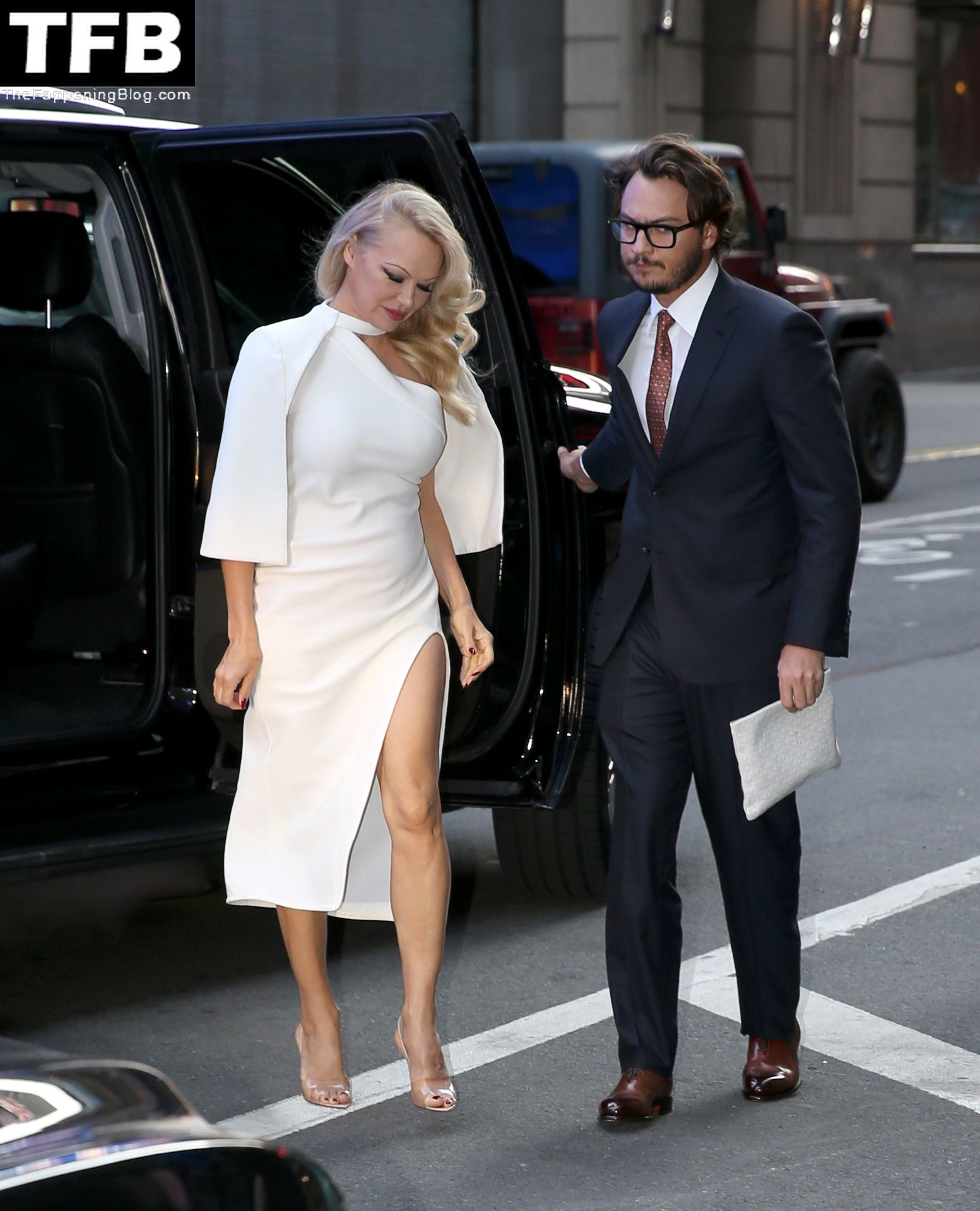 Pamela Anderson llega a Good Morning America en la ciudad de Nueva York, 23/03/2022. La actriz y modelo de “Baywatch” de 54 años llevaba un vestido blanco con un par de tacones transparentes.