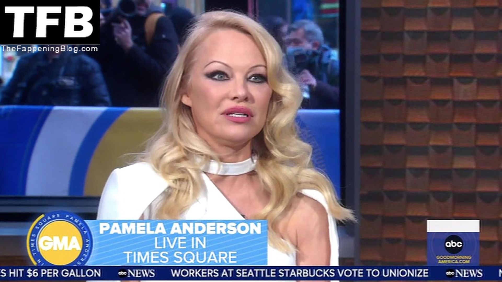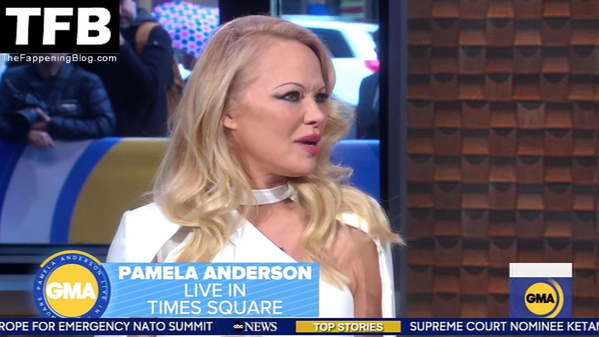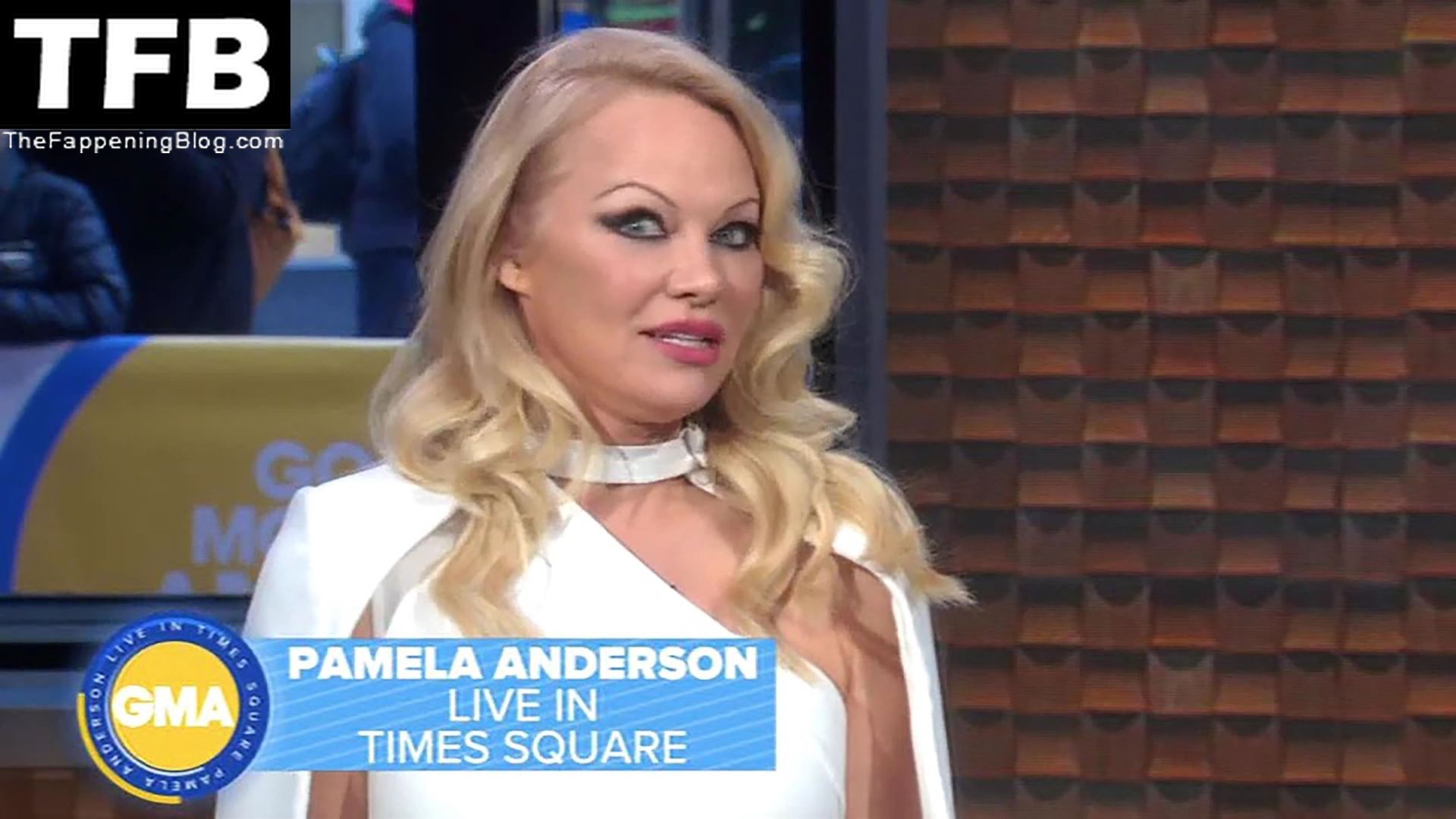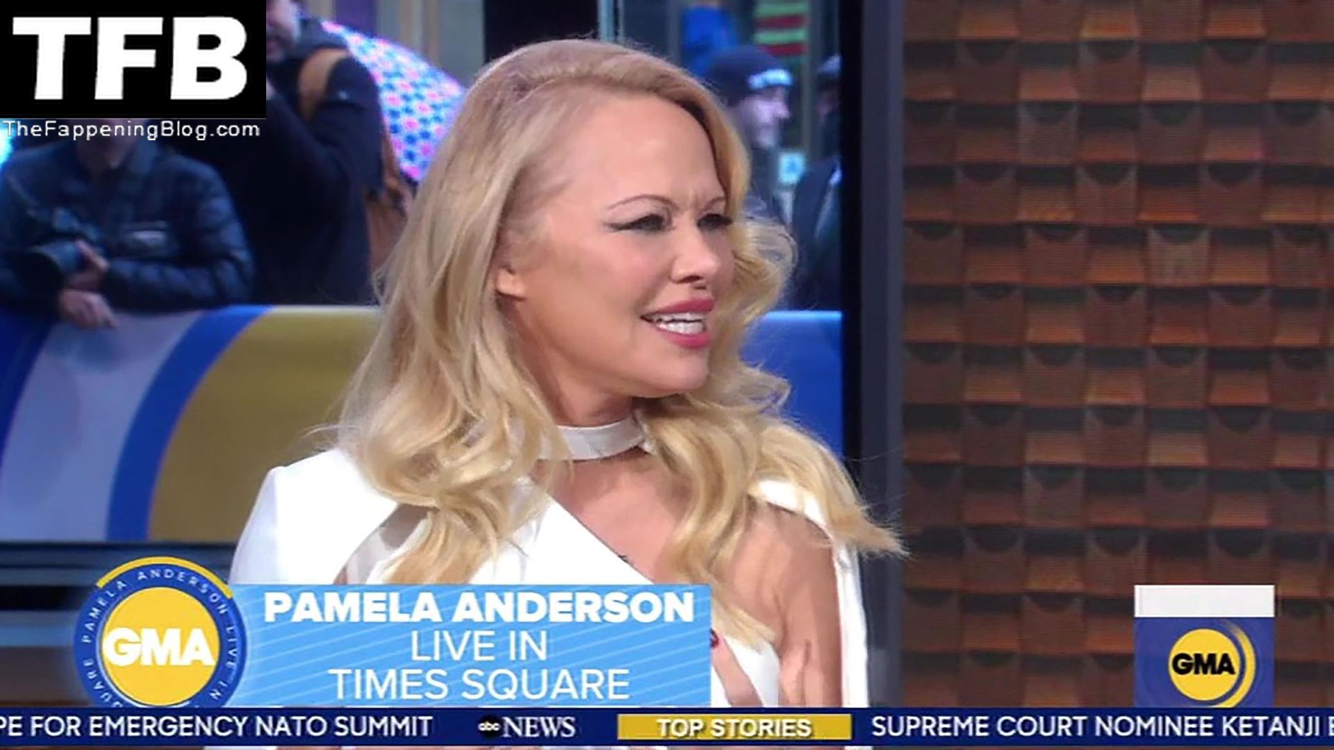 Pamela Anderson llega a Good Morning America en la ciudad de Nueva York, 23/03/2022. La actriz y modelo de “Baywatch” de 54 años llevaba un vestido blanco con un par de tacones transparentes.