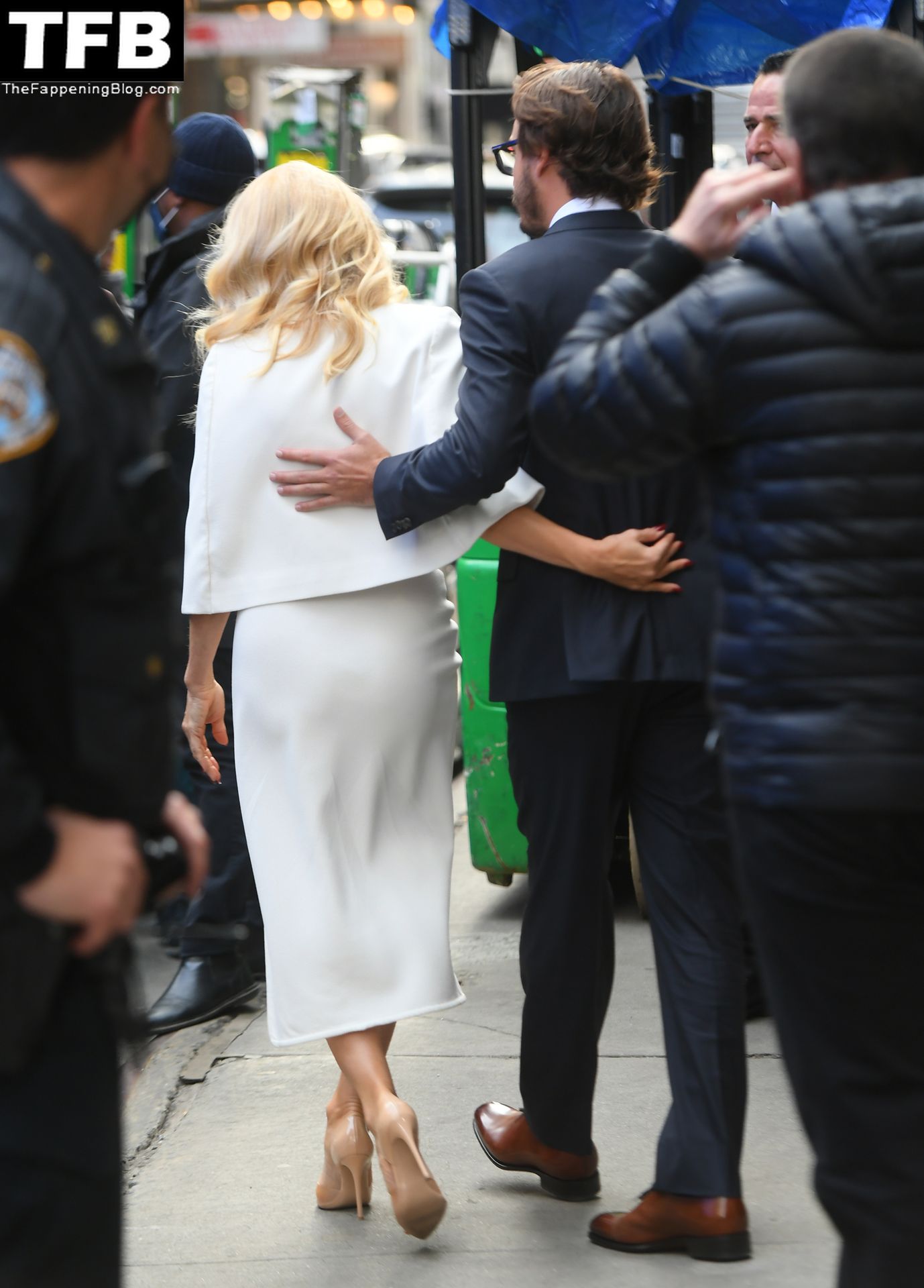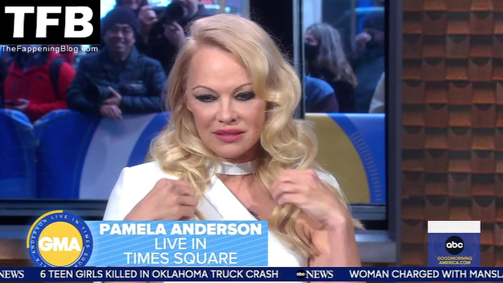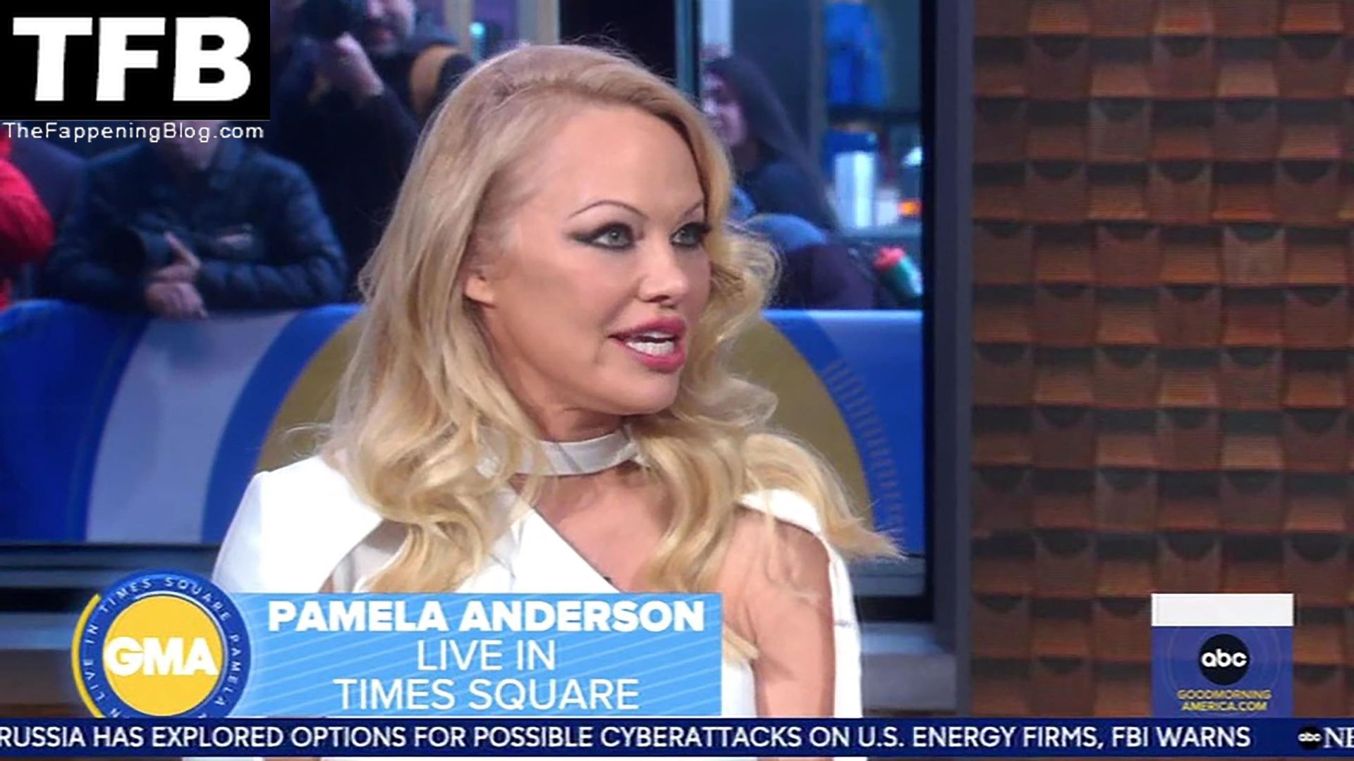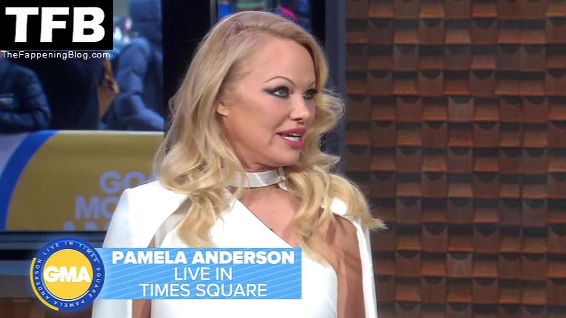 Pamela Anderson llega a Good Morning America en la ciudad de Nueva York, 23/03/2022. La actriz y modelo de “Baywatch” de 54 años llevaba un vestido blanco con un par de tacones transparentes.