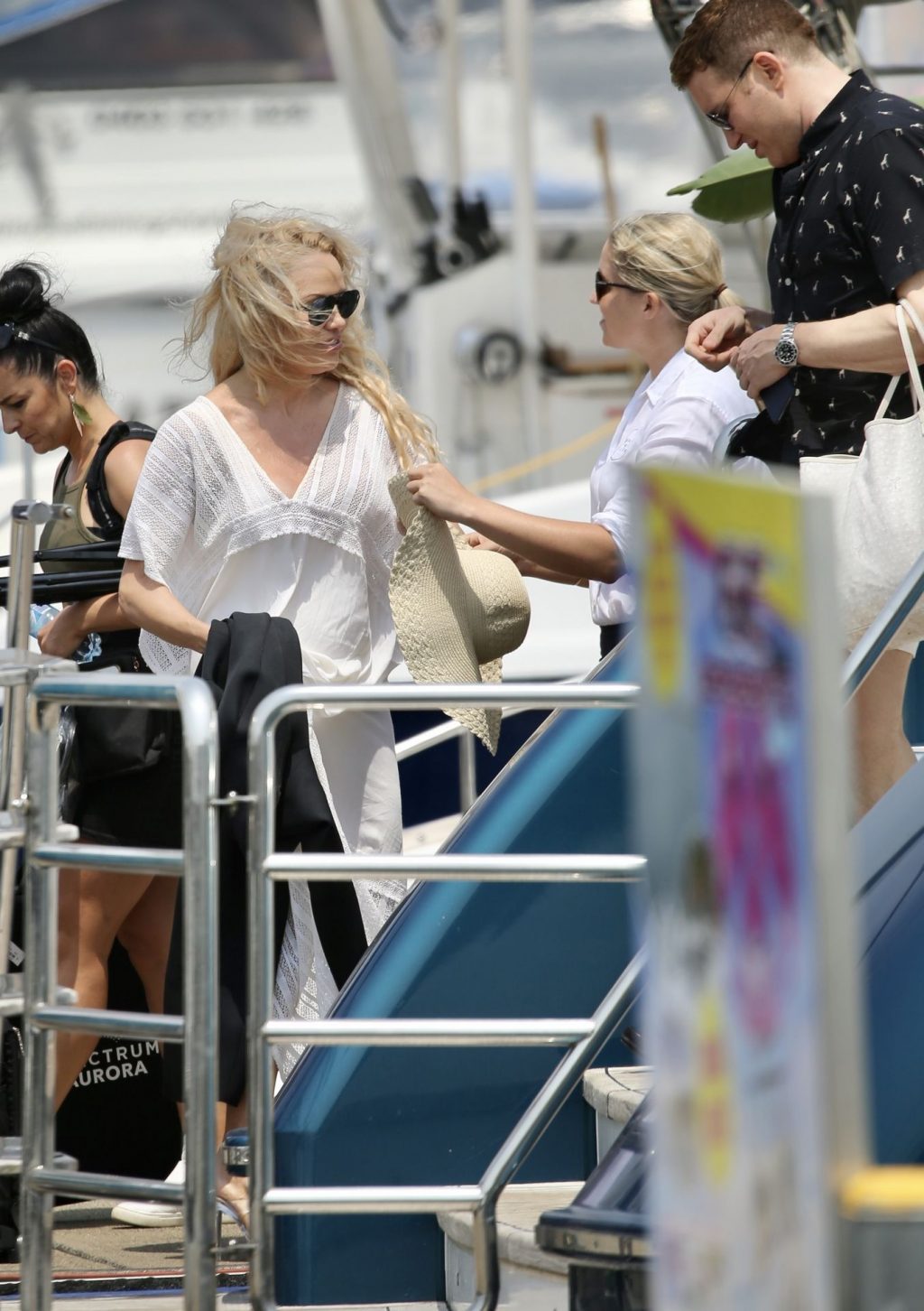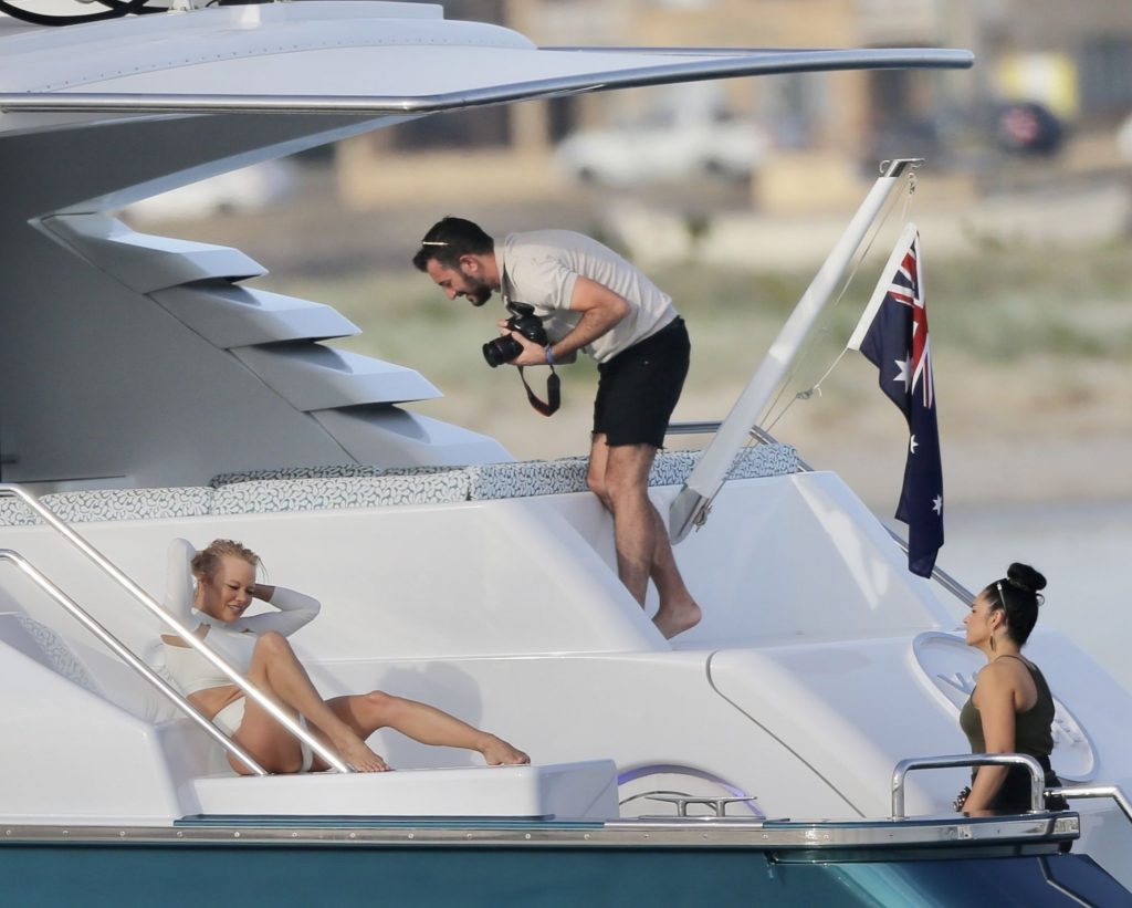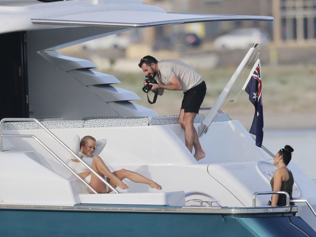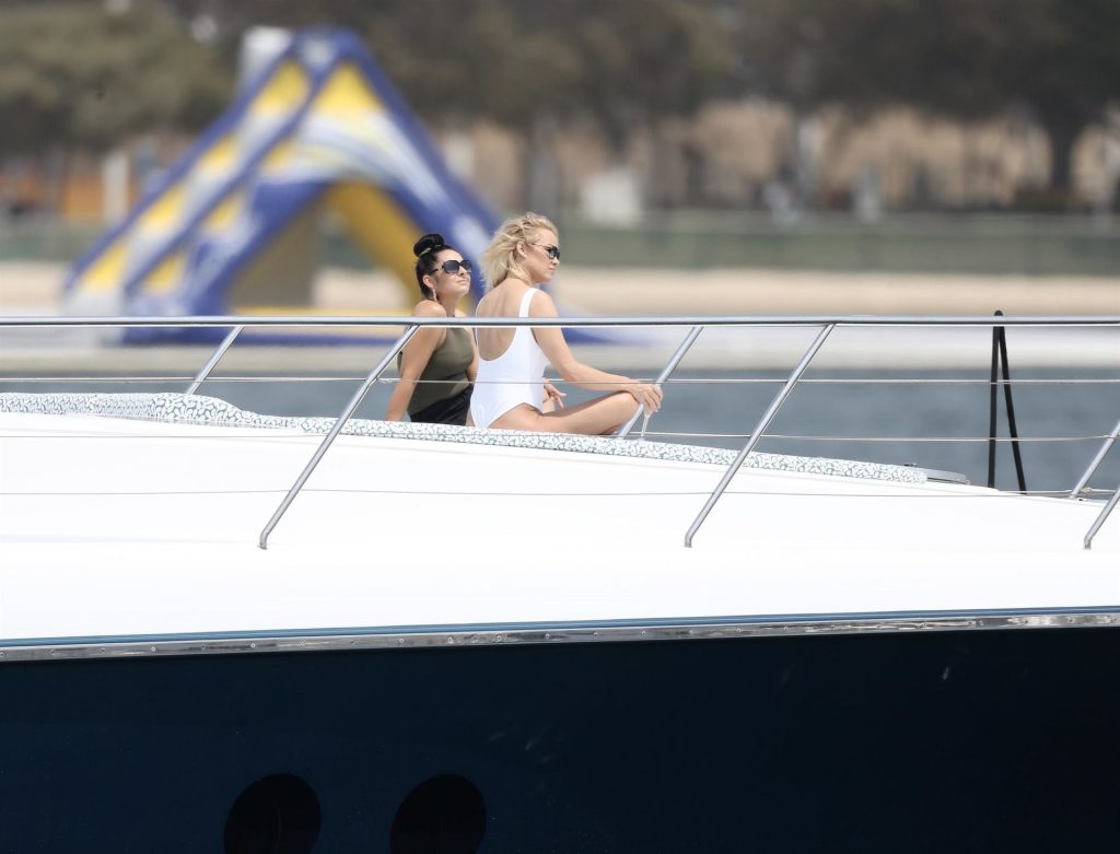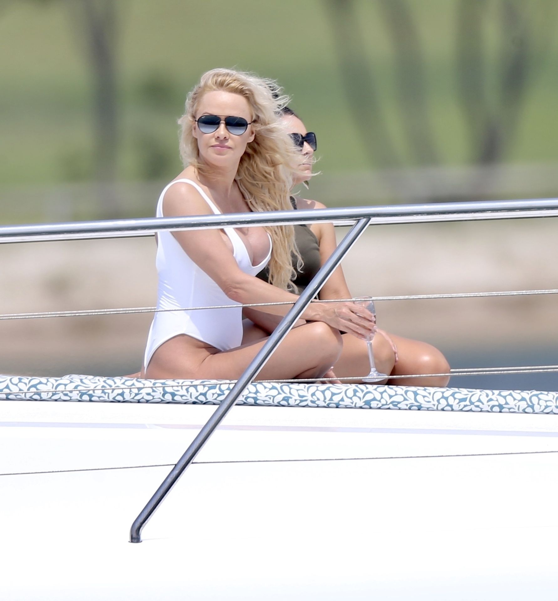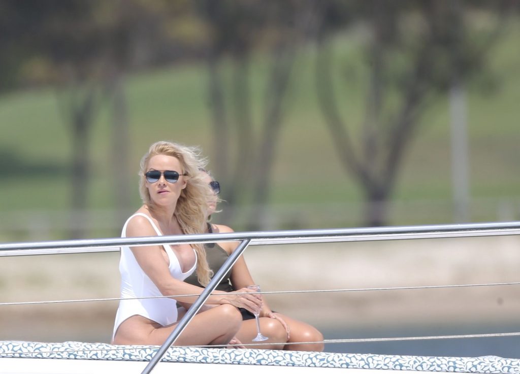 Pamela Anderson con busto posa en un traje de baño blanco en un yate para una sesión de fotos en la Costa Dorada, Australia, 27/11/2019. Han pasado 30 años desde que se estrenó “Baywatch”, pero Pamela todavía se asocia con la valiente y atractiva salvavidas C.J. Parker. ¡La abuela del Fappening luce bien hoy!