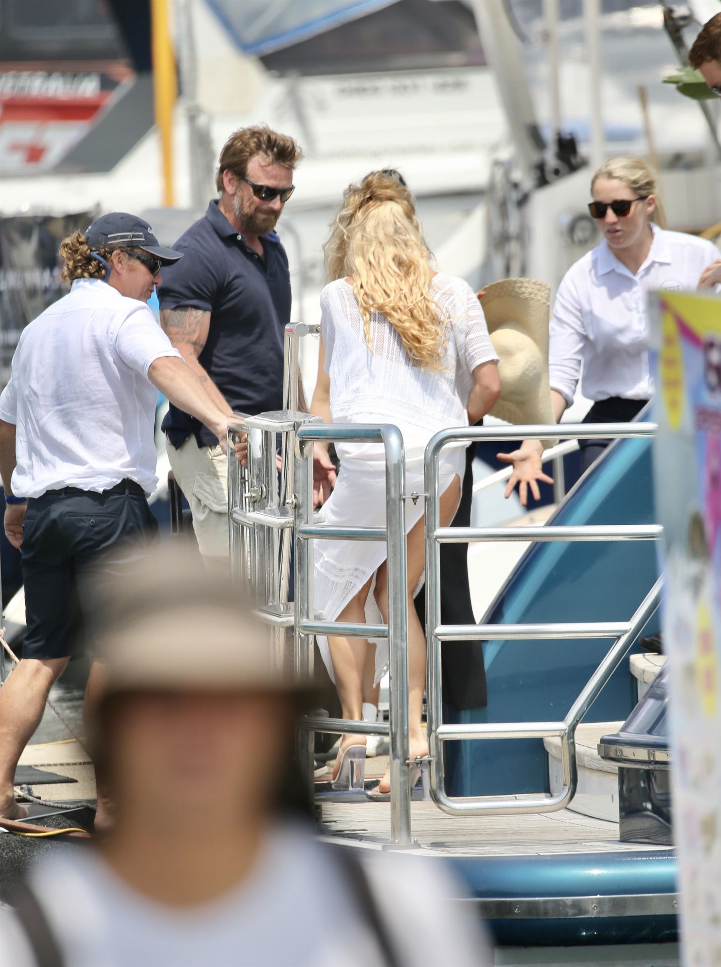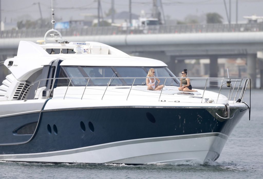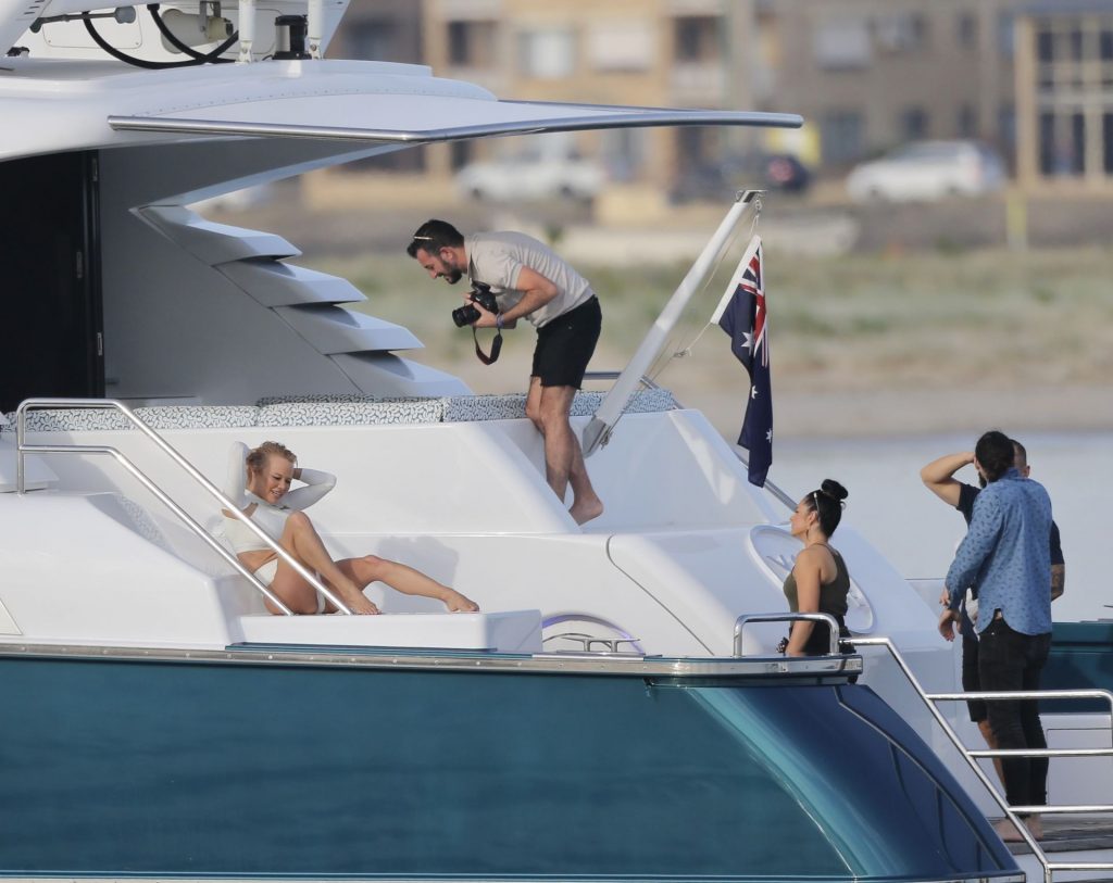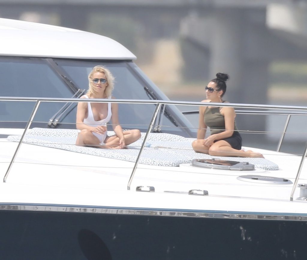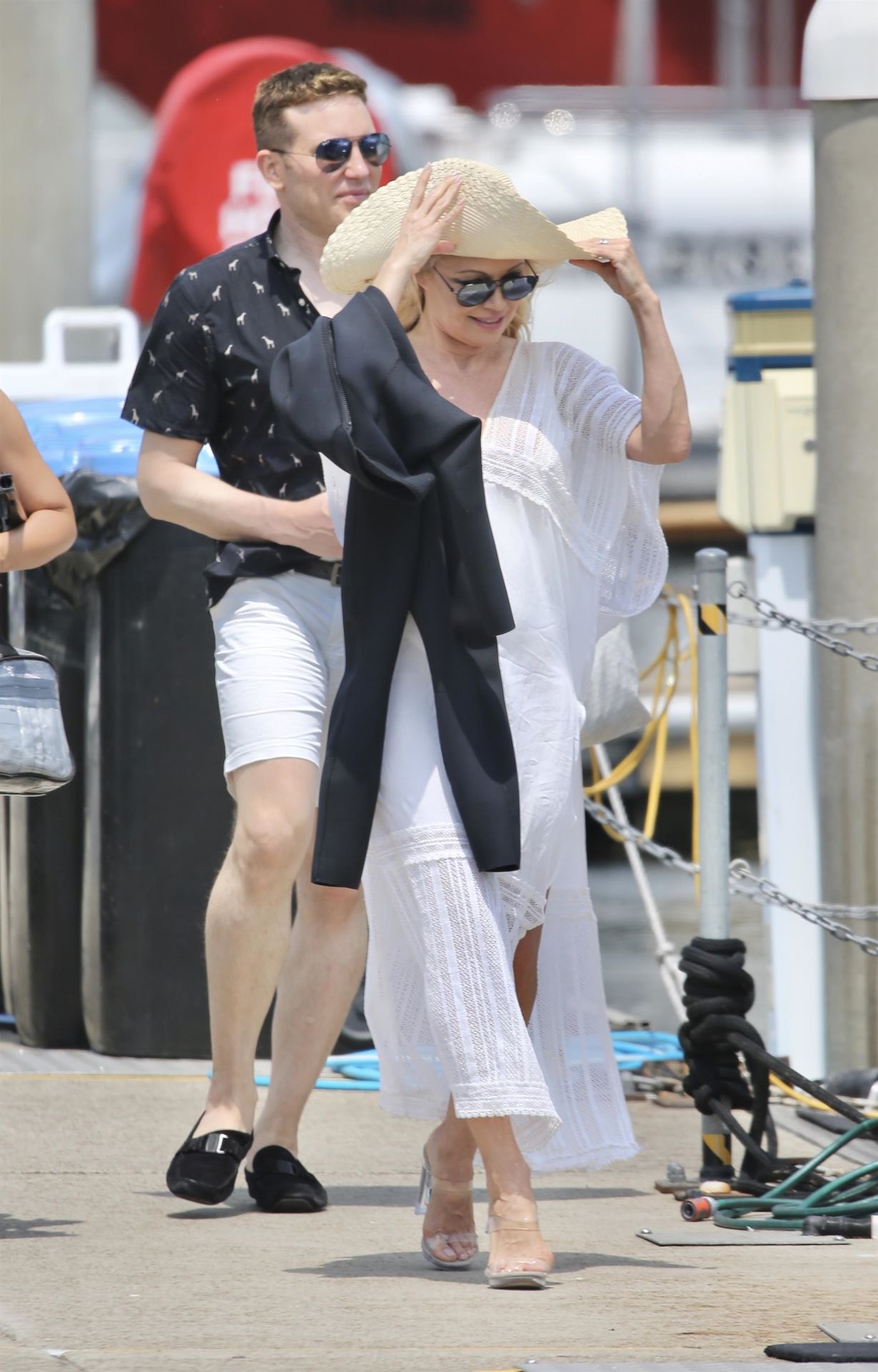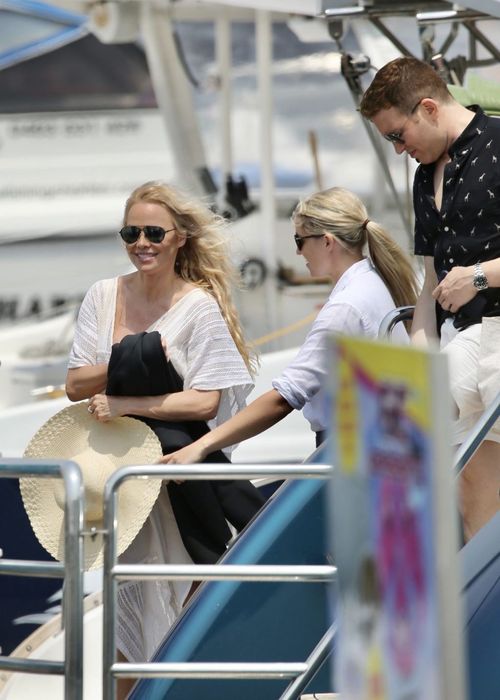 Pamela Anderson con busto posa en un traje de baño blanco en un yate para una sesión de fotos en la Costa Dorada, Australia, 27/11/2019. Han pasado 30 años desde que se estrenó “Baywatch”, pero Pamela todavía se asocia con la valiente y atractiva salvavidas C.J. Parker. ¡La abuela del Fappening luce bien hoy!
