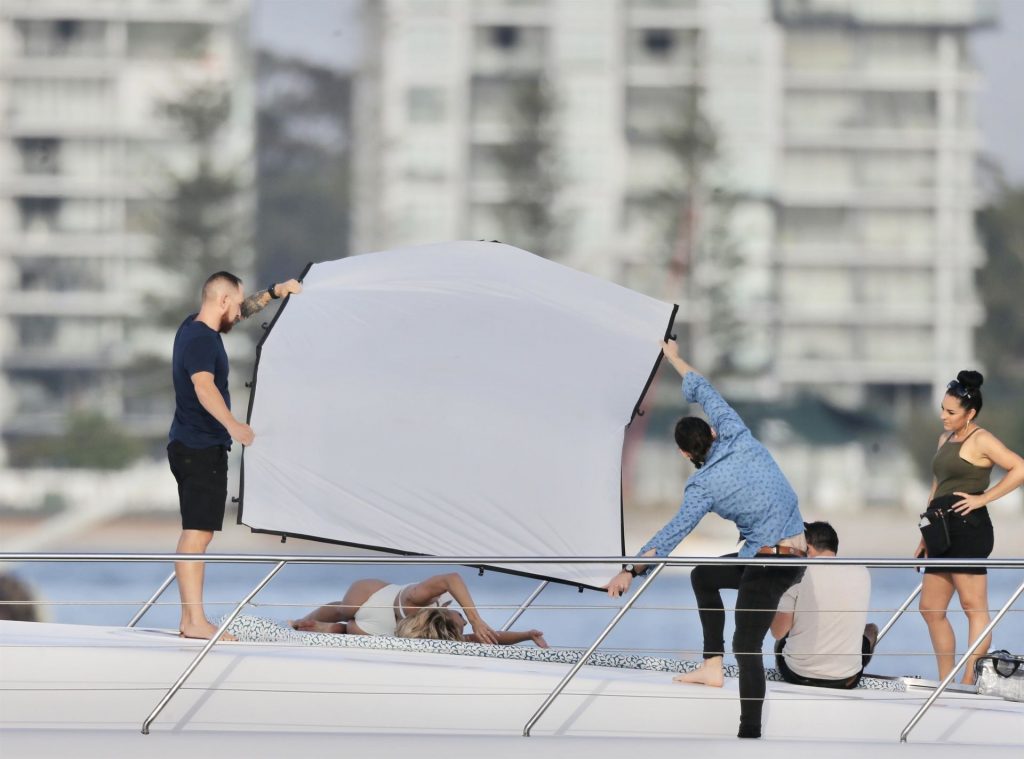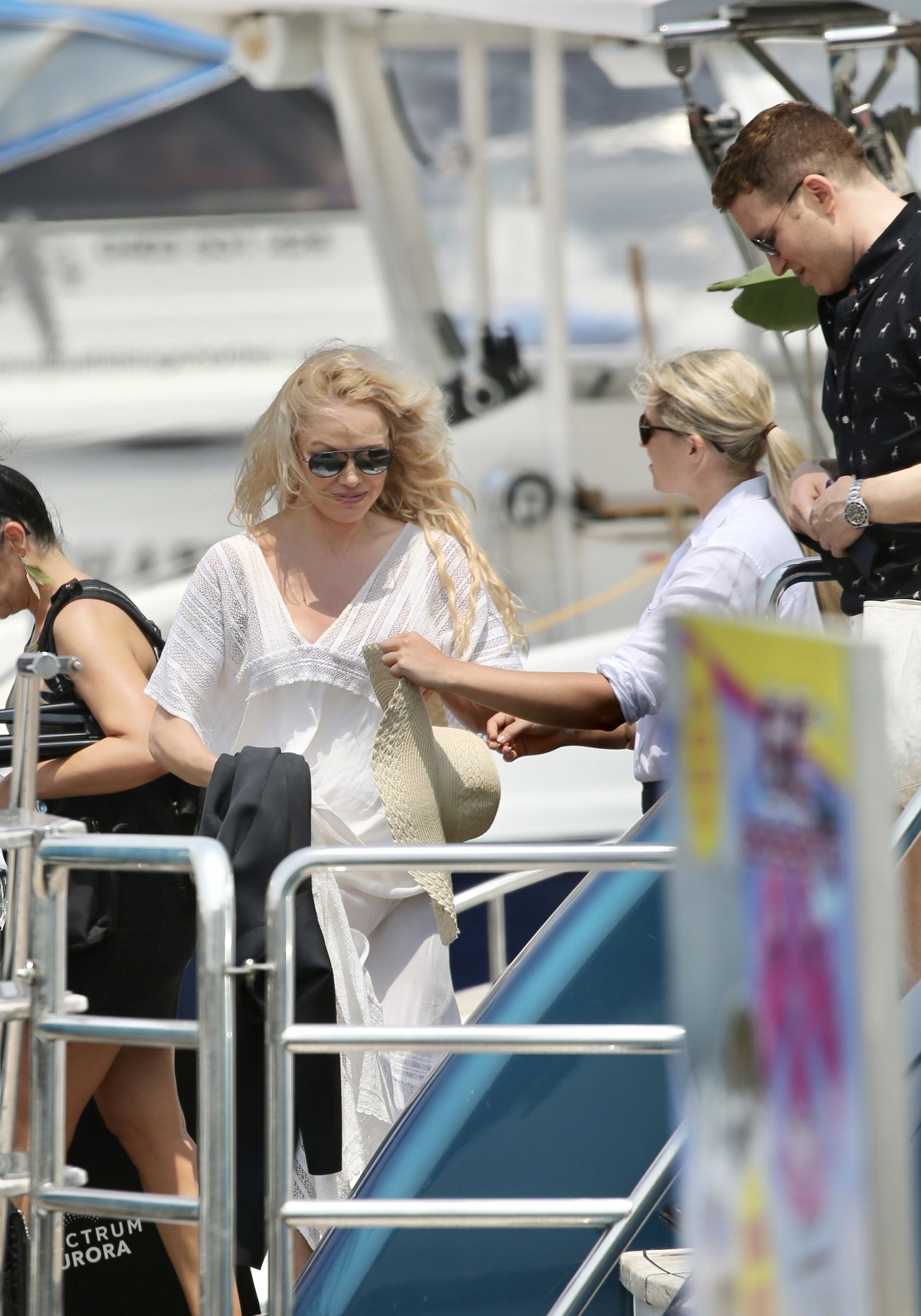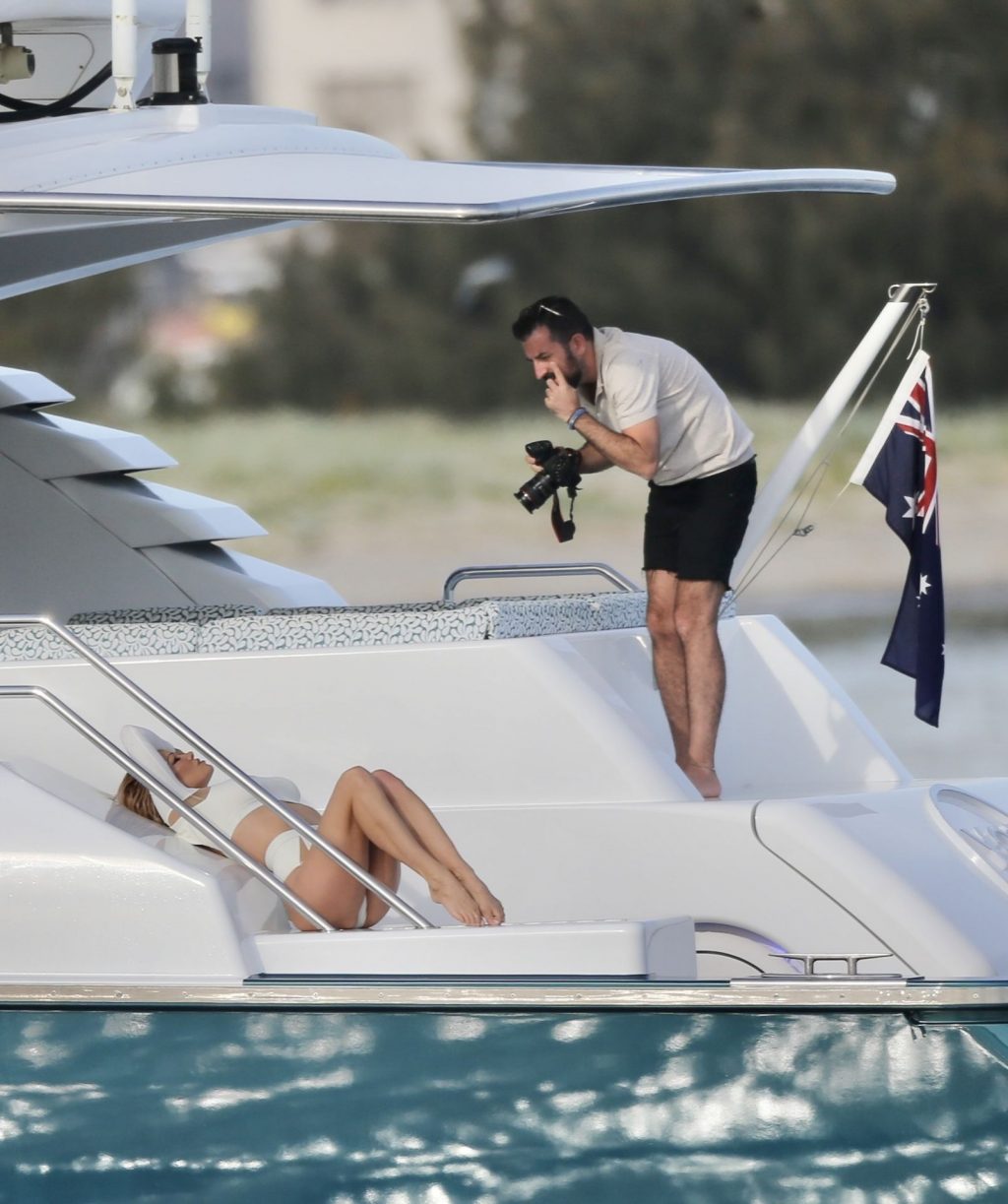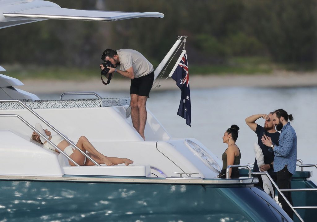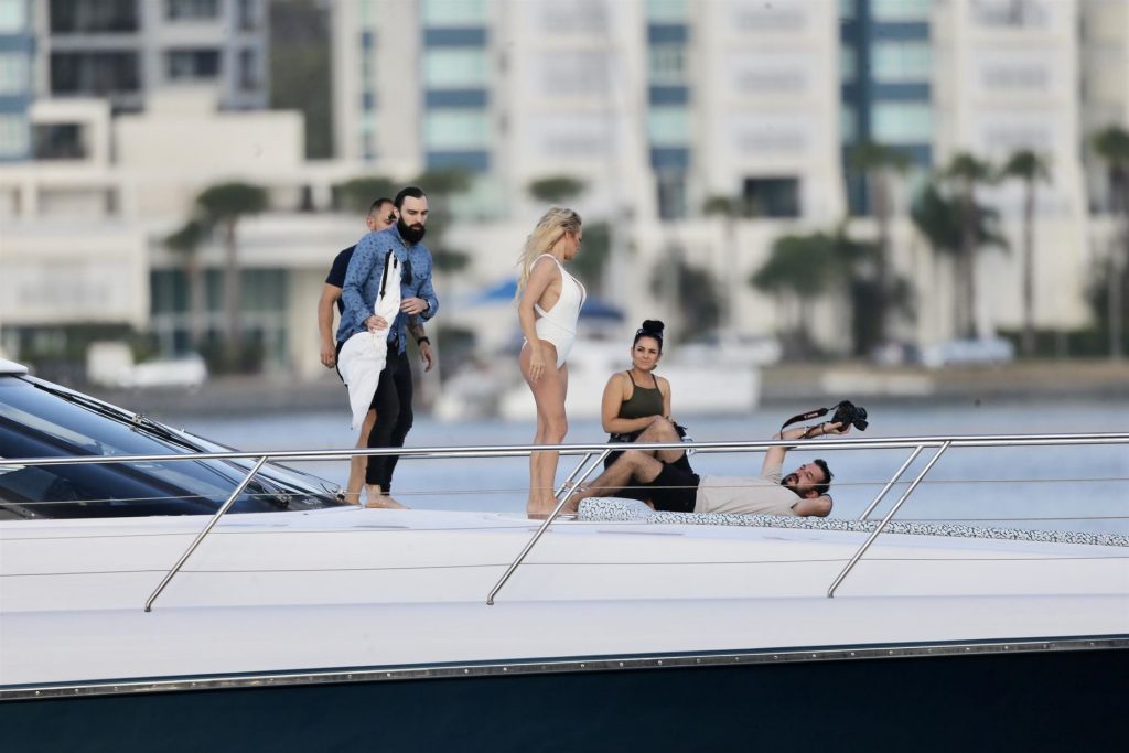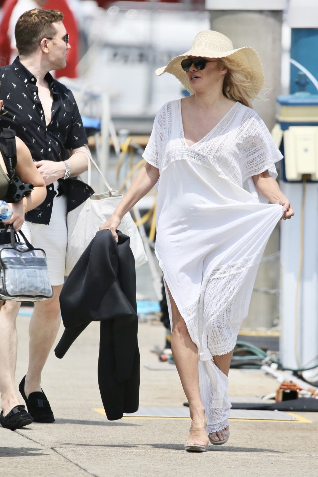Pamela Anderson con busto posa en un traje de baño blanco en un yate para una sesión de fotos en la Costa Dorada, Australia, 27/11/2019. Han pasado 30 años desde que se estrenó “Baywatch”, pero Pamela todavía se asocia con la valiente y atractiva salvavidas C.J. Parker. ¡La abuela del Fappening luce bien hoy!